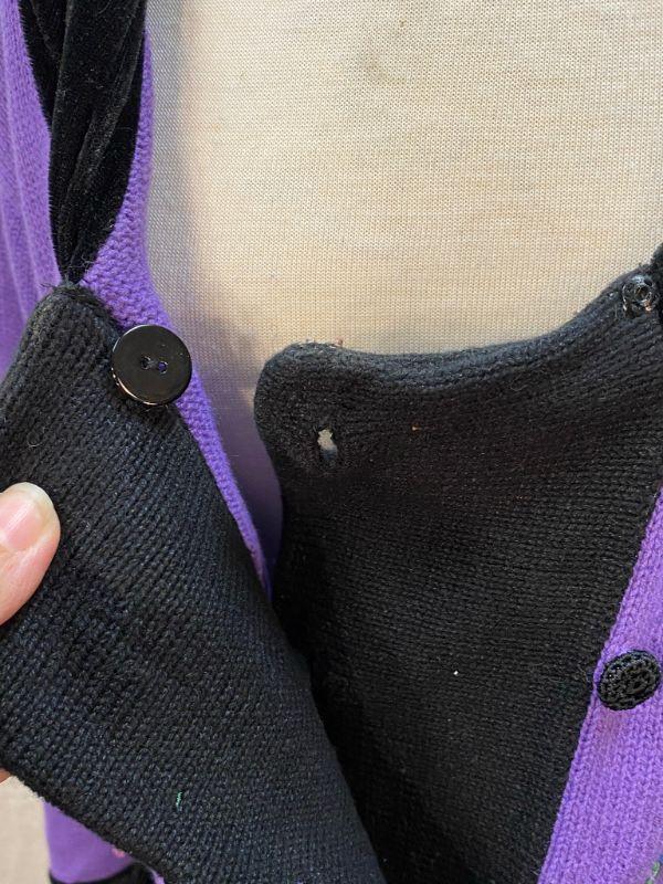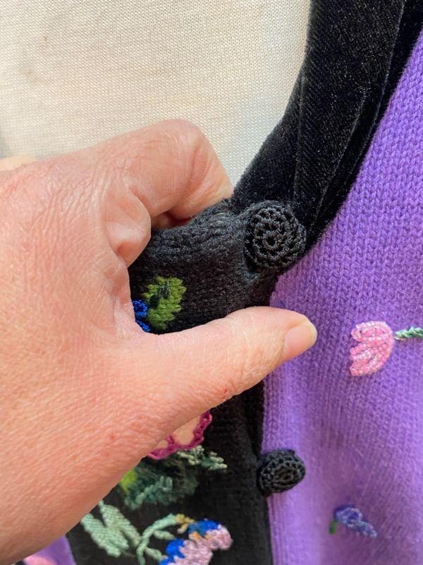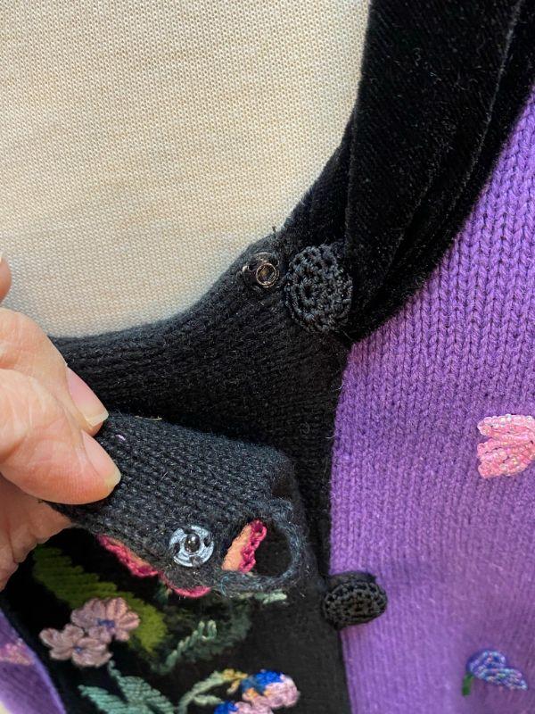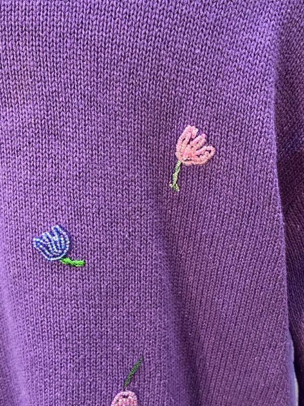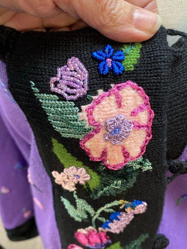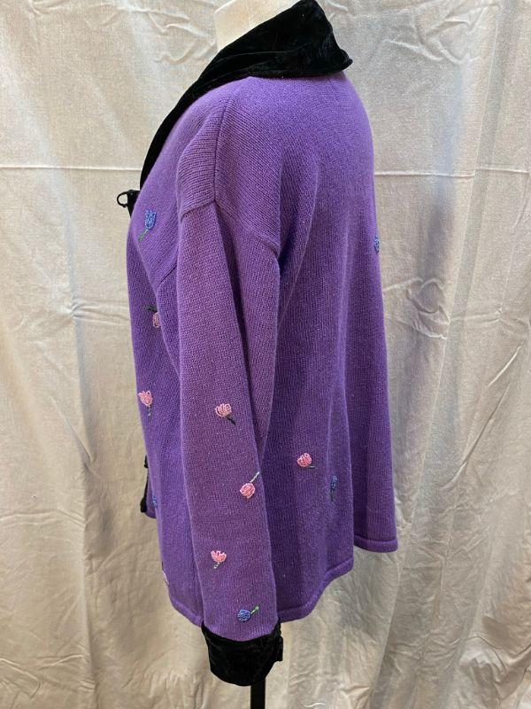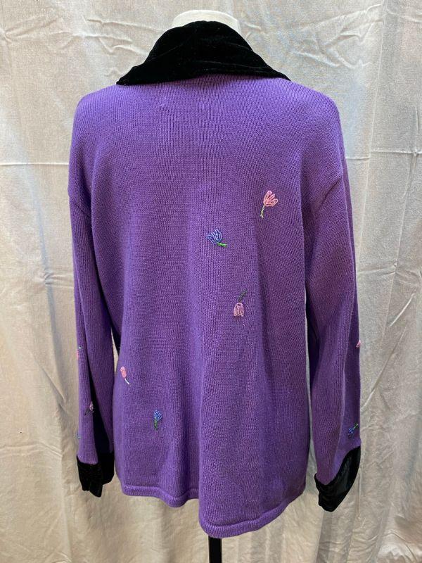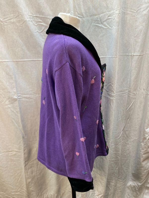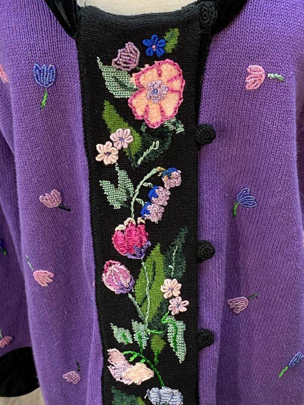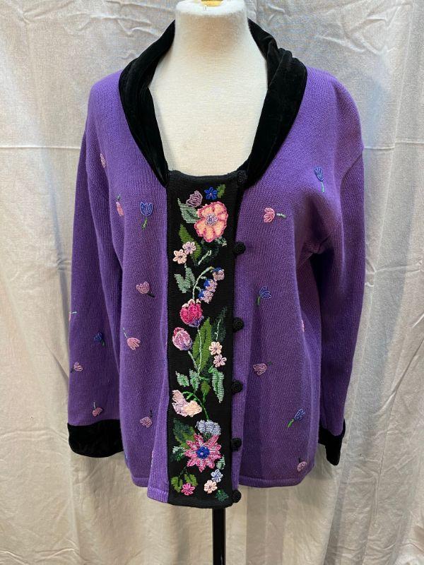 Storybook Knits purple sweater. Floral embroidery with bead embellishment. Inside and outside button up front. Size large. Good condition.