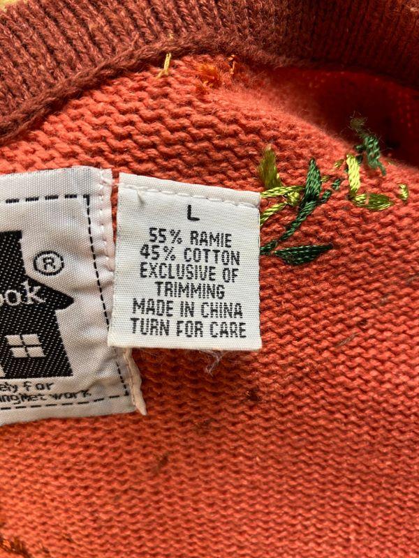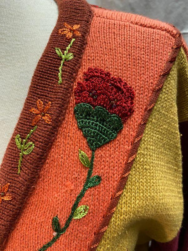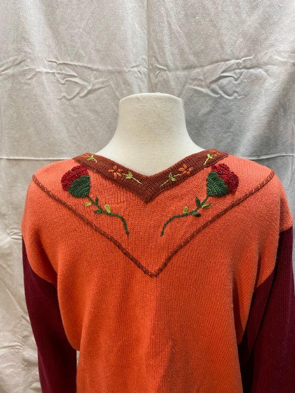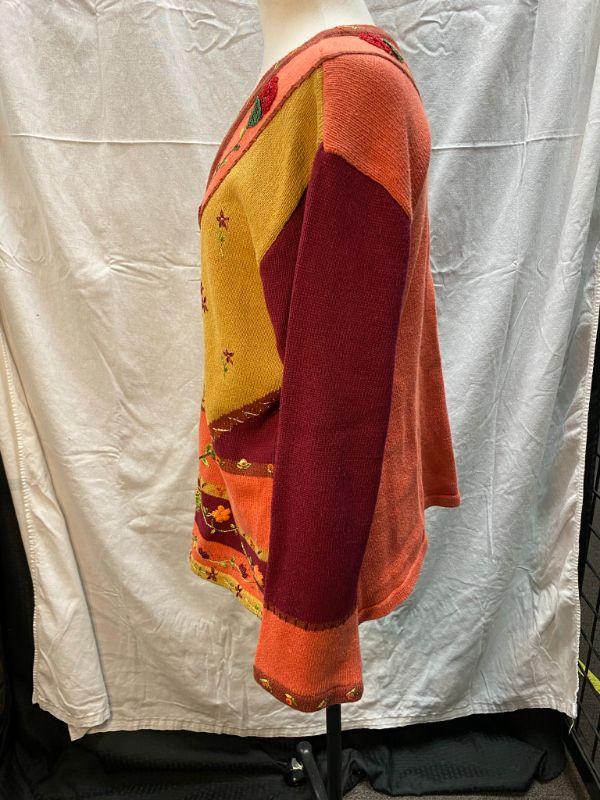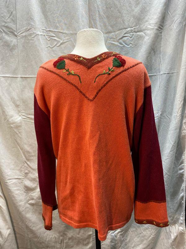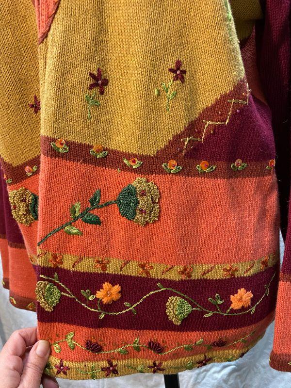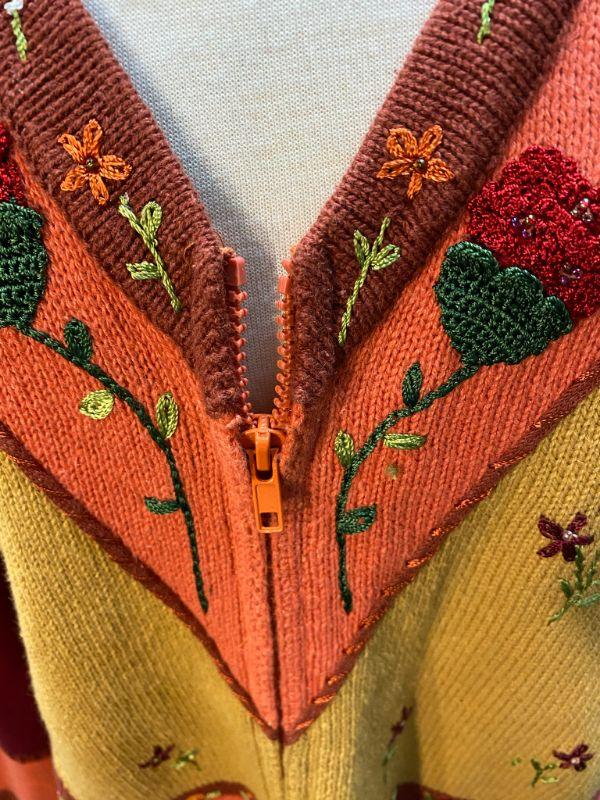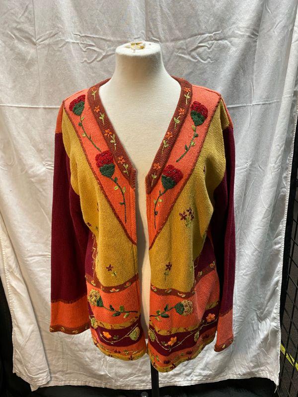 Storybook Knits zip front sweater. Made exclusively for the Home Shopping Network. Shades of red, orange, and yellow with embroidered flower pattern. Size Large. Good Condition.