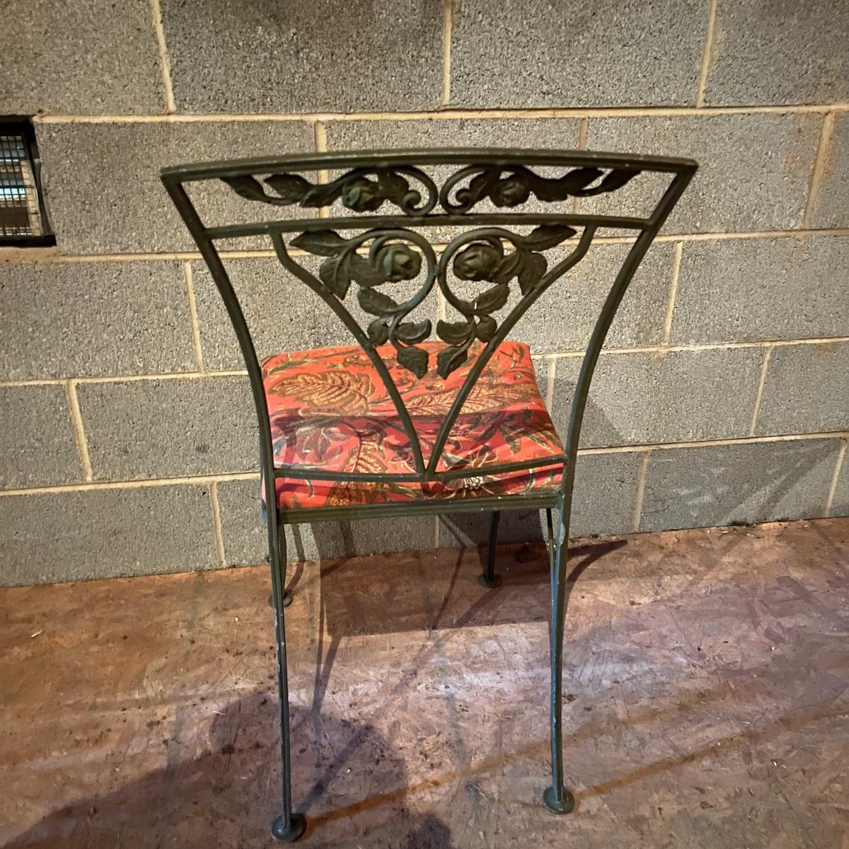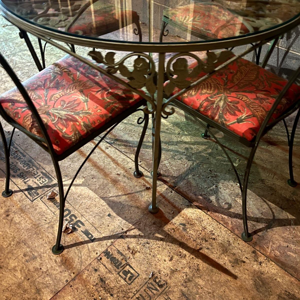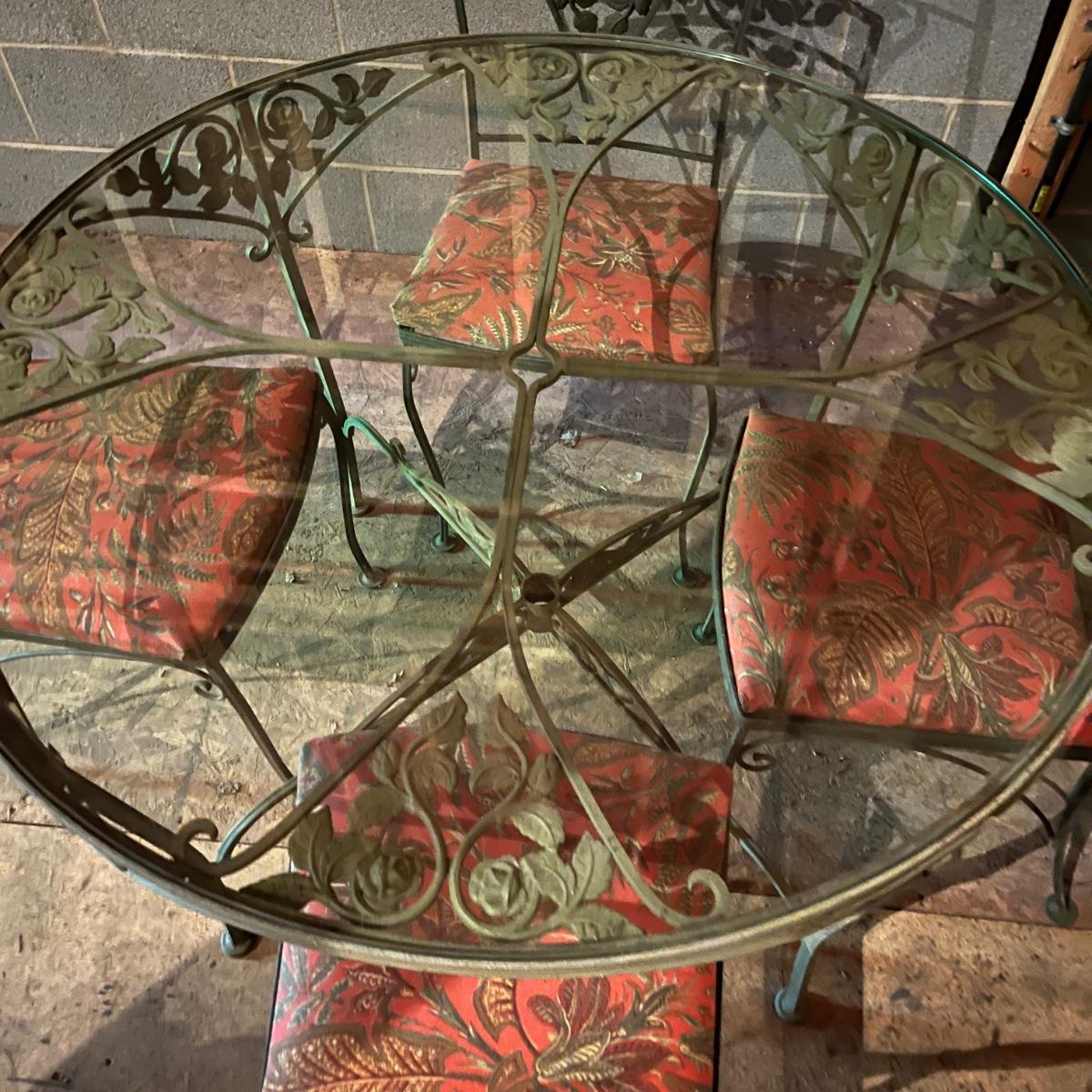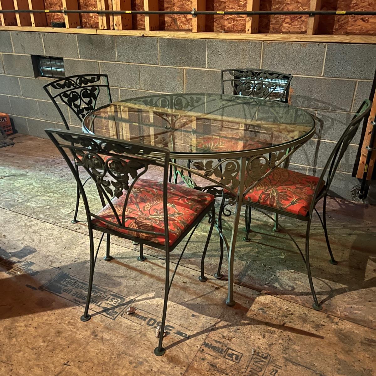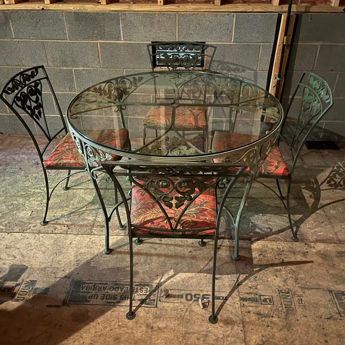 Lot contains a heavy wrought iron patio set that includes table with removable glass top, four chairs with removable padded and upholstered seats. Table measures 42”D x 30”H and chairs measure 17” x 22” x 33.5”H with a 19” seat height.