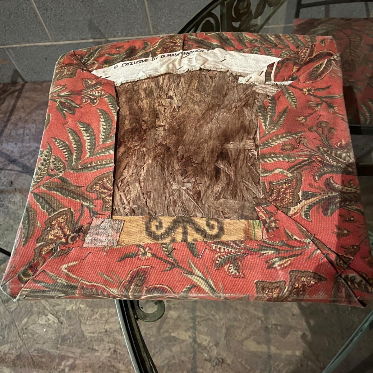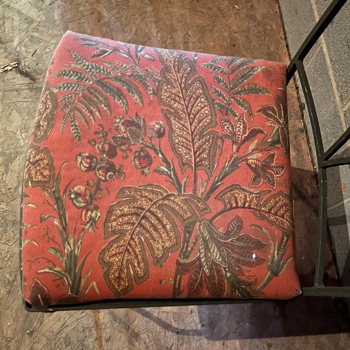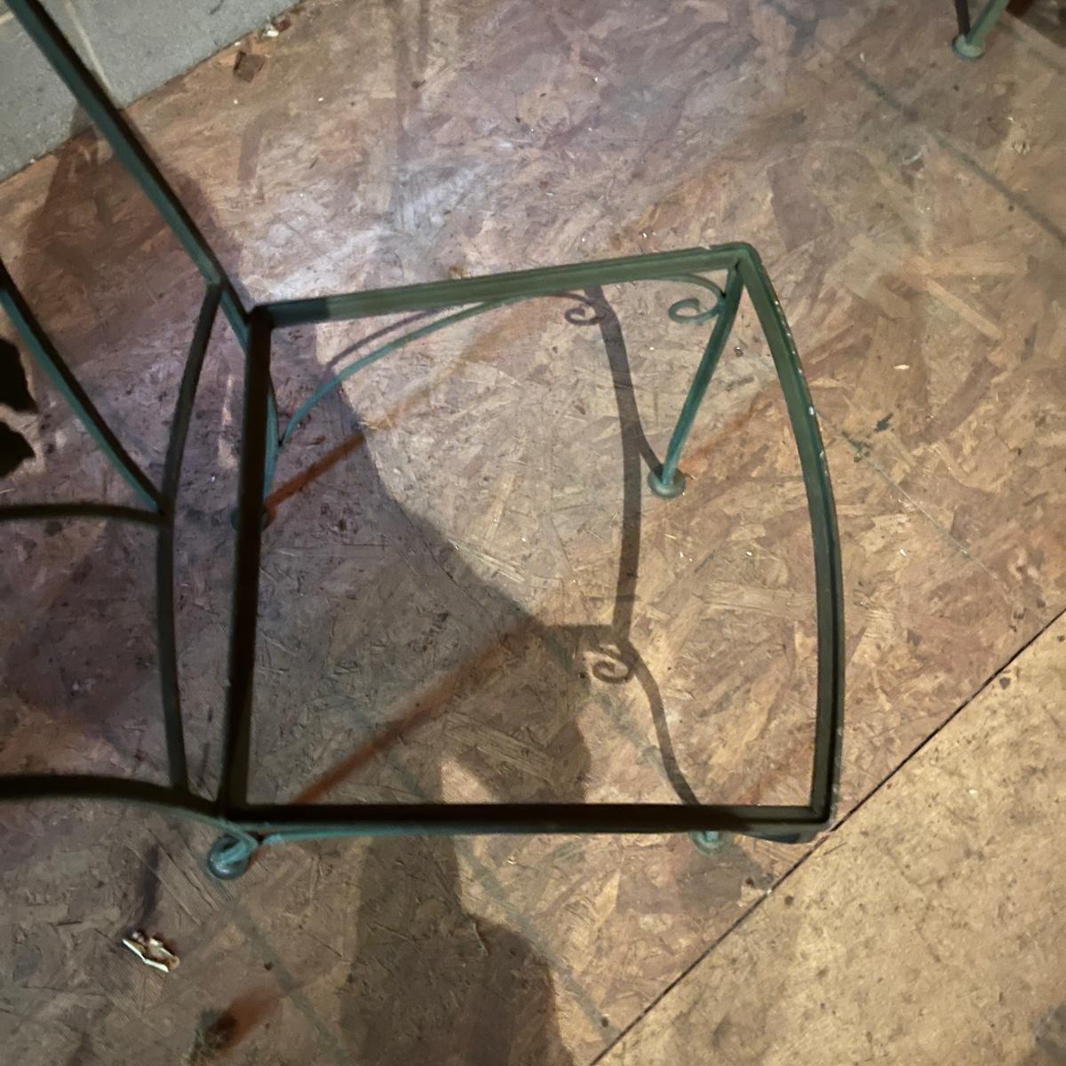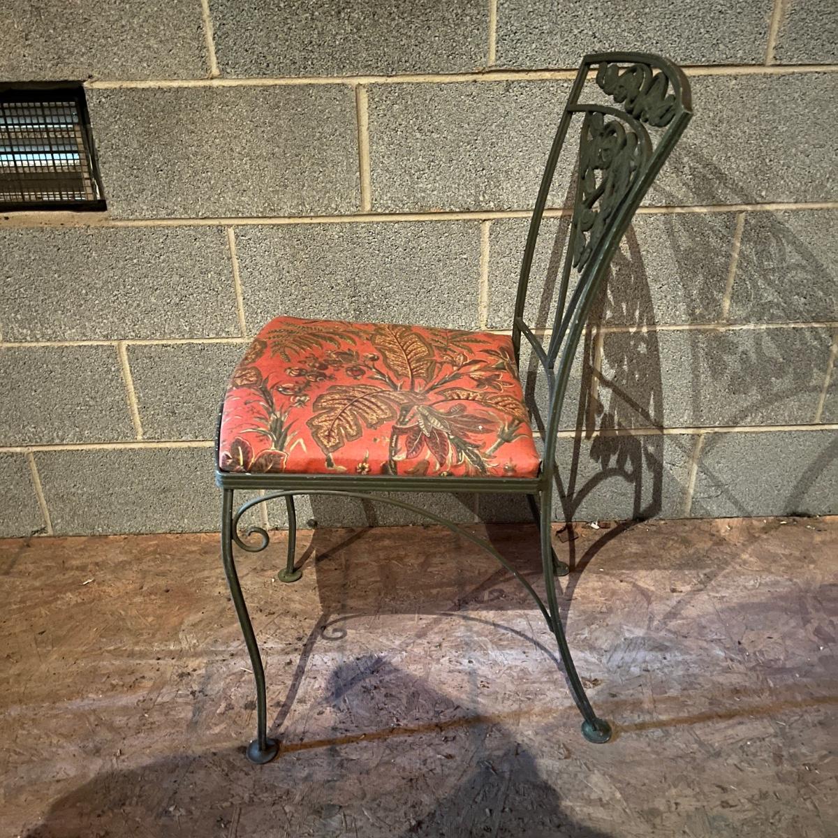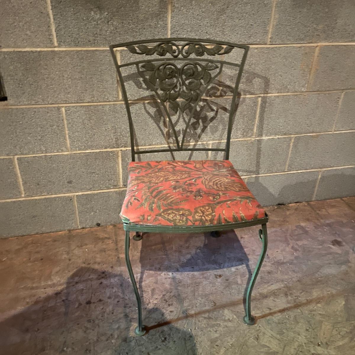 Lot contains a heavy wrought iron patio set that includes table with removable glass top, four chairs with removable padded and upholstered seats. Table measures 42”D x 30”H and chairs measure 17” x 22” x 33.5”H with a 19” seat height.
