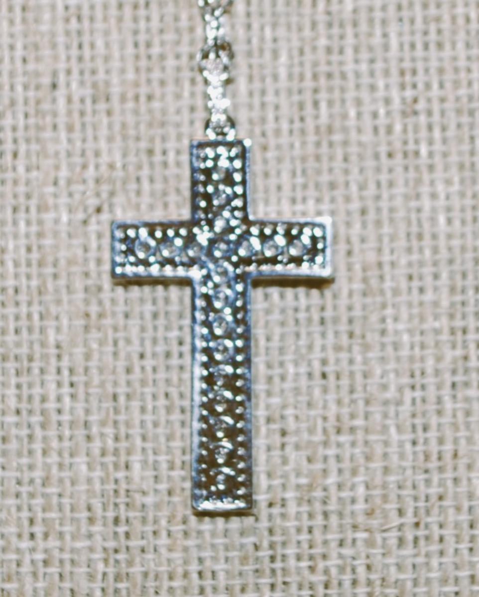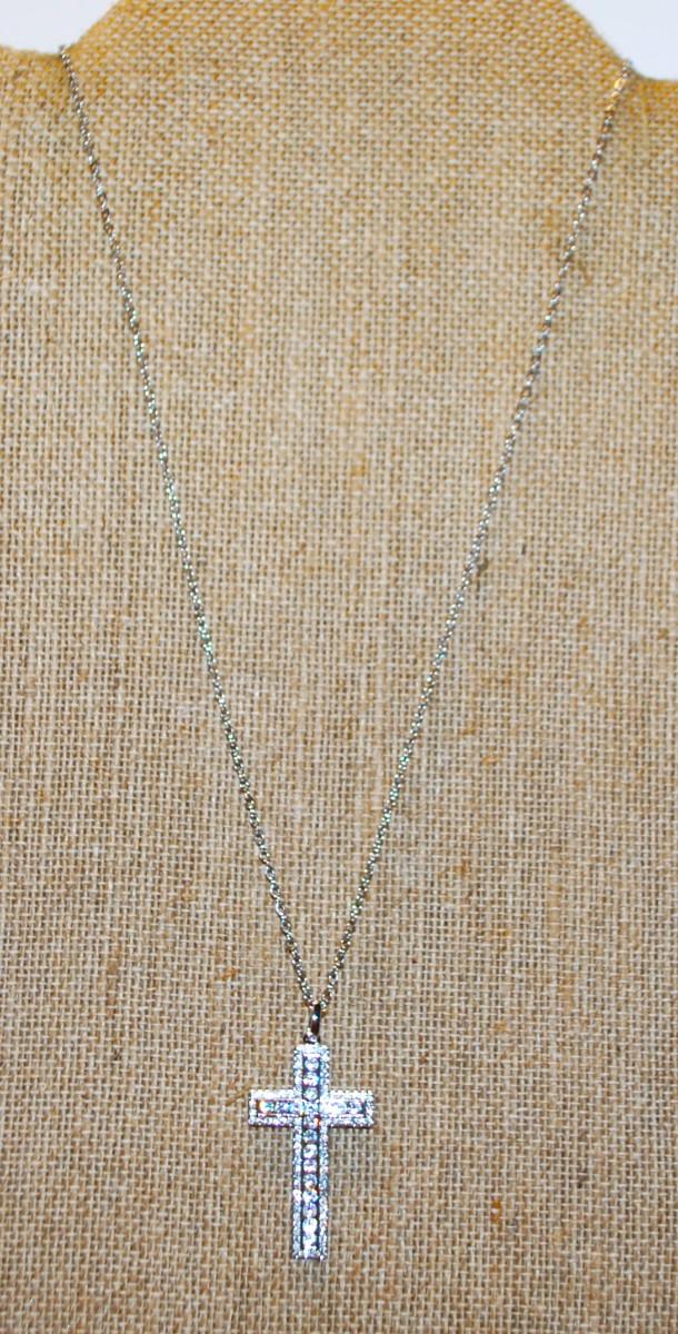 Straight Line Clear Stones Cross PENDANT (1½" x 1") on a Silver Tone Necklace Chain 18" L