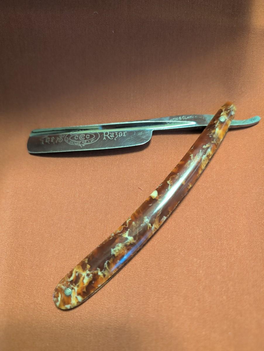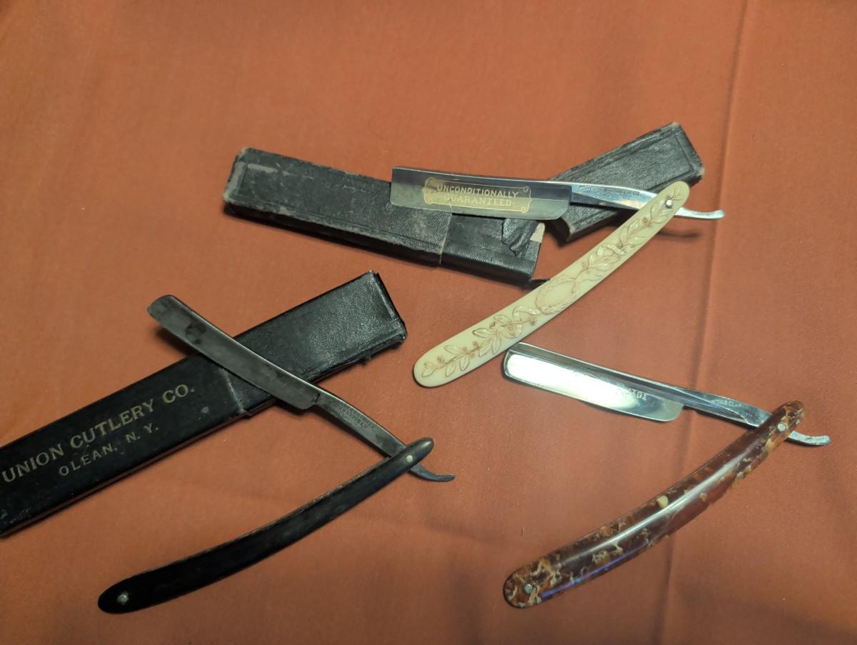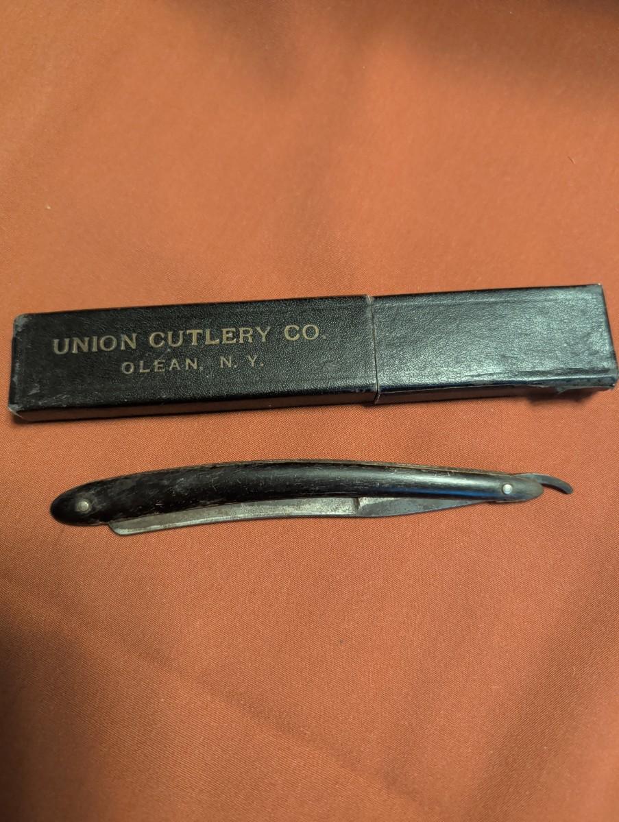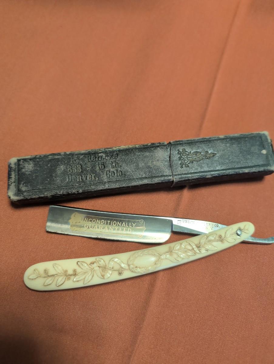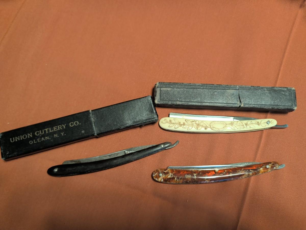 The celebrated razor Martin and Clark cutlery St. Joseph Missouri, no box, marble look to the handle. Union cutlery company Olean New York, Ivory look to the handle is plastic with box. R Reineke, Denver, CO, Wade and Butcher Sheffield. Not sure if the razor goes with that box.