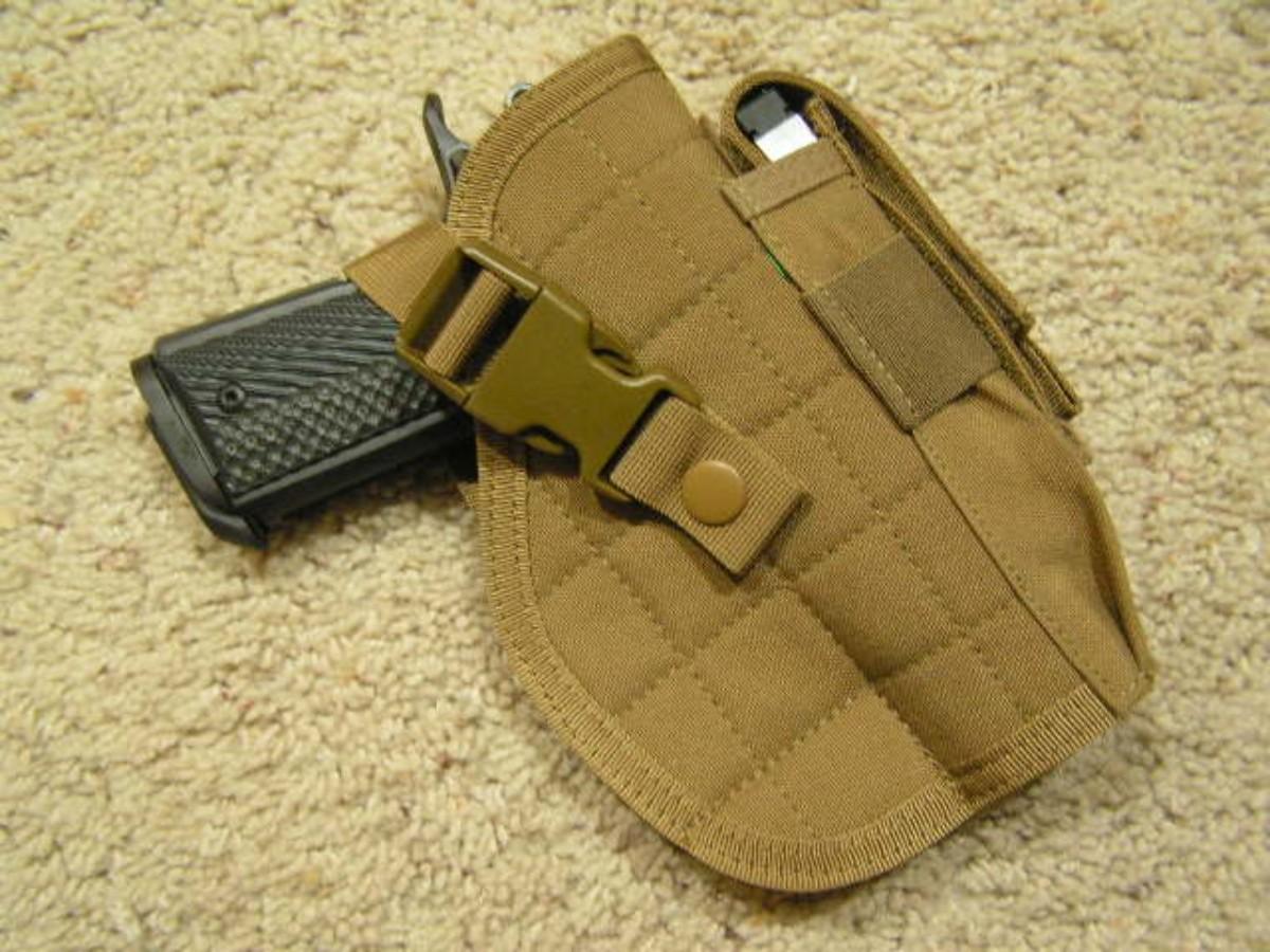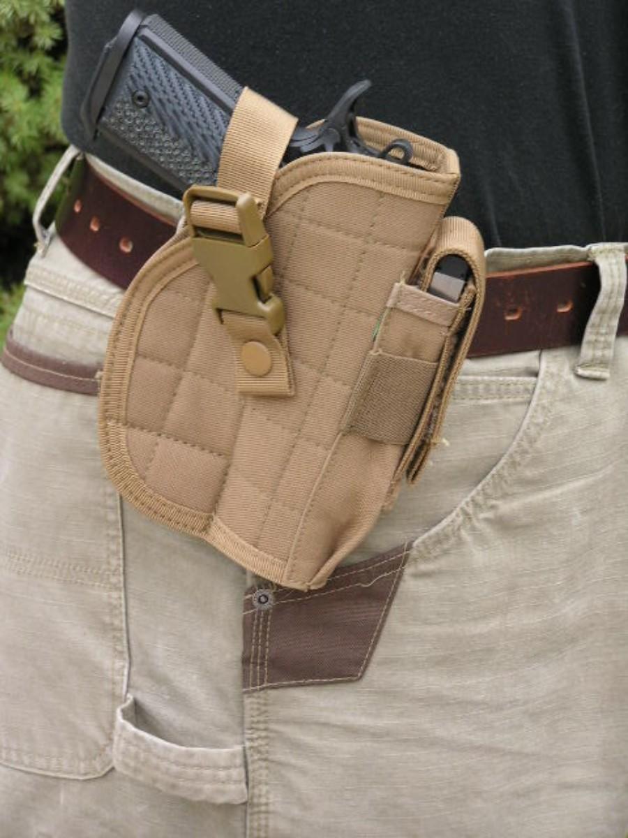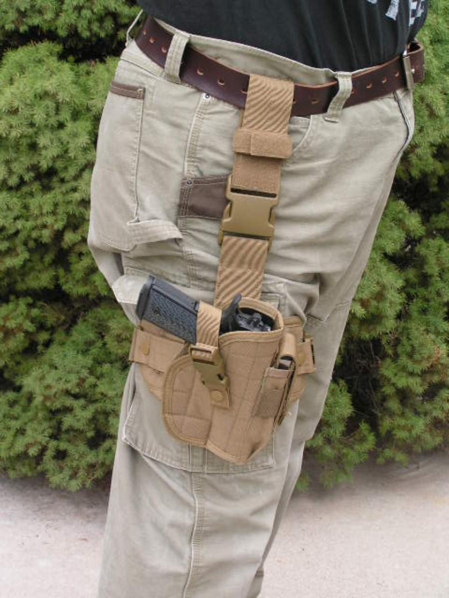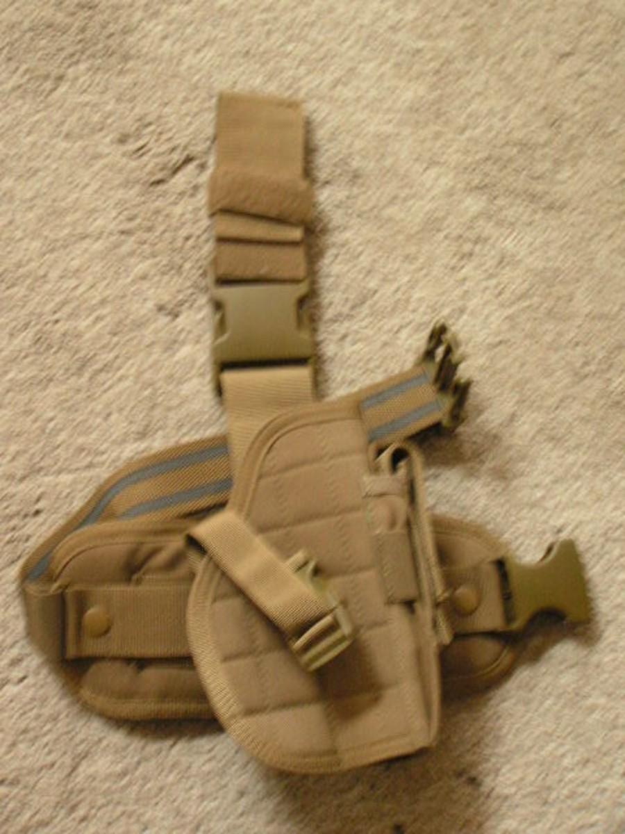 Leg or belt holster w/mag pouch, for full size pistol. Padded. Adaptable with velcro & buckles. Fully adjustable, non-marring fabric (not plastic) . Desert tan. Gun & mag for display only - NOT included,