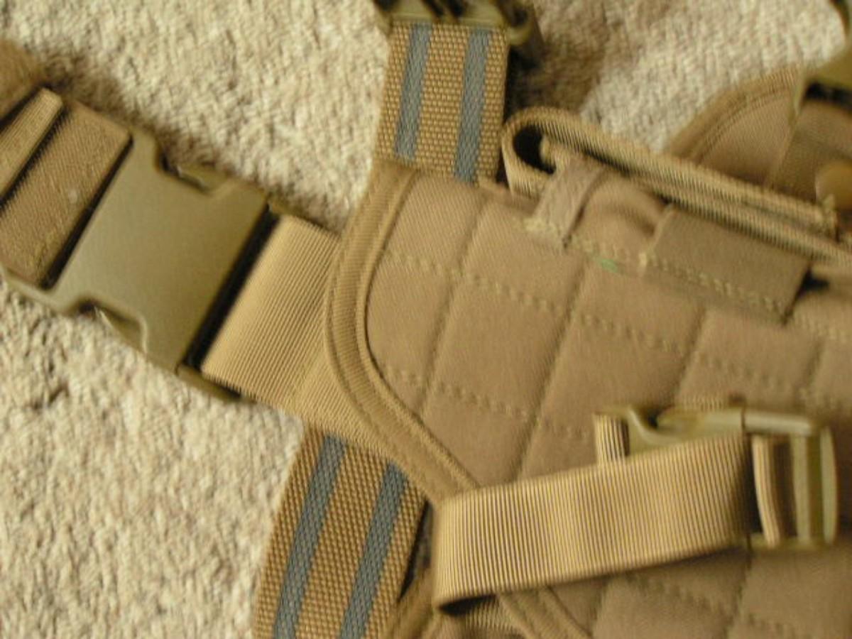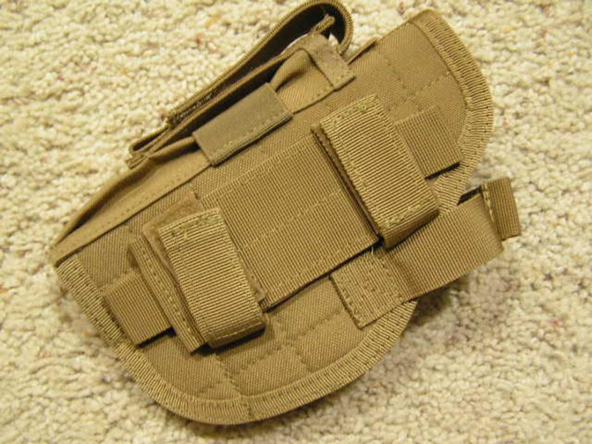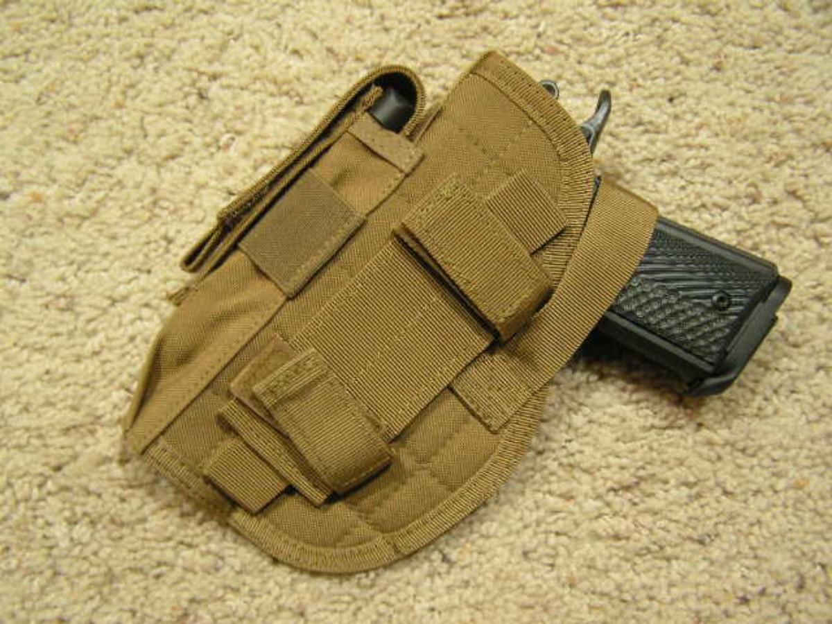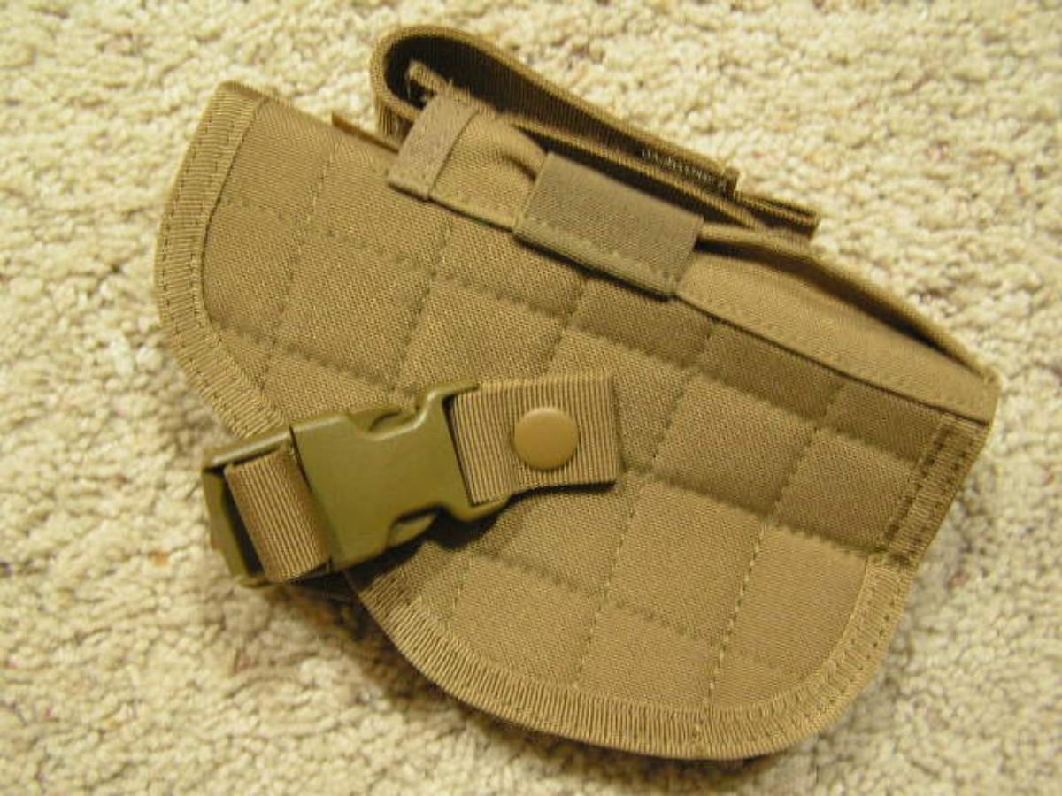 Leg or belt holster w/mag pouch, for full size pistol. Padded. Adaptable with velcro & buckles. Fully adjustable, non-marring fabric (not plastic) . Desert tan. Gun & mag for display only - NOT included,