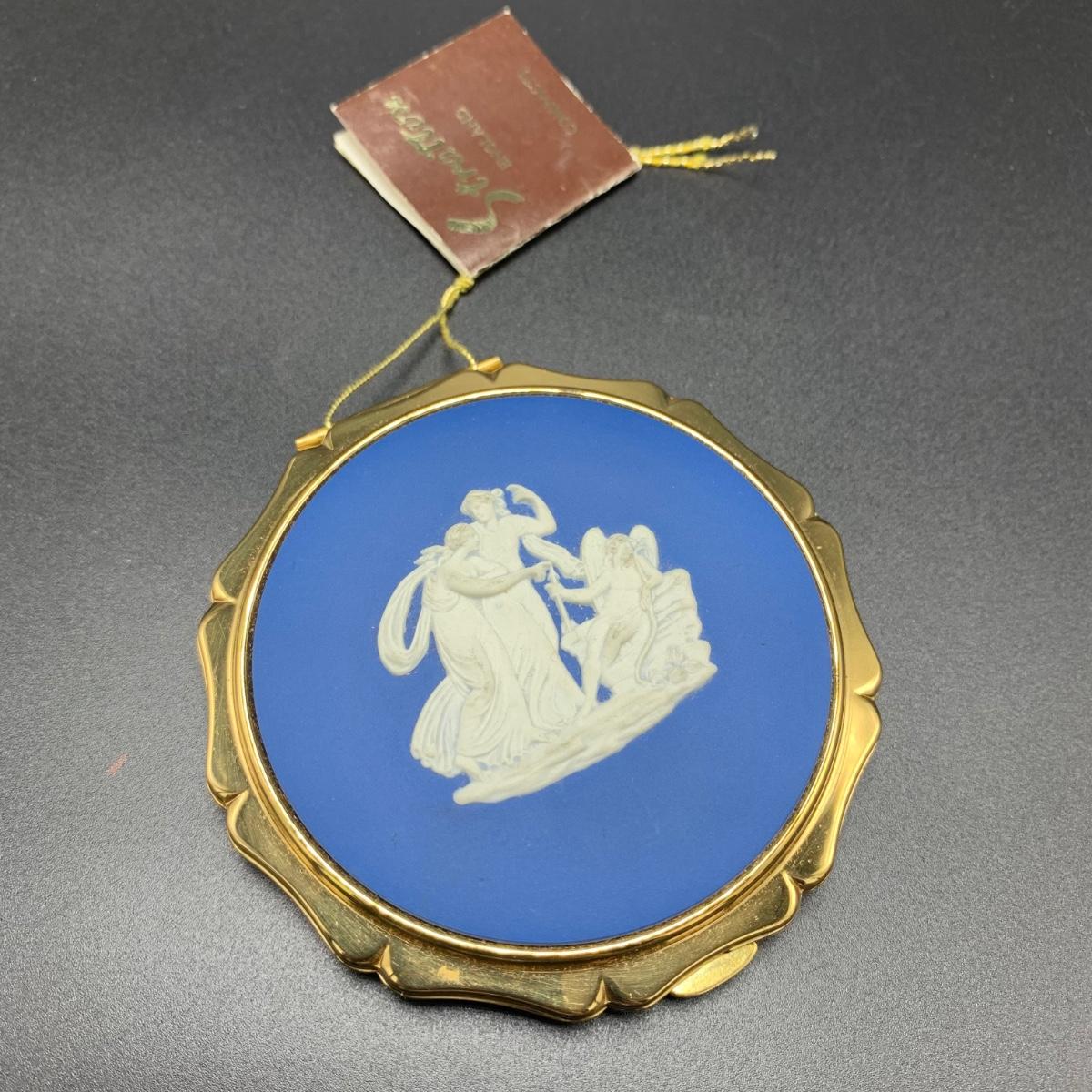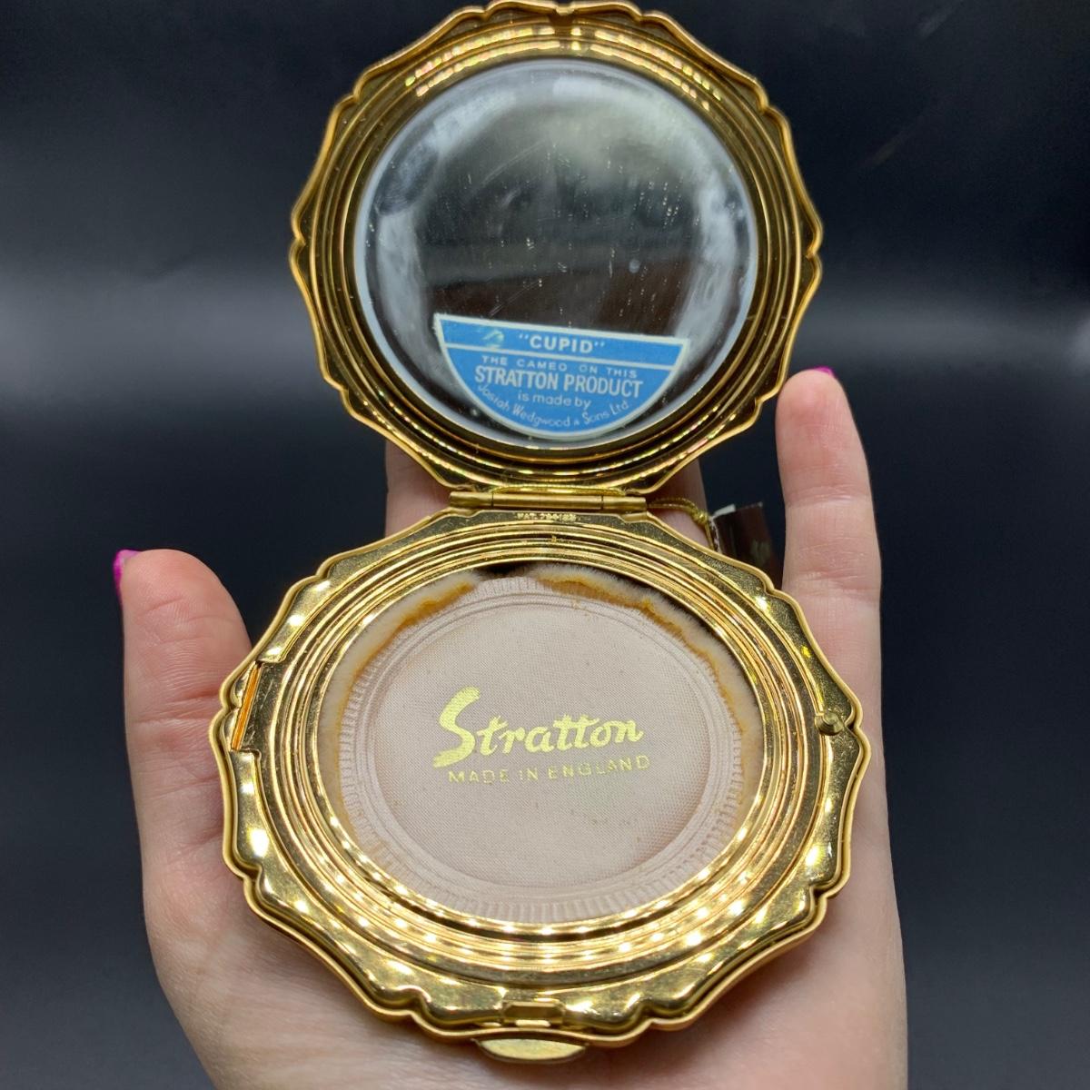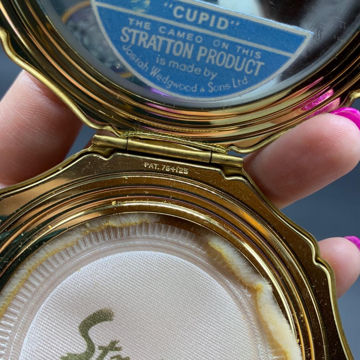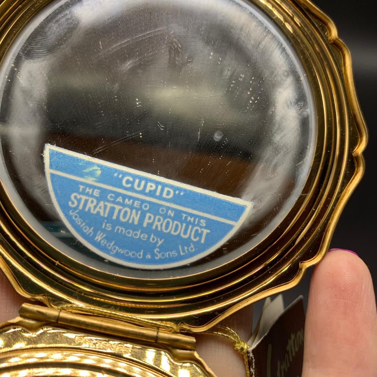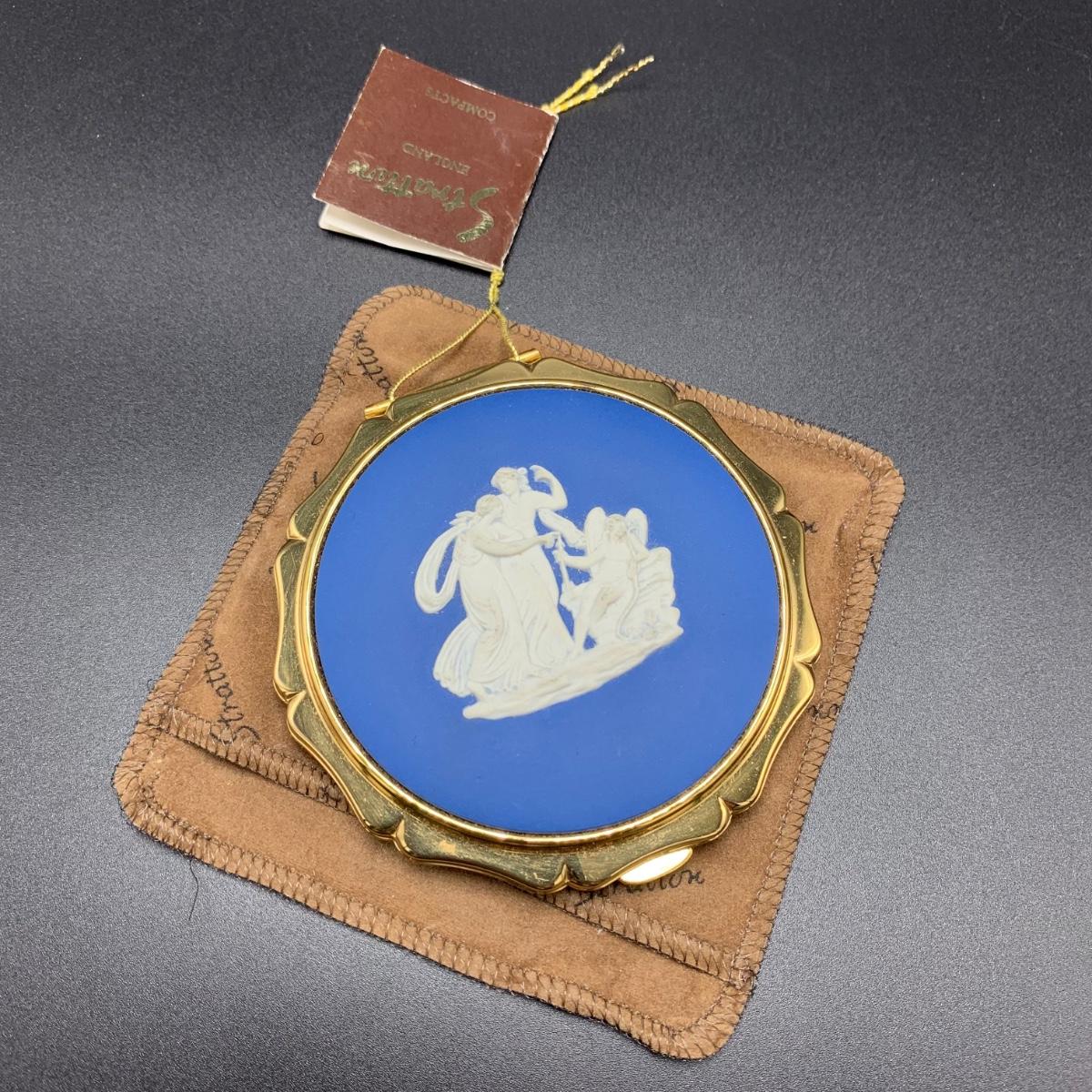 Stratton England compact with its tag still attached. Comes in a soft protective pouchette. The cameo design on the front of the compact is “Cupid” made my Josiah Wedgwood and Sons. The original powder puff is in the compact but has started to deteriorate. Shipping available.
