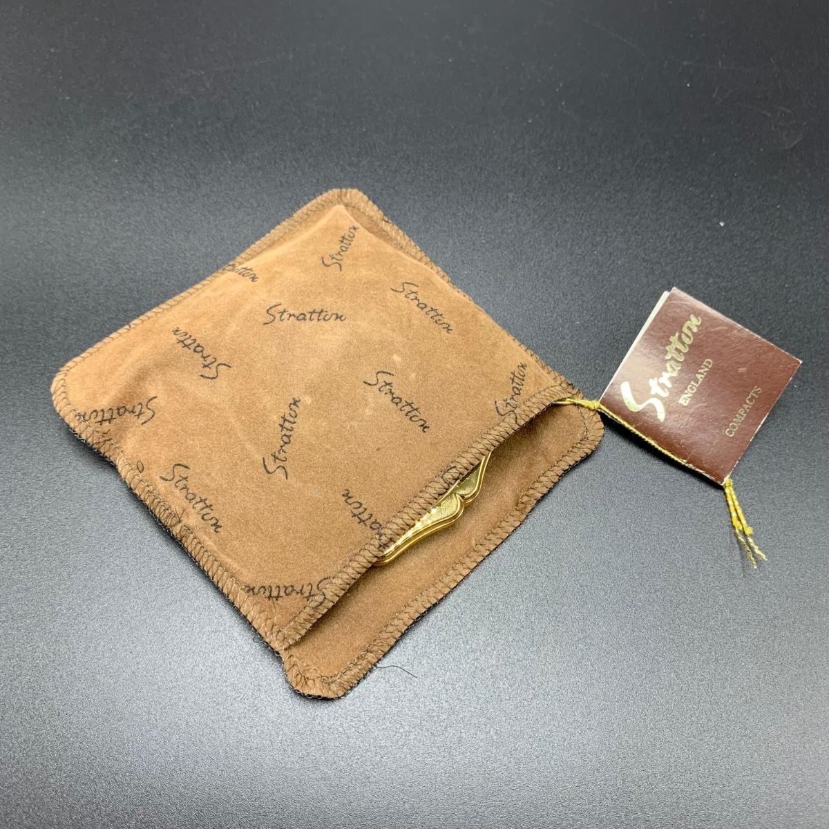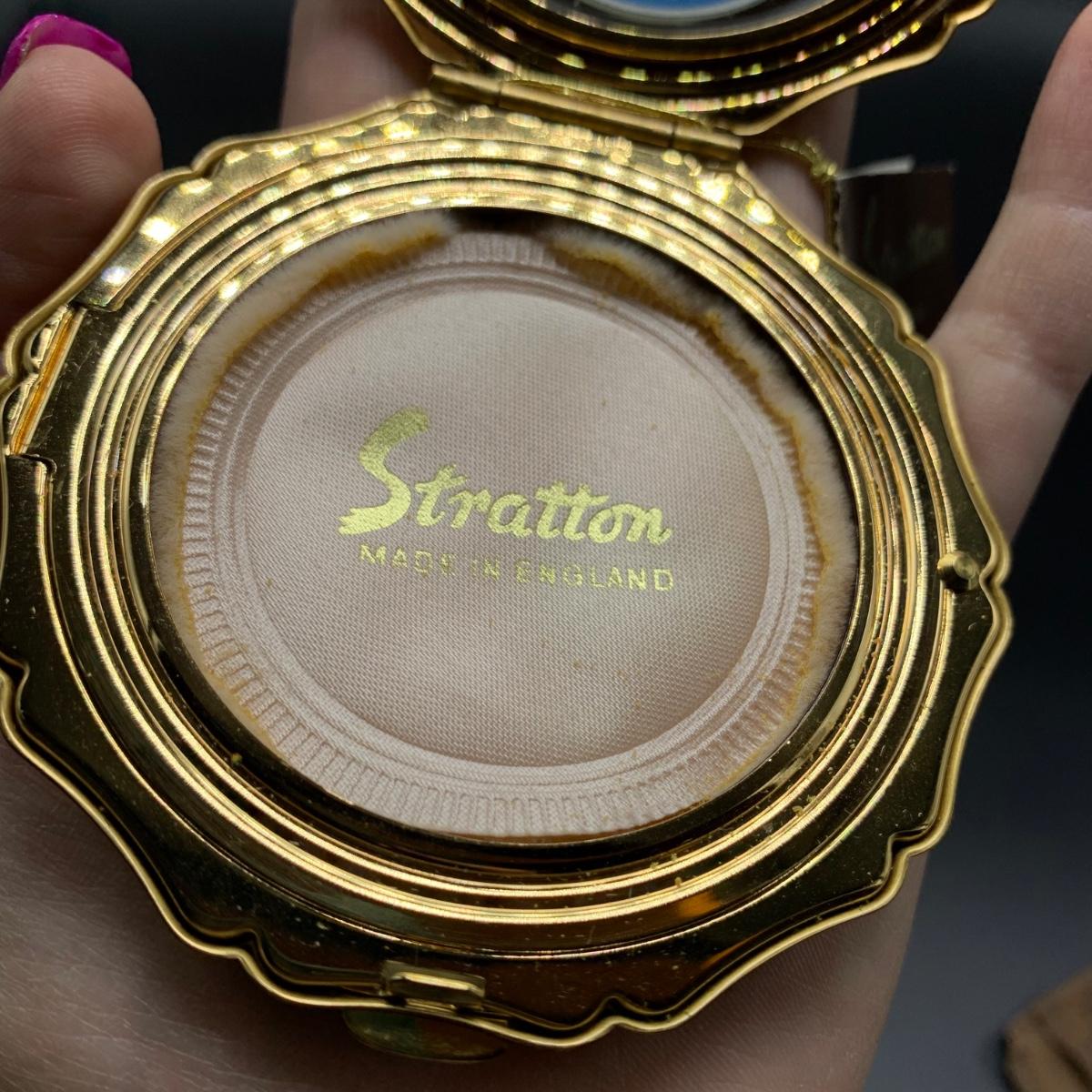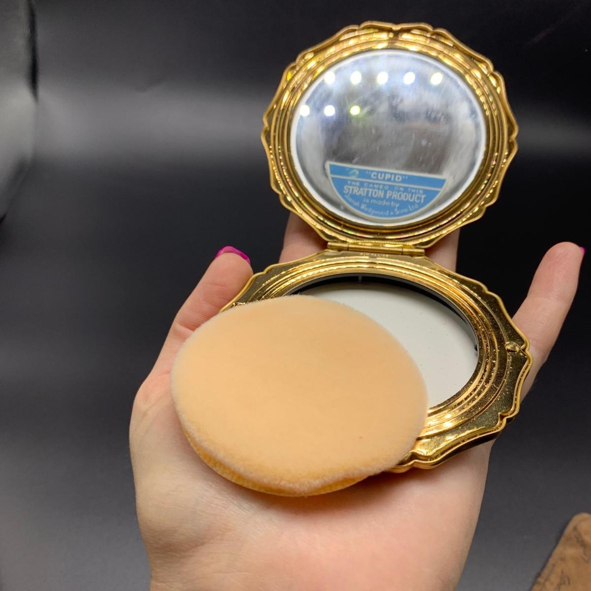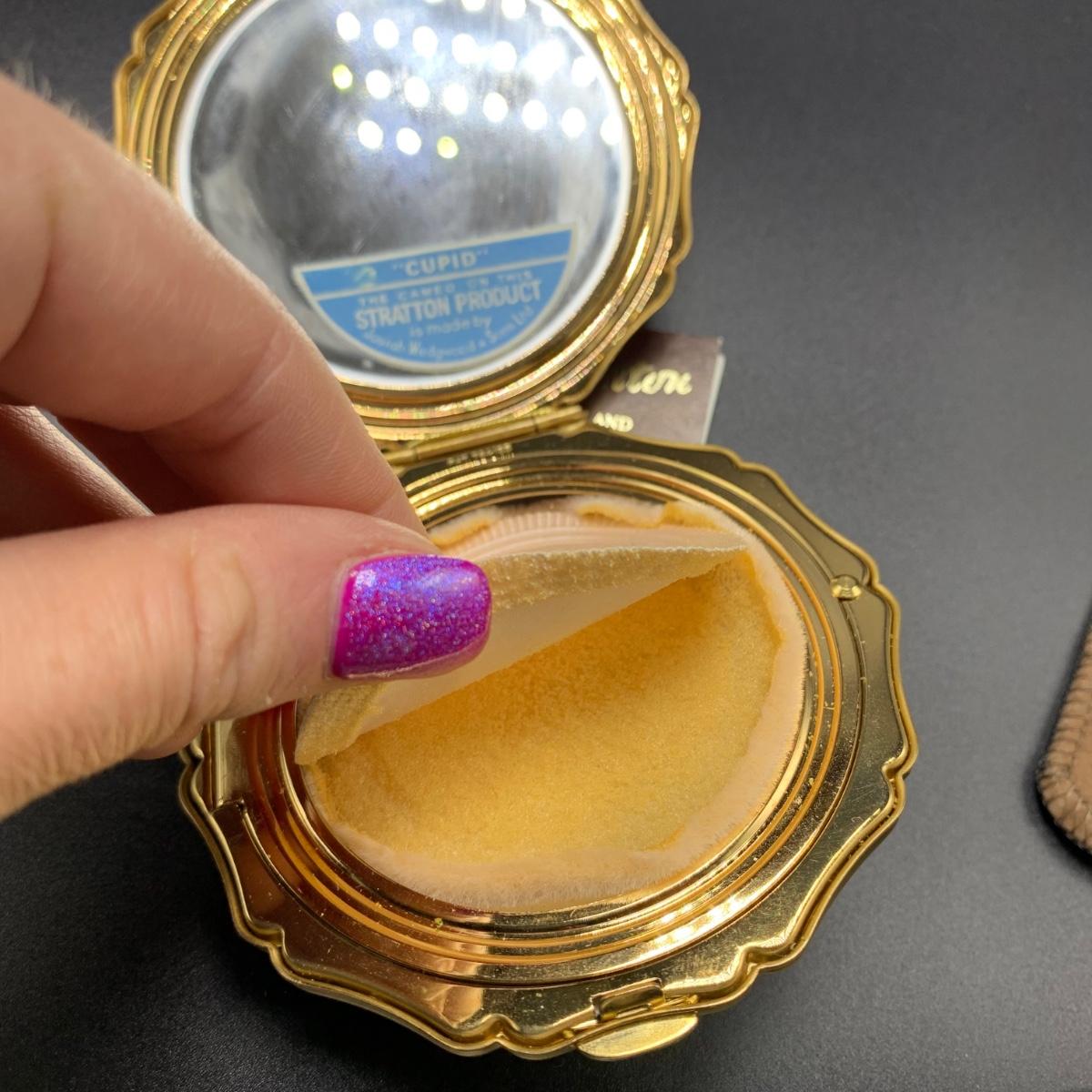 Stratton England compact with its tag still attached. Comes in a soft protective pouchette. The cameo design on the front of the compact is “Cupid” made my Josiah Wedgwood and Sons. The original powder puff is in the compact but has started to deteriorate. Shipping available.