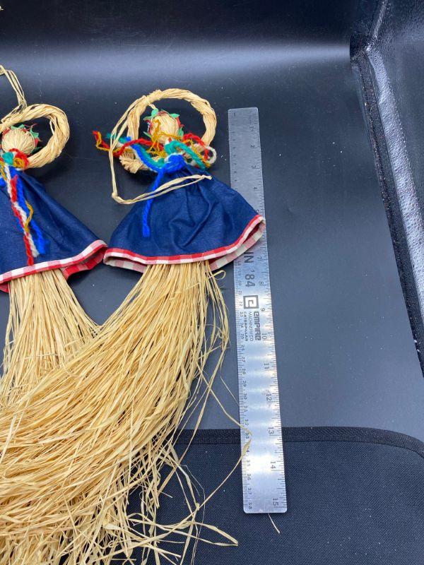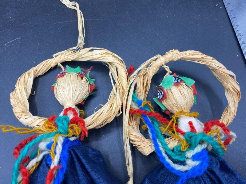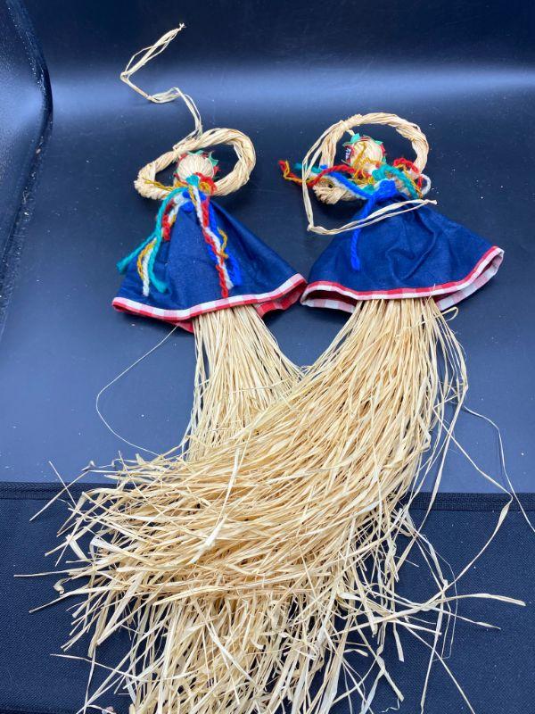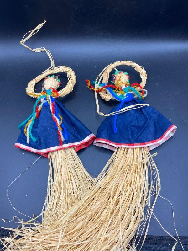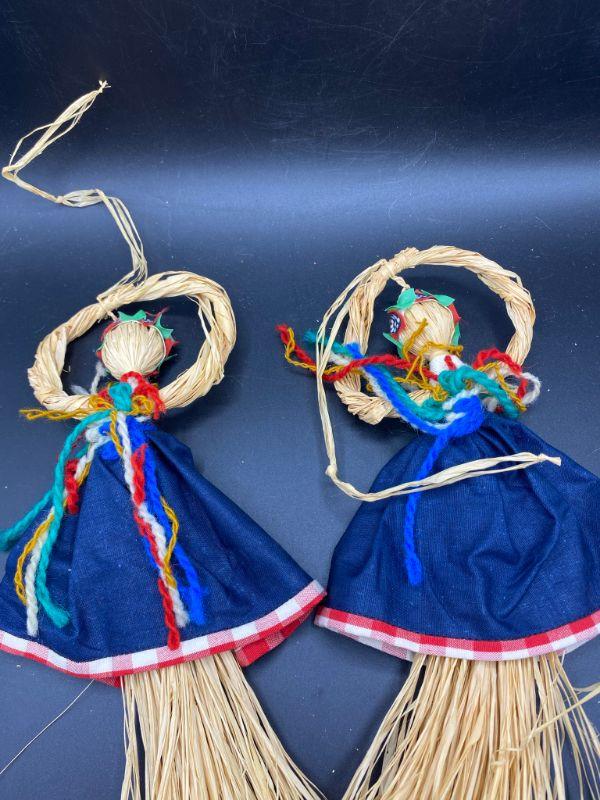 Pair of straw hanging angel figures. Colorful dresses. Long whispy straw.
