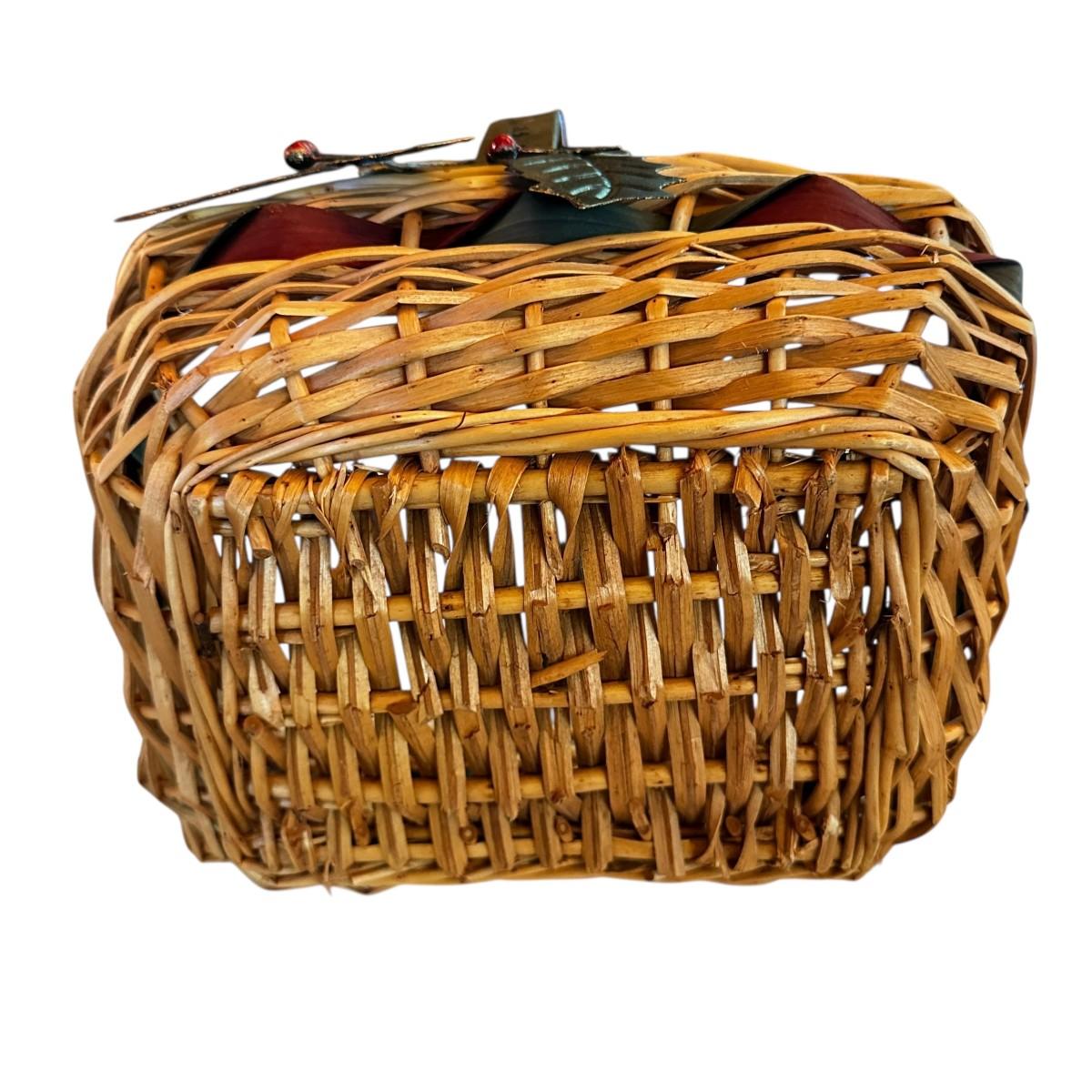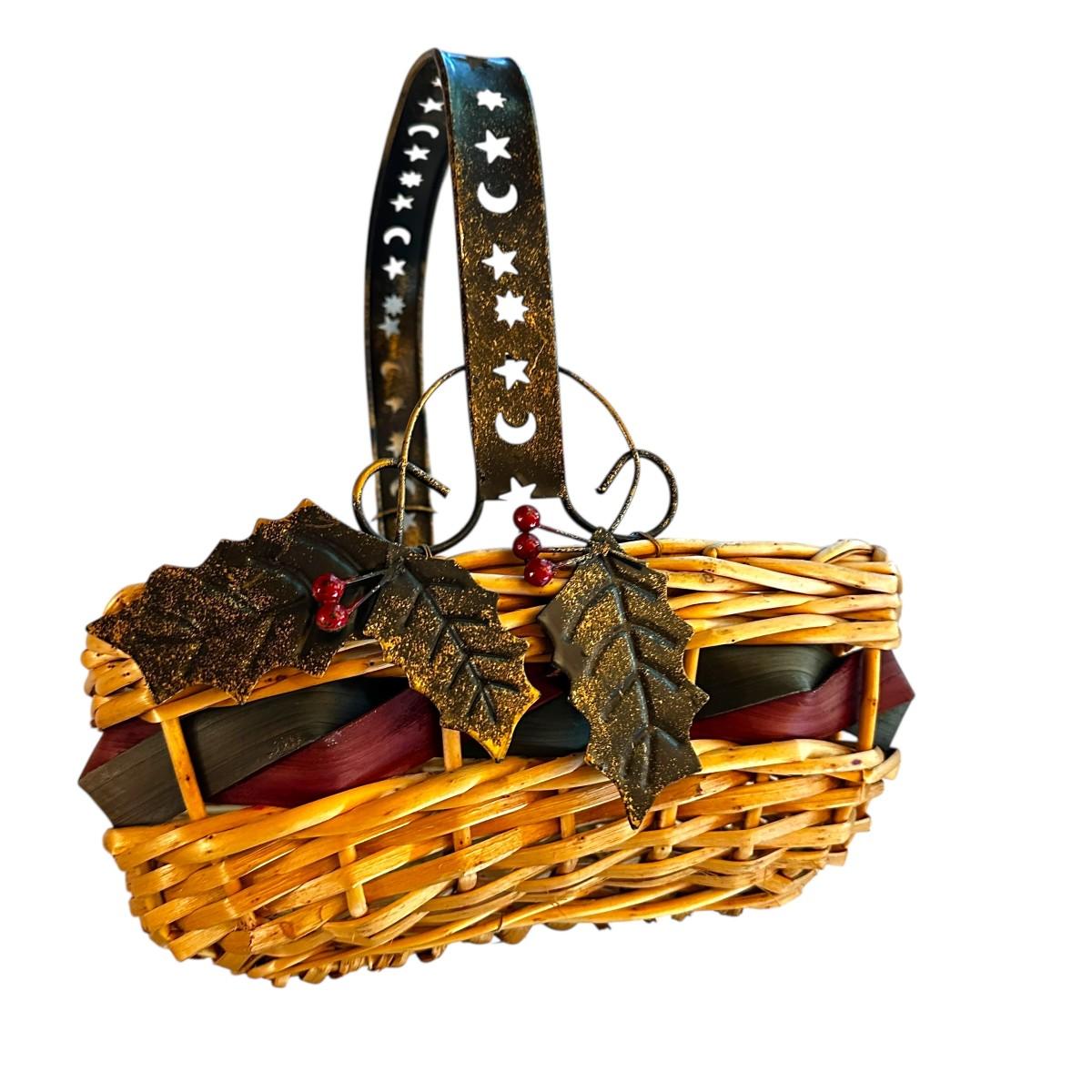 Straw Basket with Metal Handle & Leaves & Kitchen Towel