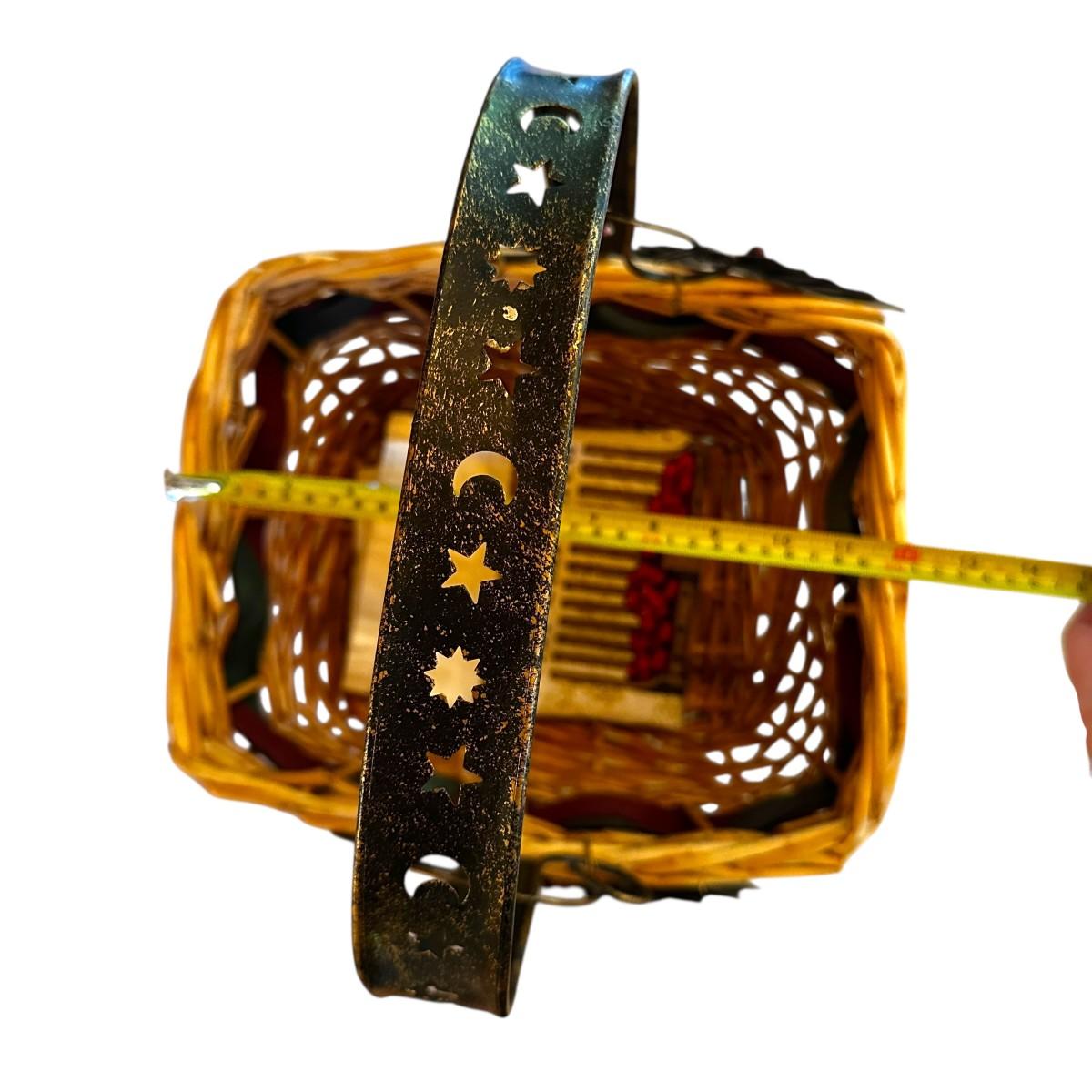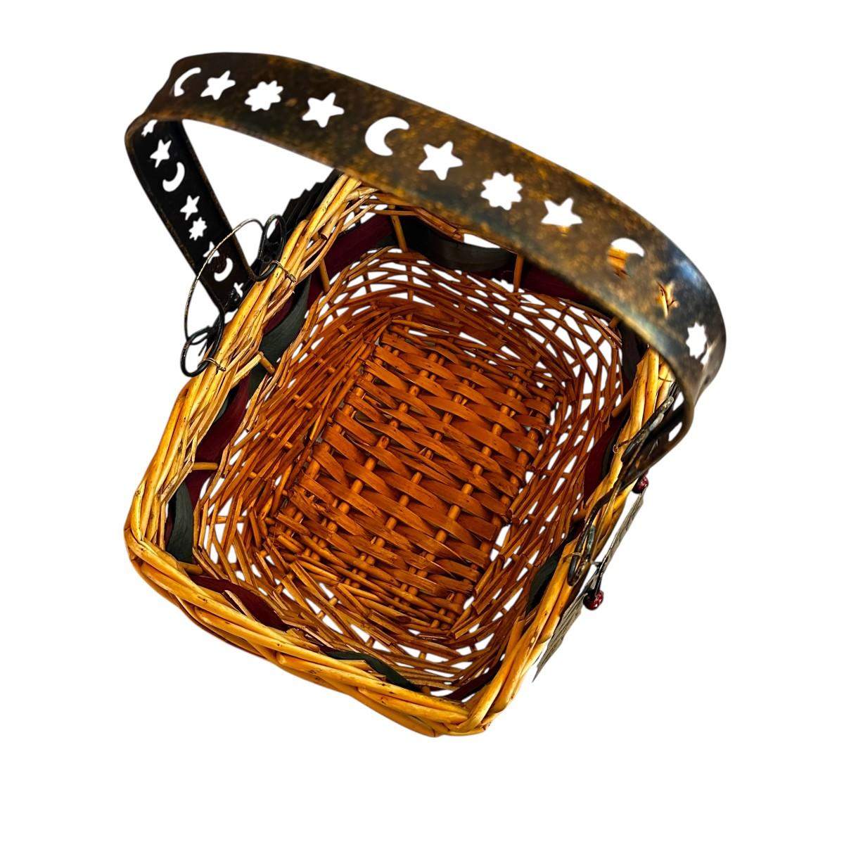 Straw Basket with Metal Handle & Leaves 12" long x 14" tall- great shape +Kitchen Towel