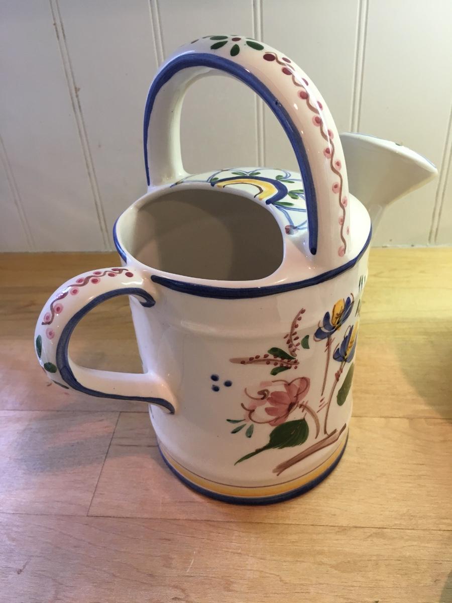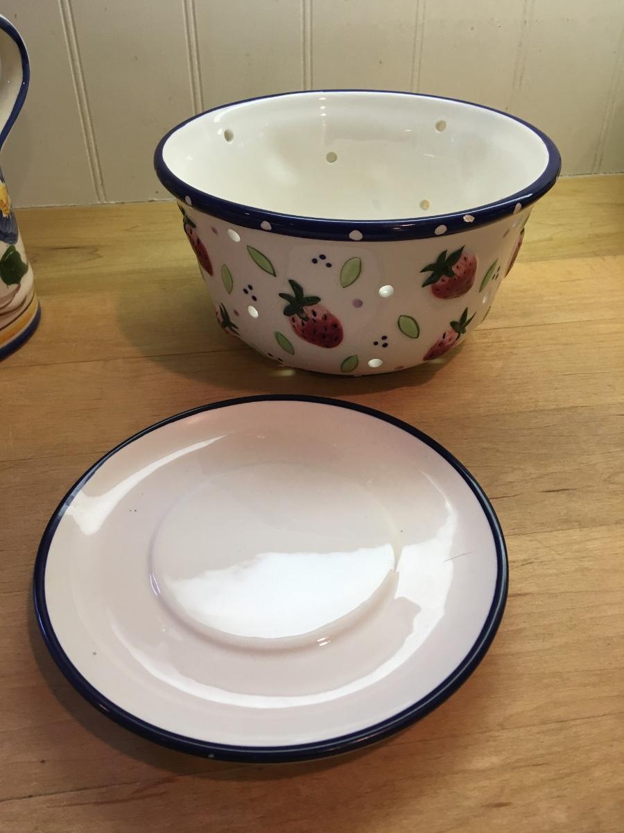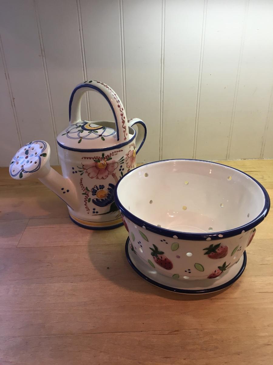 Ceramic strawberry bowl for rinsing berries and ceramic pitcher (made in Portugal) watering plants or use as a vase for flowers!