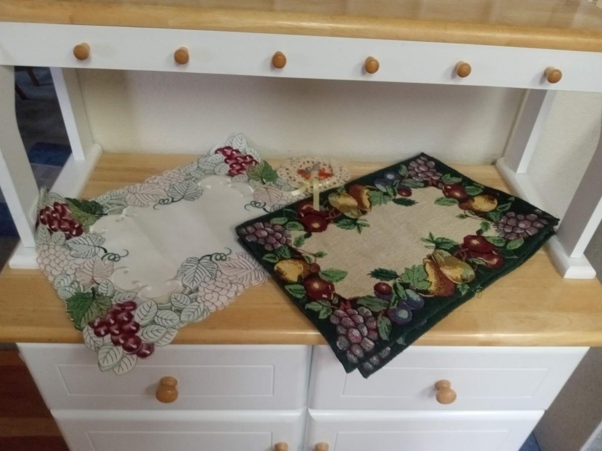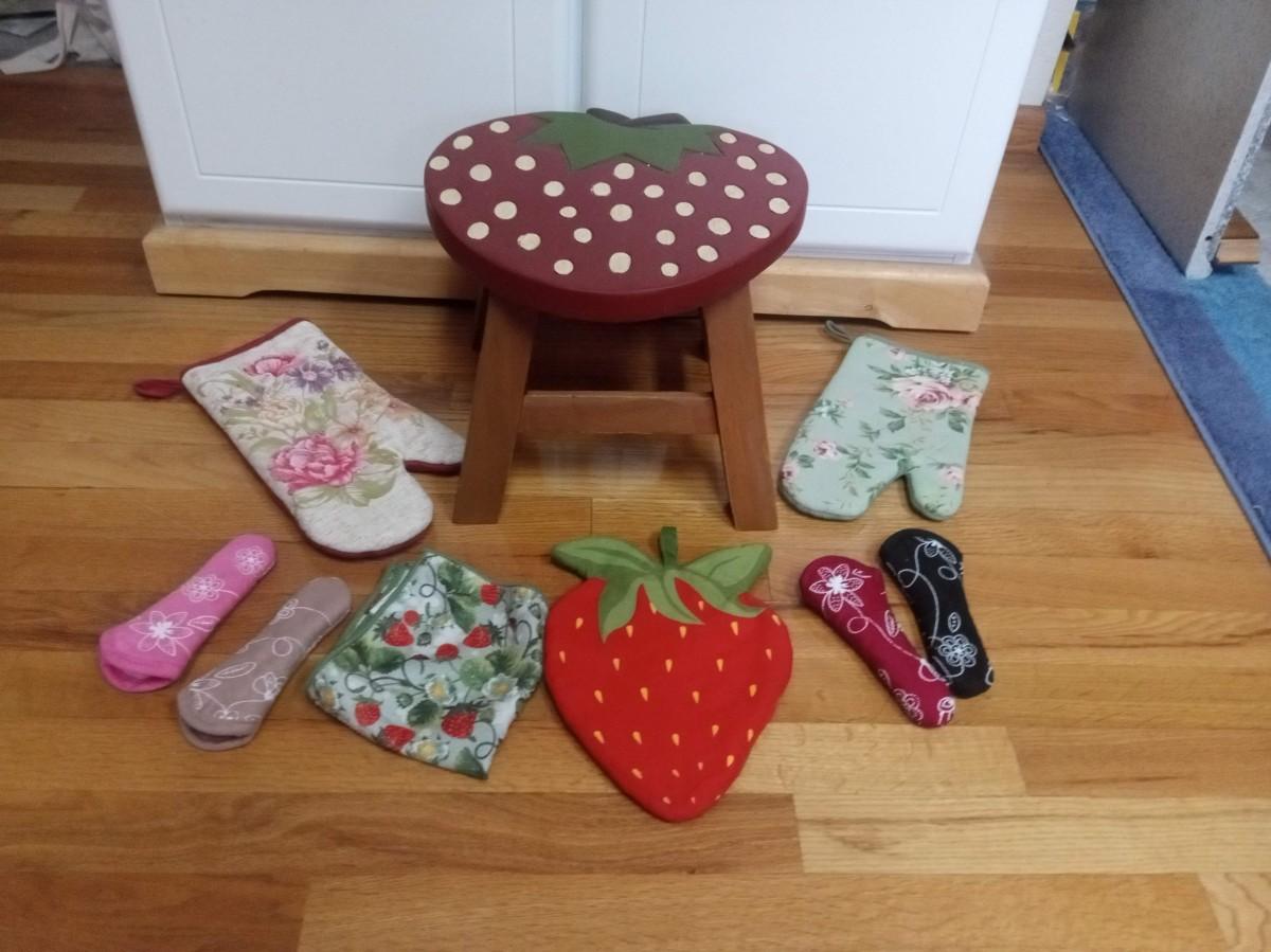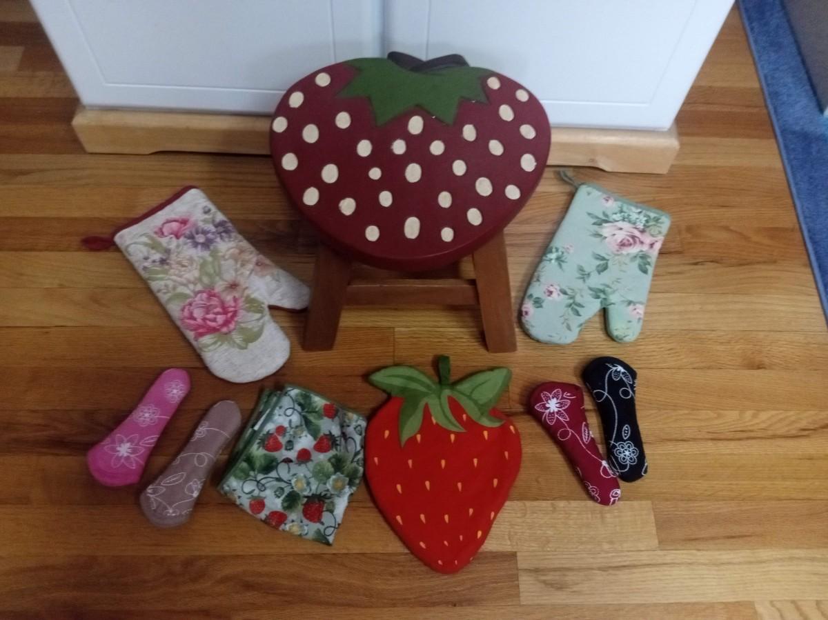 STRAWBERRY STOOL, OVEN MITTS, HANDLE HOLDERS AND DISHCLOTHS
