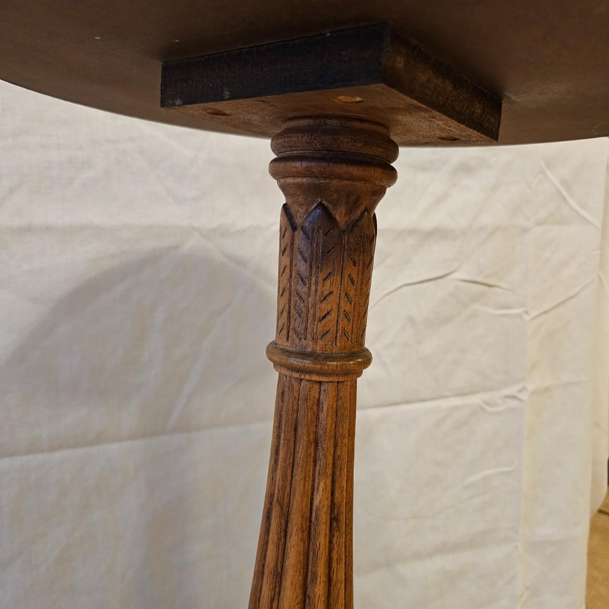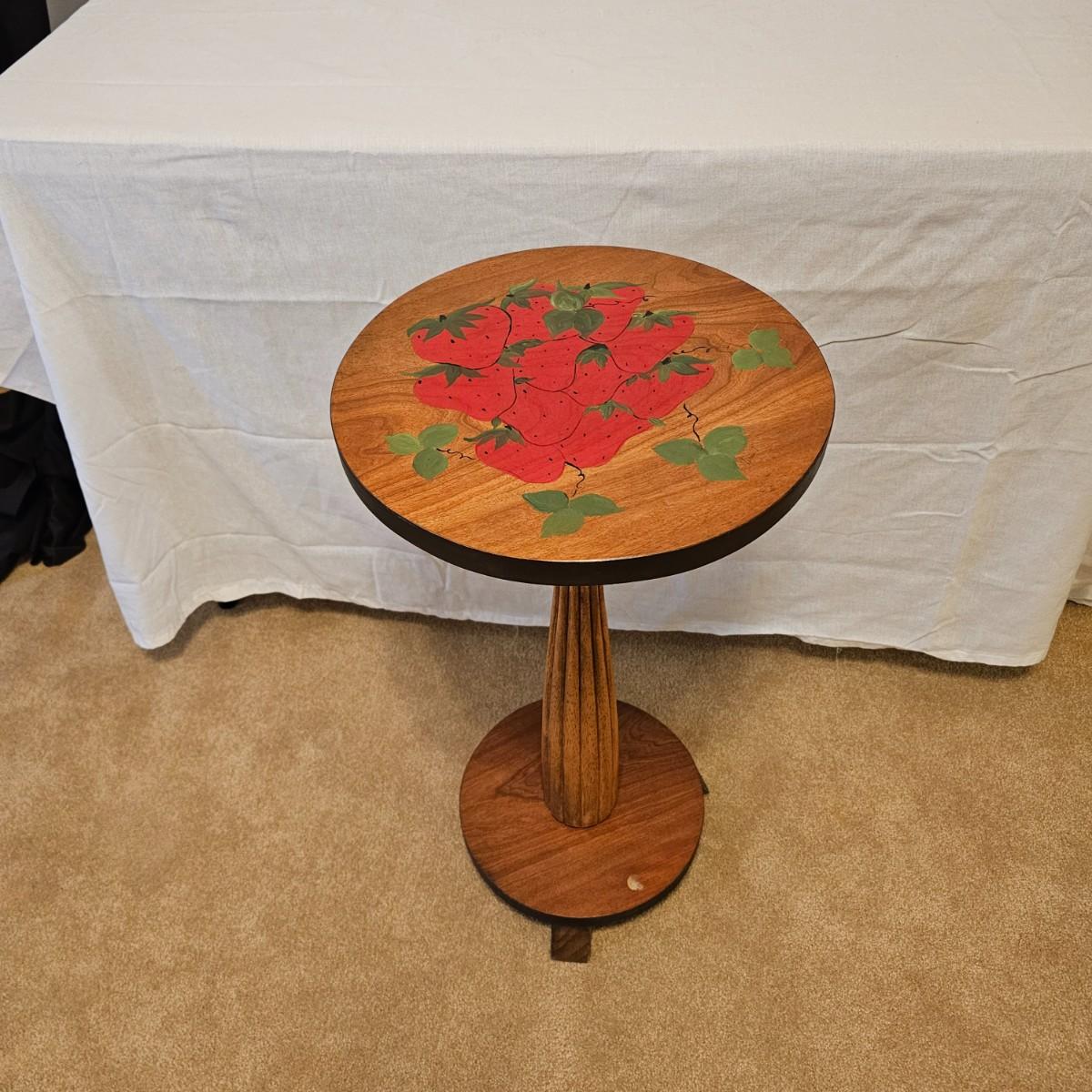 Painted strawberries and vines adorn the top of this wooden pedestal table. Fruit decoration appears to be hand painted. Base has three small feet, pedestal column has fluting all the way up. Table measures 14.5"D x 27"H. One small sticker residue on base, easily removed. See photos for details. Local pickup only.