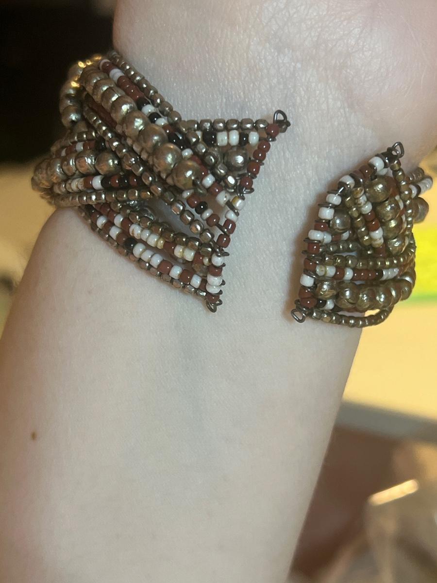 Silver toned bangle with black, brown, and white beads