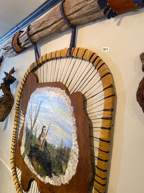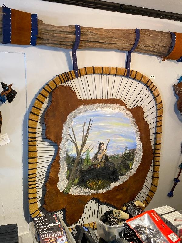 Stretched Leather Painting by local artist hung on driftwood Lot 1571