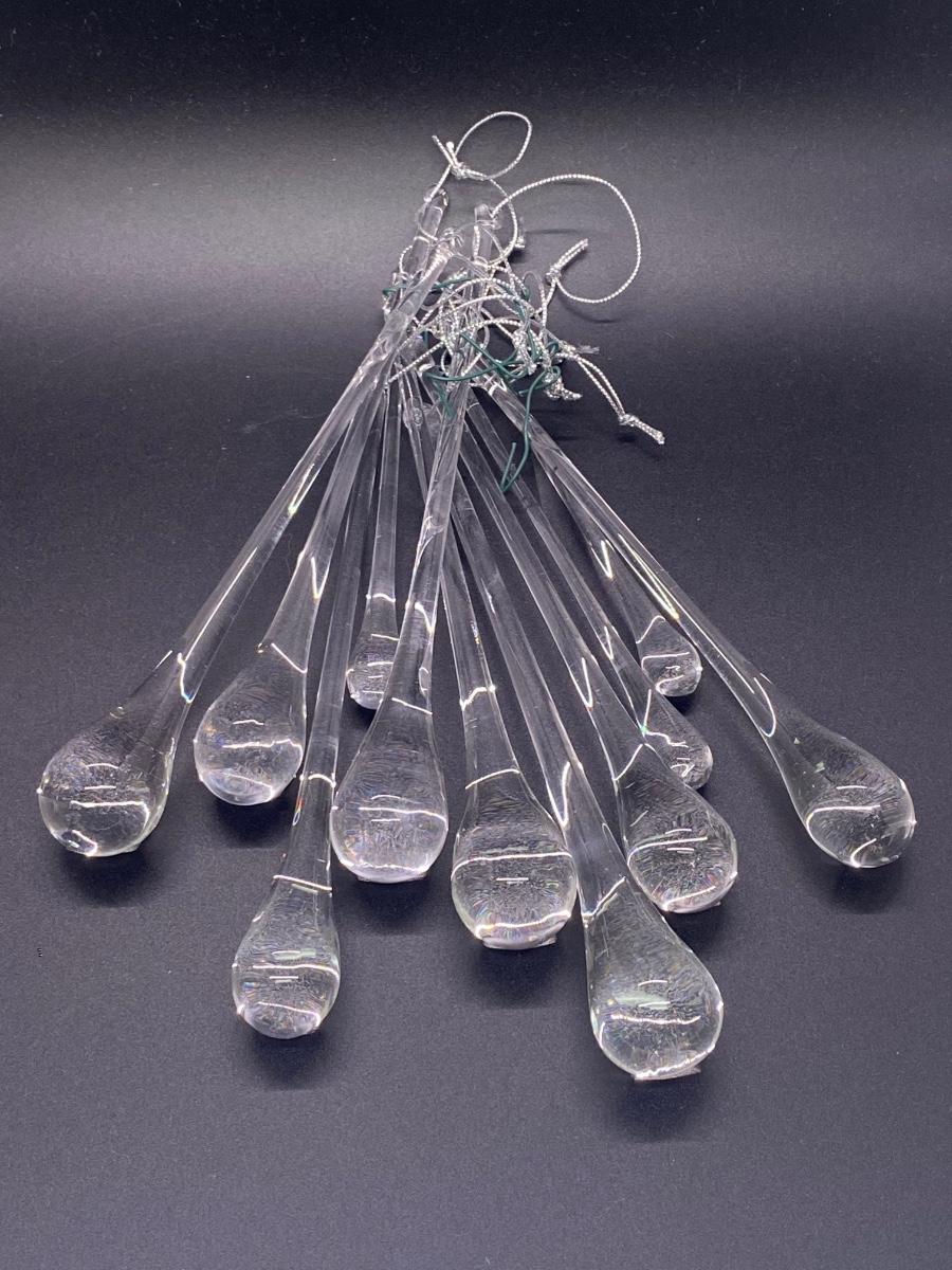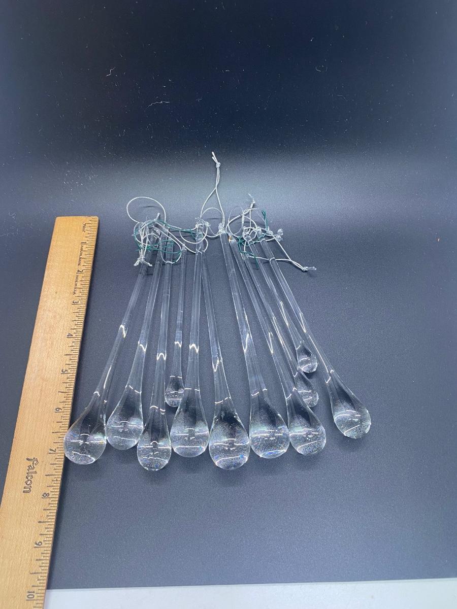 Lot of 11 stretched glass ornaments. Look like a water droplet. Two sizes. Can be used for craft projects. One does have a odd chip mark but is useable.