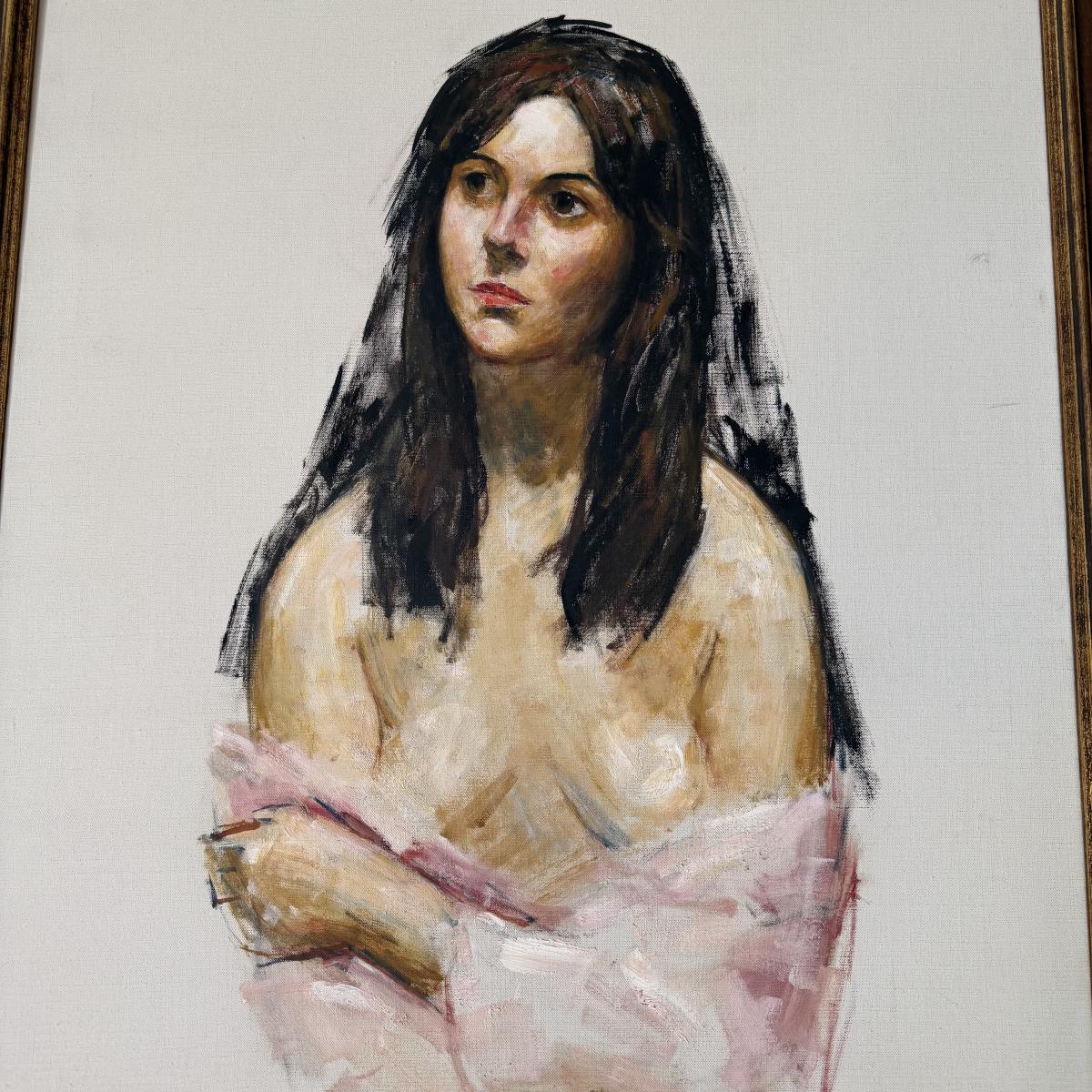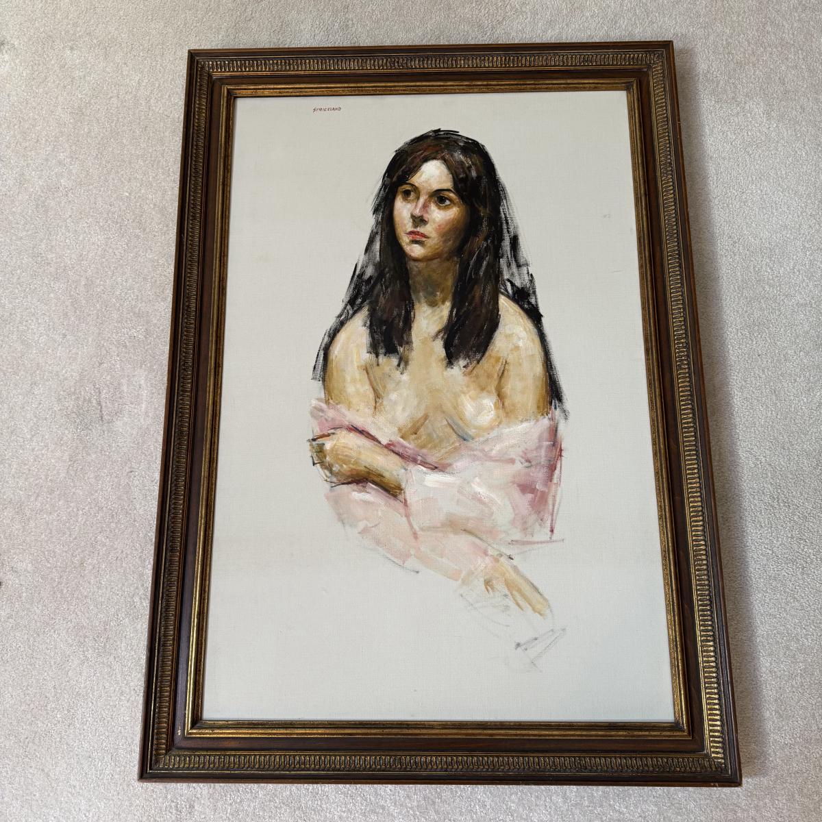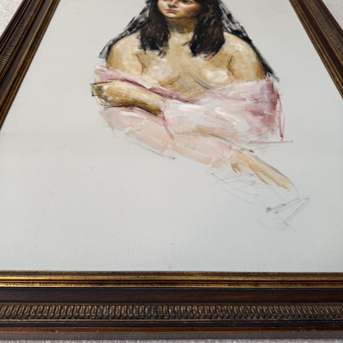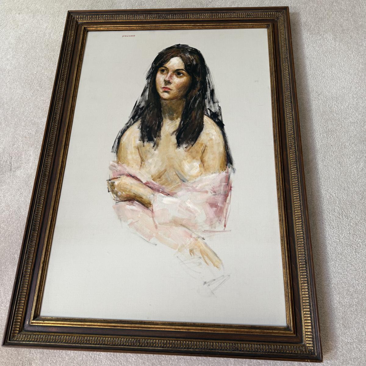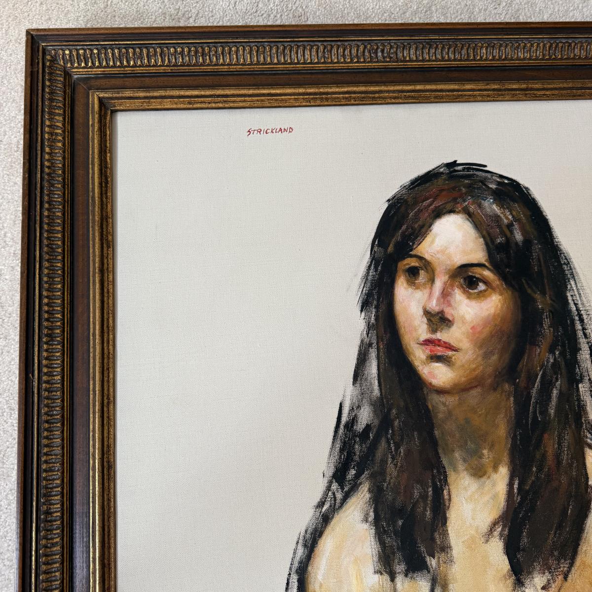 This lot contains a stunning original painting that appears to be by Thomas Strickland of a brunette woman. This large piece sits in a wooden golden accented frame (there is no glass). This piece measures 29.25” x 41.5” and comes out 1.5” from the wall. The signature ‘Strickland’ is in the upper left corner. This painting has hardware to be hung. Shipping available. Shipping can be costly. We suggest contacting our preferred local shipping provider, Postage Express, with dimensions and getting an estimate before bidding: (828) 255-9250 or shipping@postageexpressnc.com.
