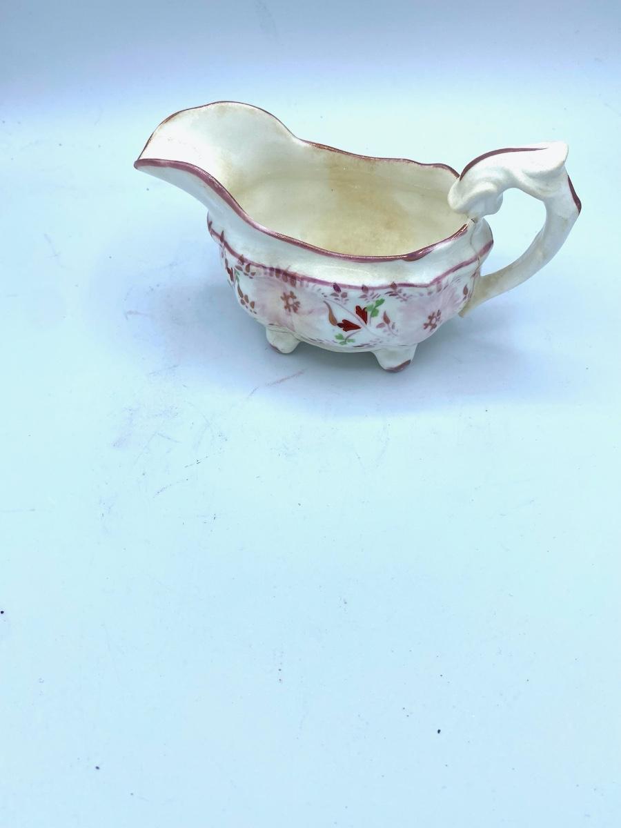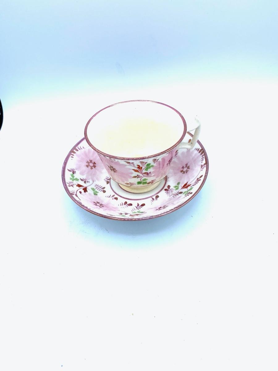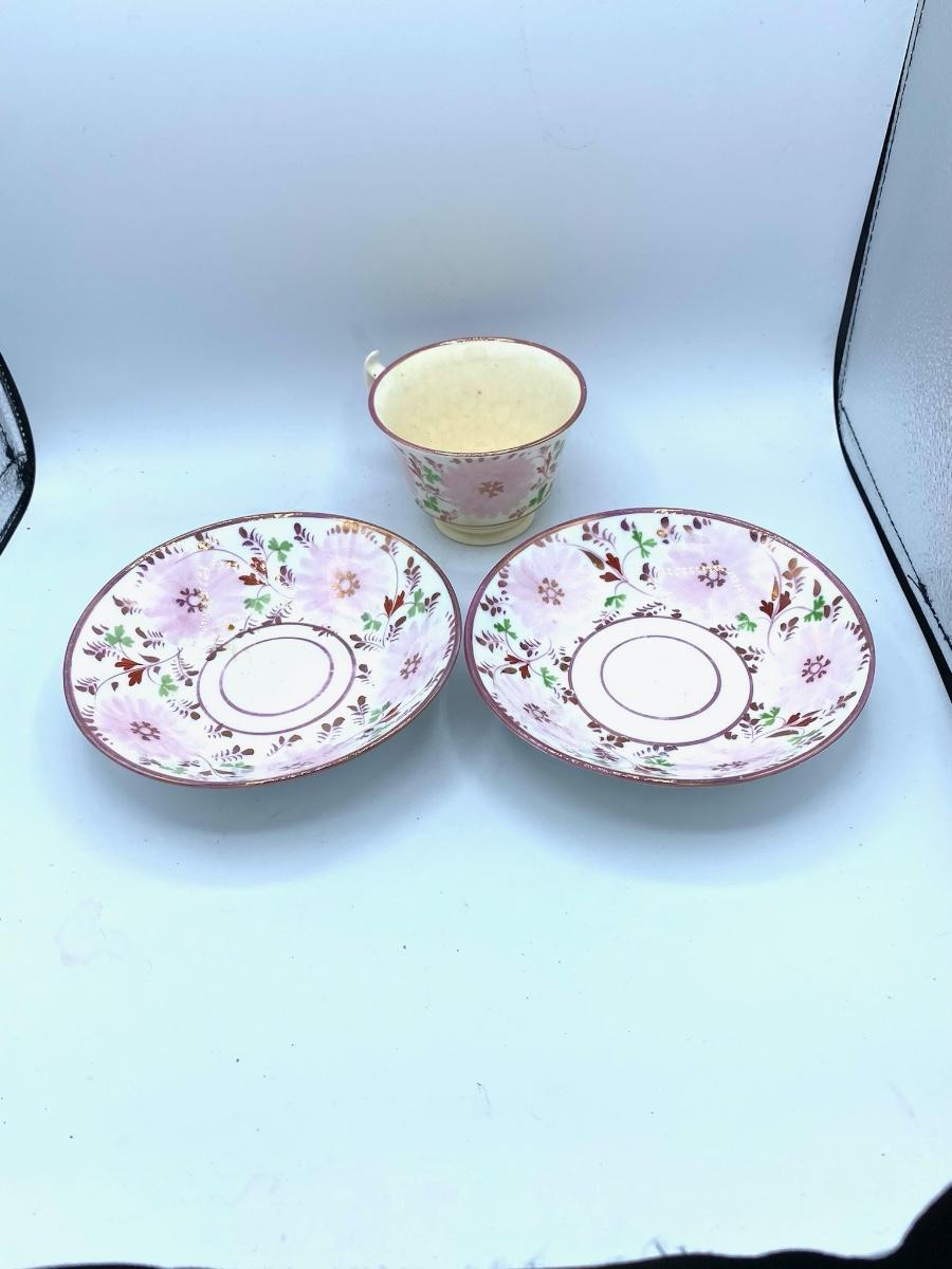 Pretty pink lusterware tea cup, with curved handle, with 2 saucers, one for tea the other biscuits, and a creamer which has been repaired, (see photo). The saucers have marking. saucers 5 1/2 " cup height 2 1/2, mouth 3 1/2