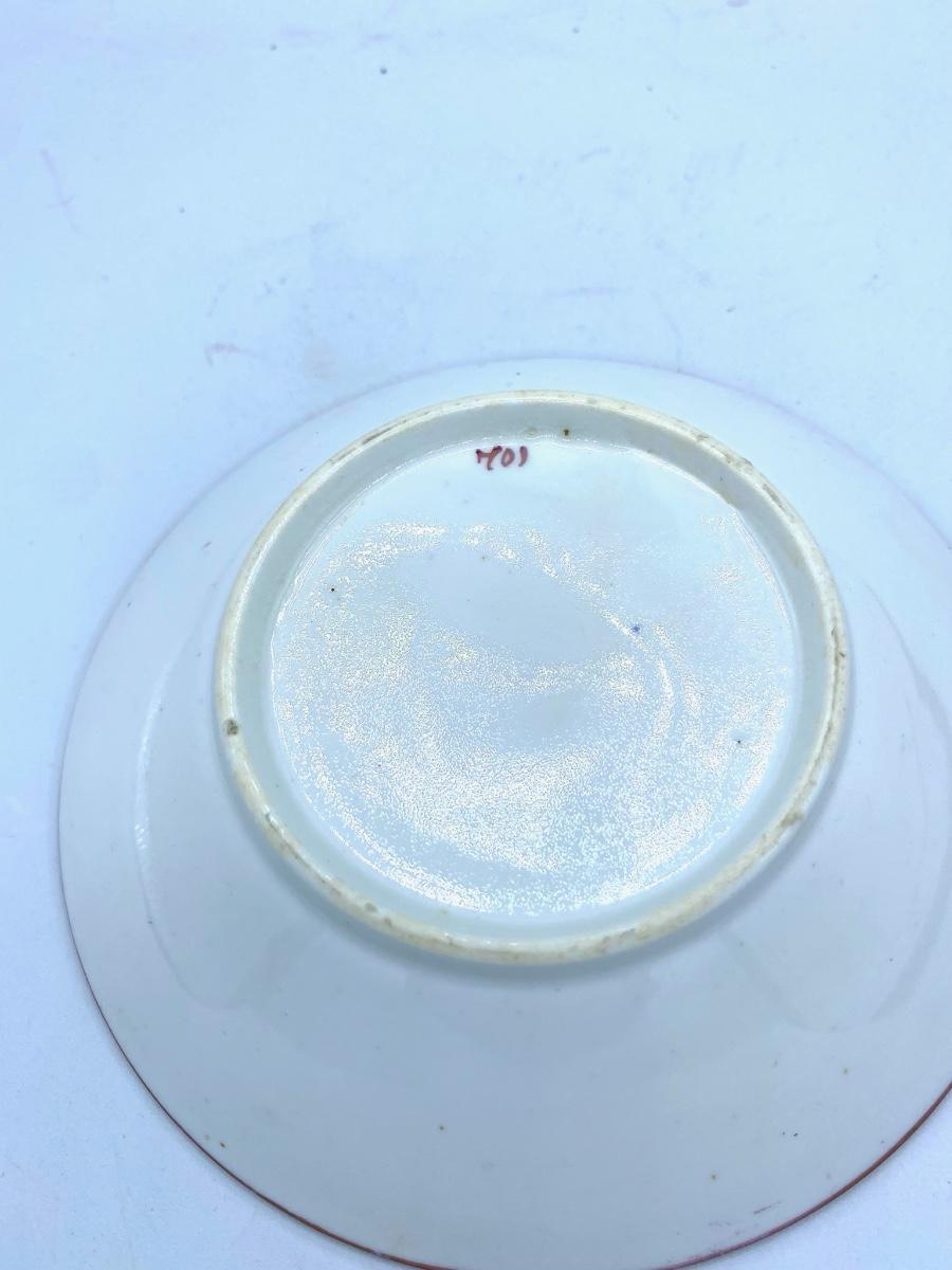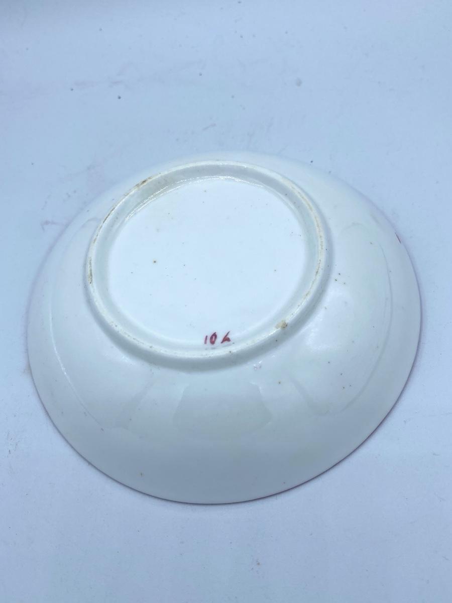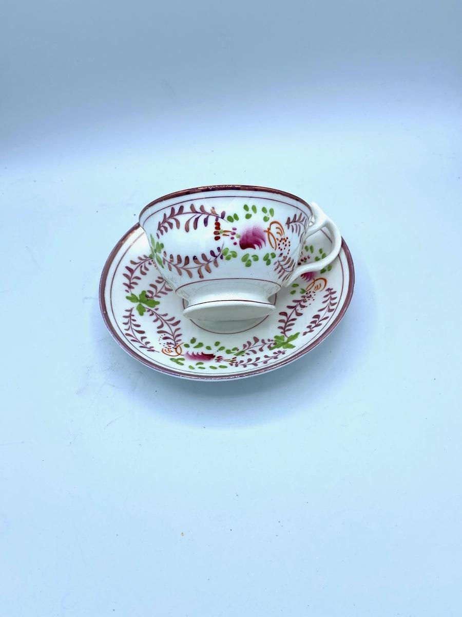 Pretty pink lusterware tea cup, with curved handle, with 2 saucers, one for tea the other biscuits, and a creamer which has been repaired, (see photo). The saucers have marking. saucers 5 1/2 " cup height 2 1/2, mouth 3 1/2