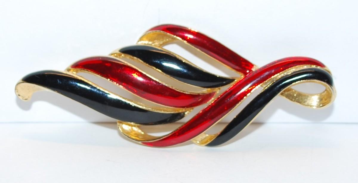 Striking RED & BLACK Ribbon BROOCH (2¾" x 1") with Gold Colored Inner Background on a Gold Tone Setting