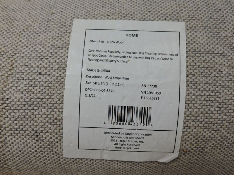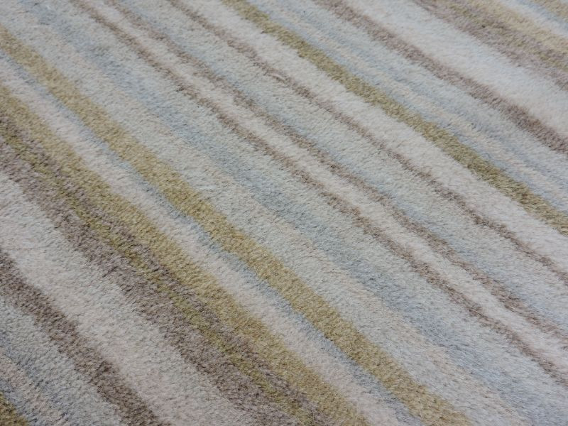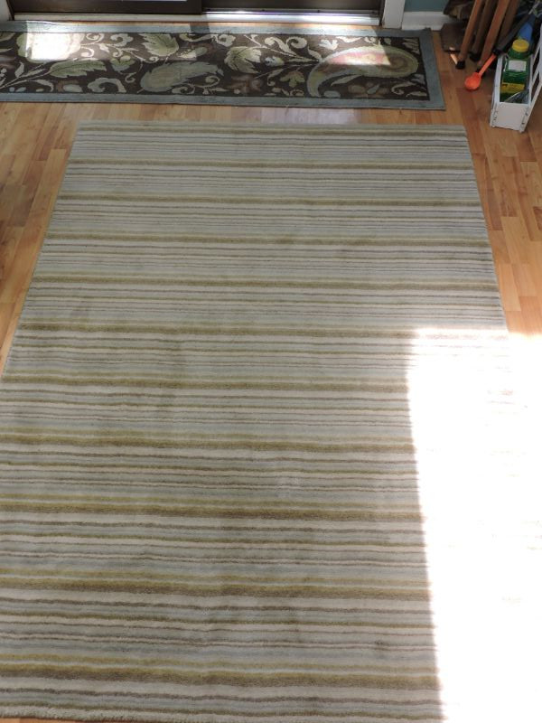 Striped 5’x7’ area wool rug in shades of blue, green, brown, and cream coordinates well with the Paisley Runner also in the auction.