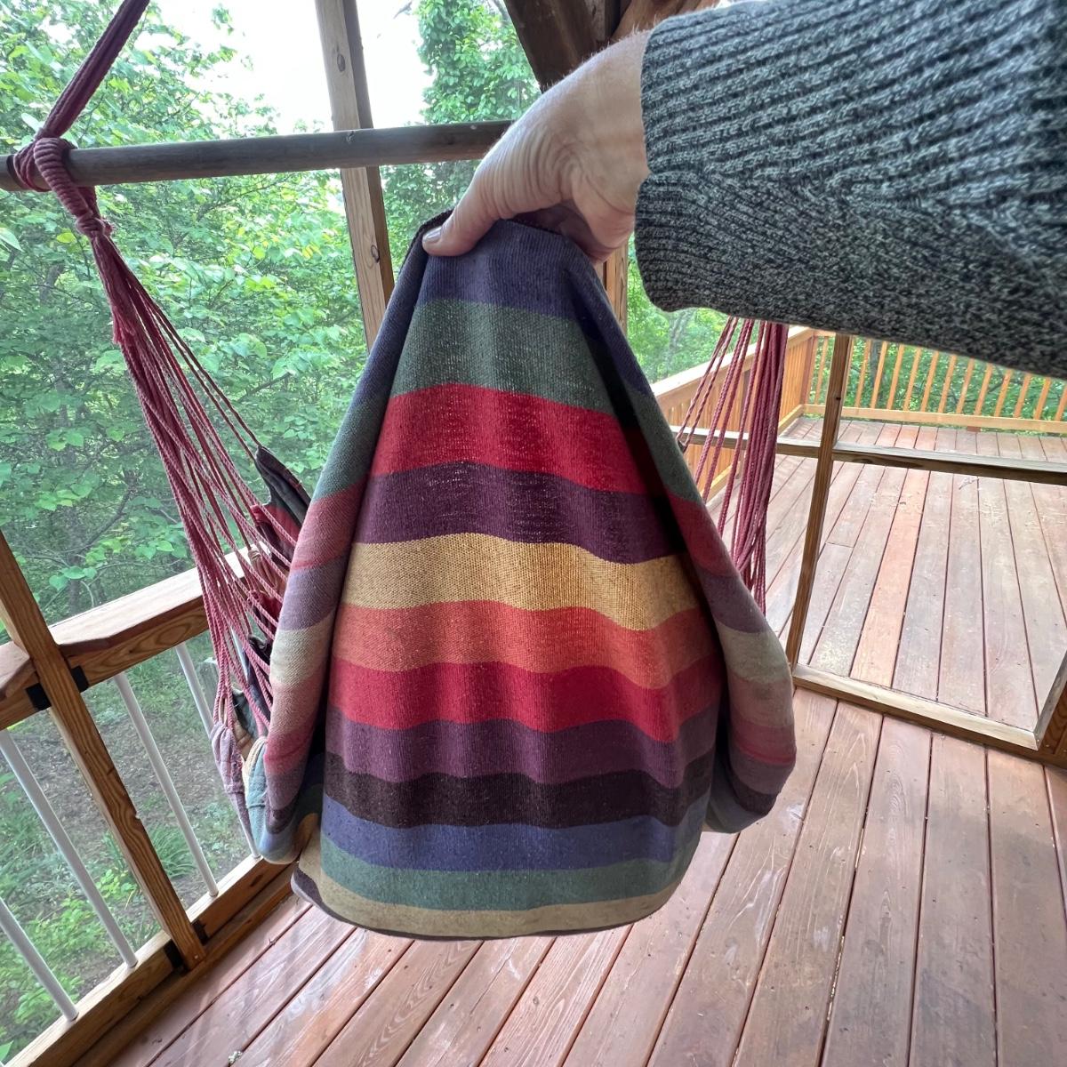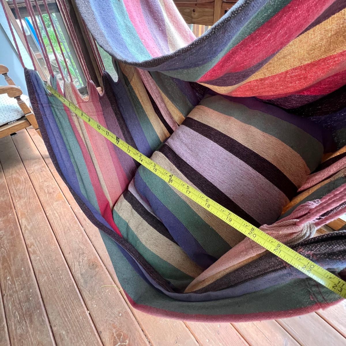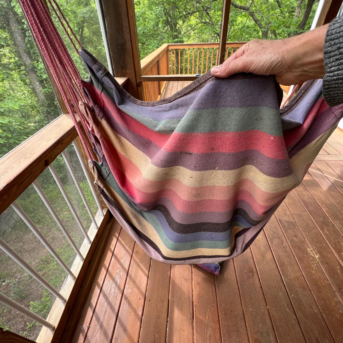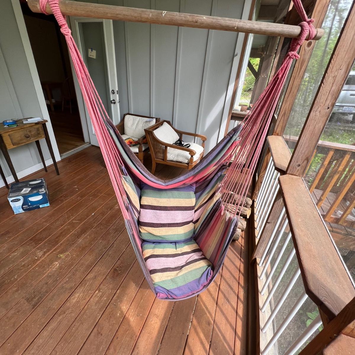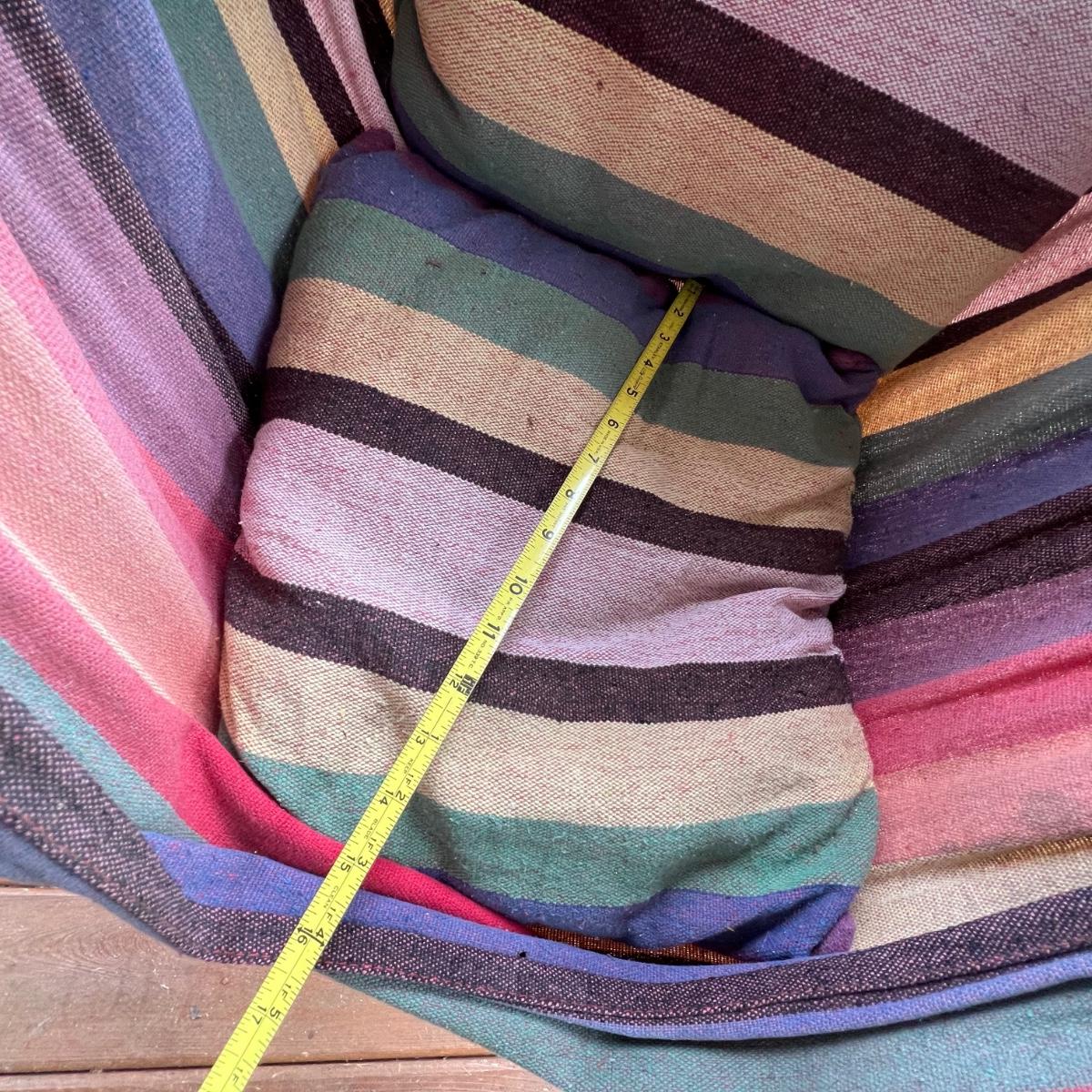 This striped hammock chair has pink rope sides attached to a wood pole that measures 39”. It does have some fading on the back side. See images for measurements. Chain is included but not the ring attached to the ceiling. Winning bidder will be responsible for taking this down. Lot also includes a drawstring bag.