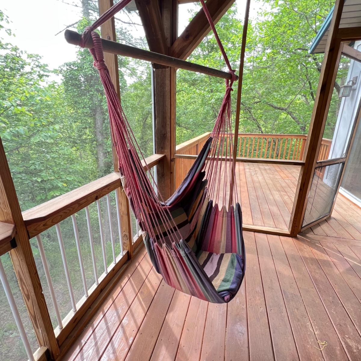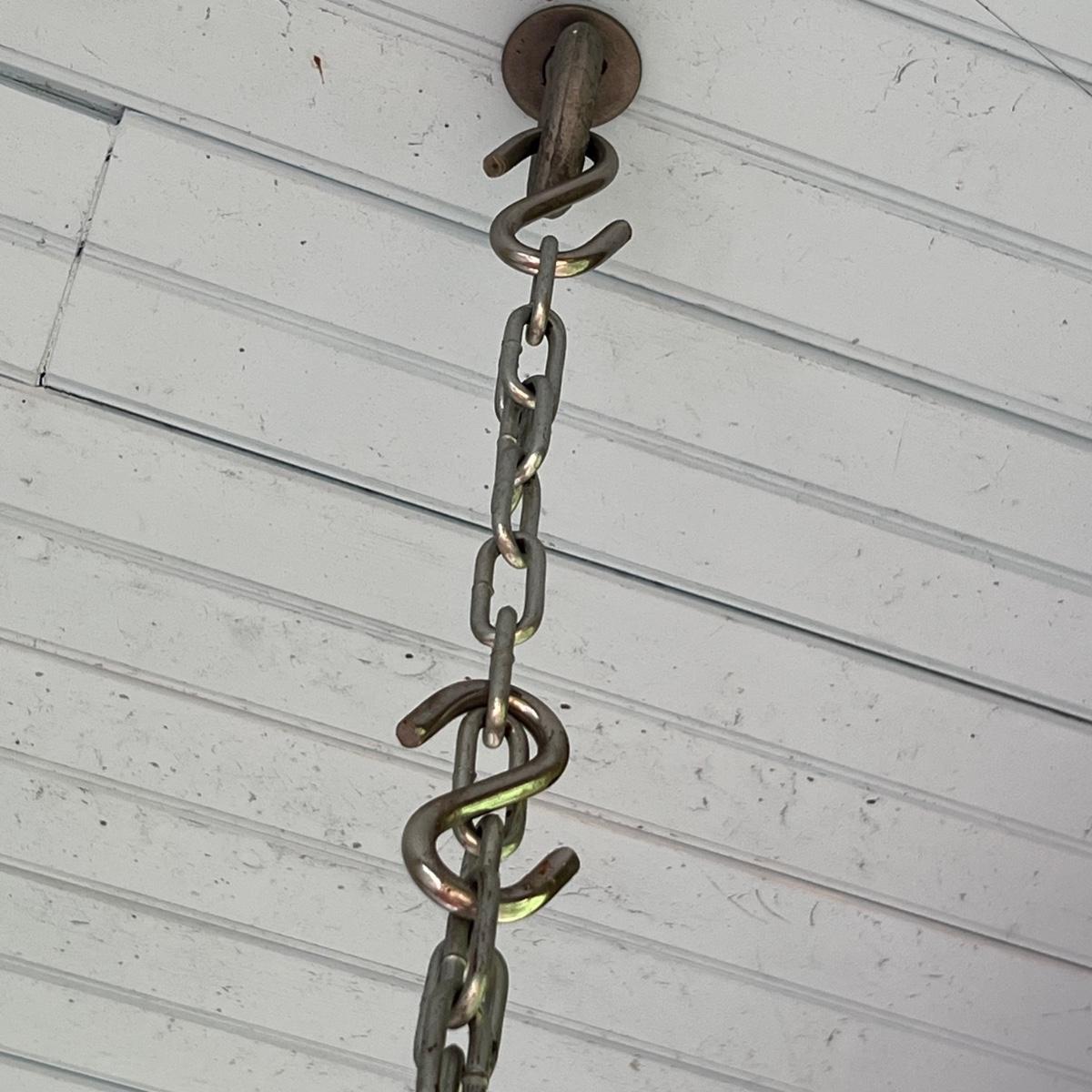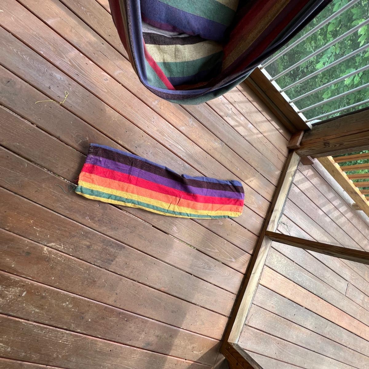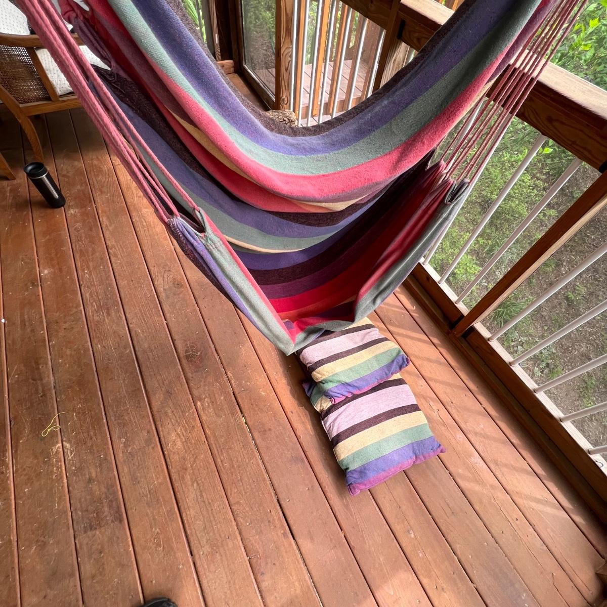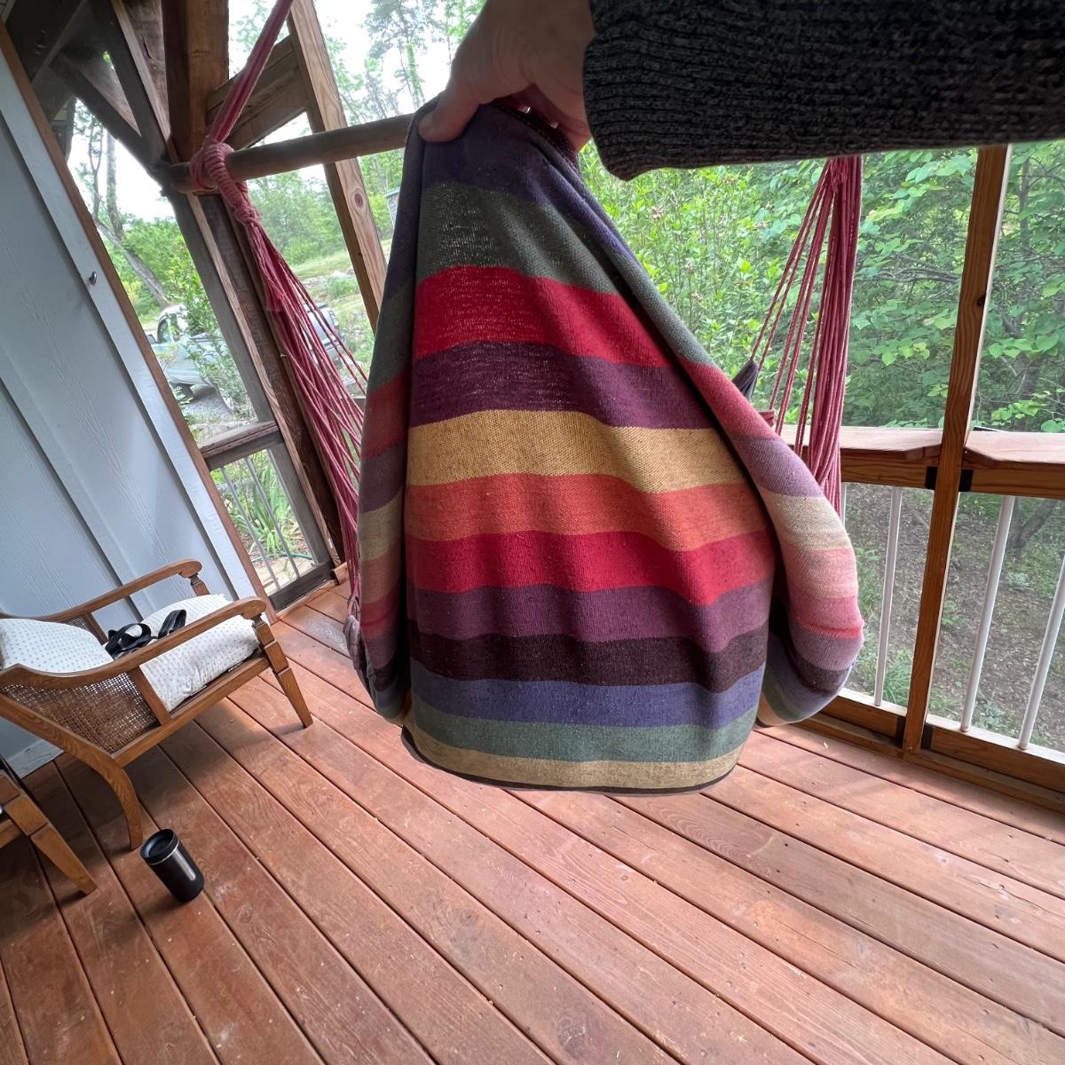This striped hammock chair has pink rope sides attached to a wood pole that measures 39”. It does have some fading on the back side. See images for measurements. Chain is included but not the ring attached to the ceiling. Winning bidder will be responsible for taking this down. Lot also includes a drawstring bag.