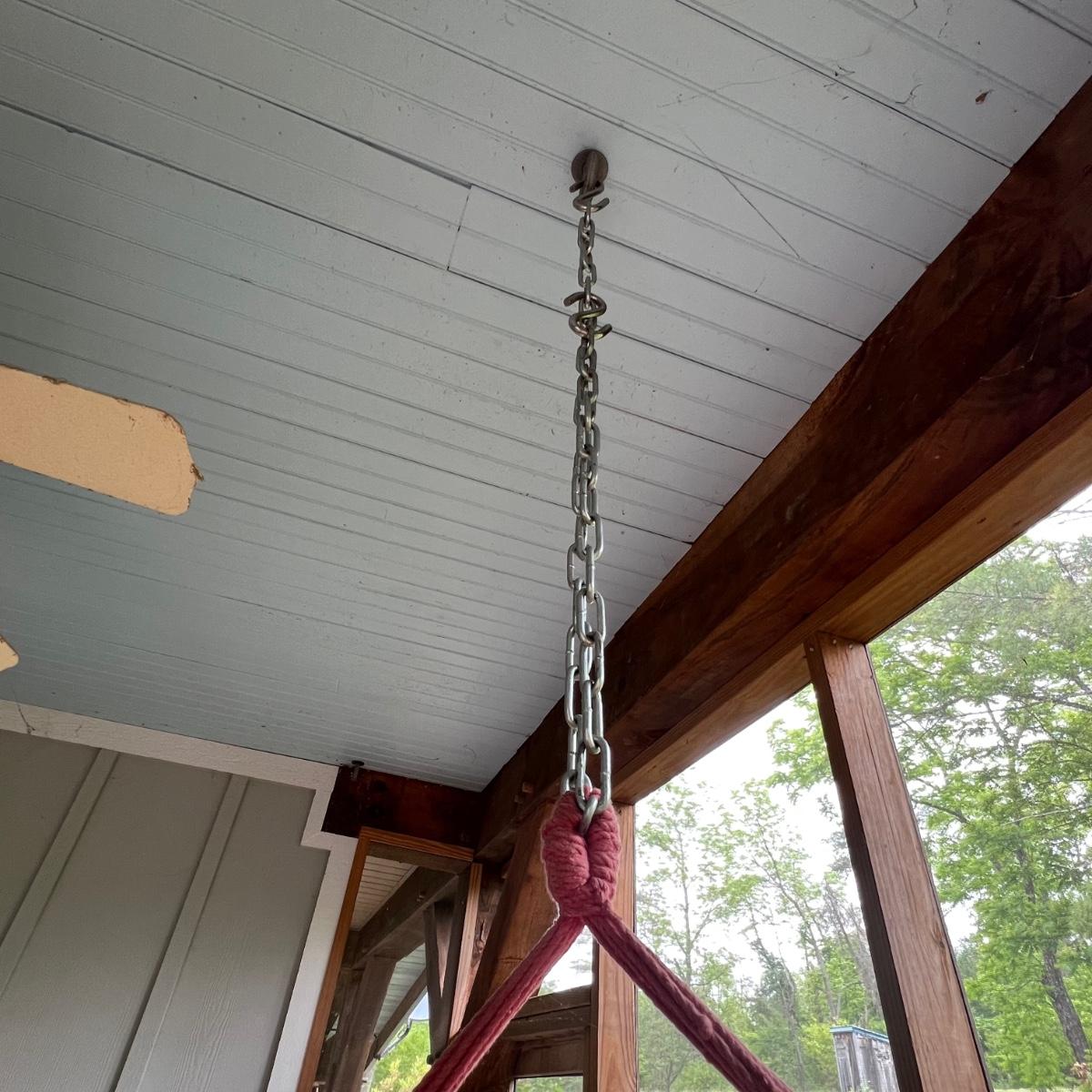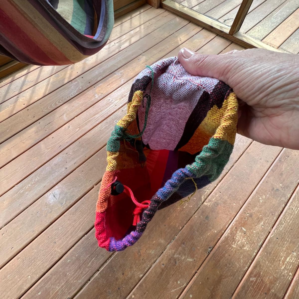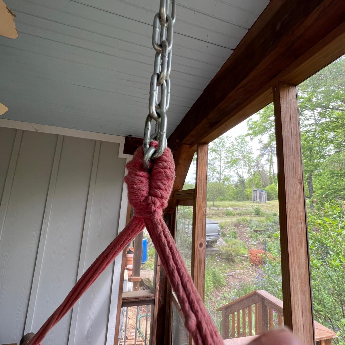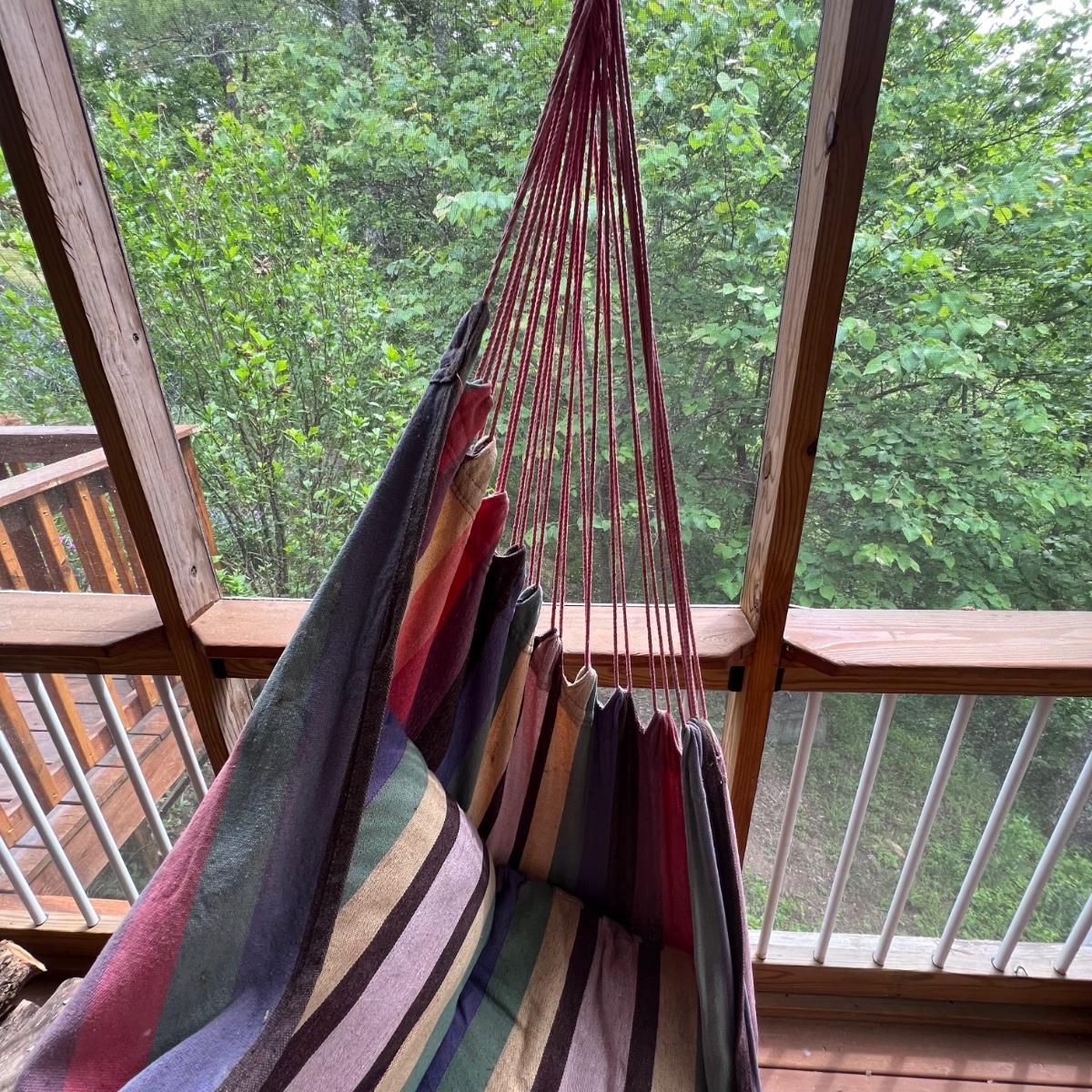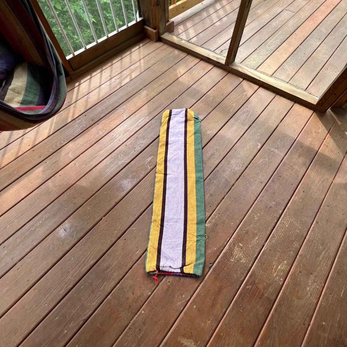 This striped hammock chair has pink rope sides attached to a wood pole that measures 39”. It does have some fading on the back side. See images for measurements. Chain is included but not the ring attached to the ceiling. Winning bidder will be responsible for taking this down. Lot also includes a drawstring bag.