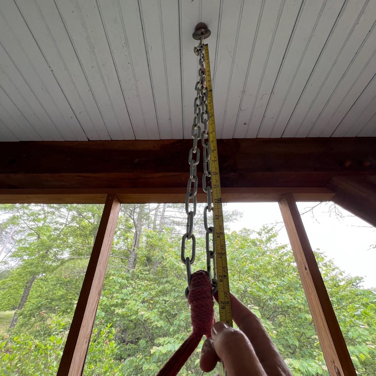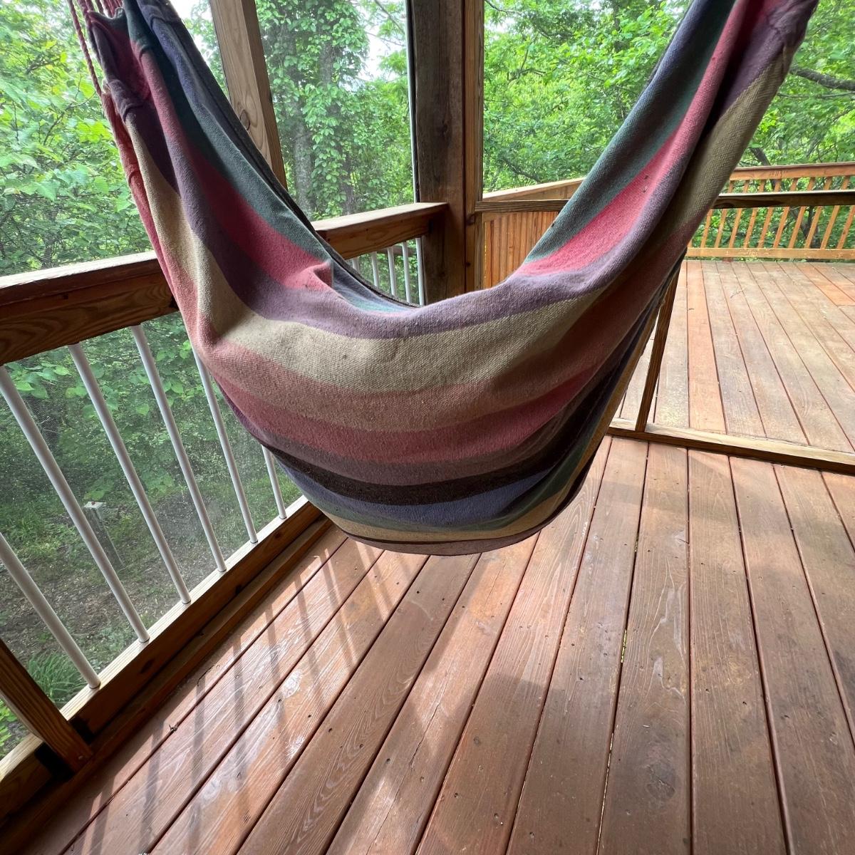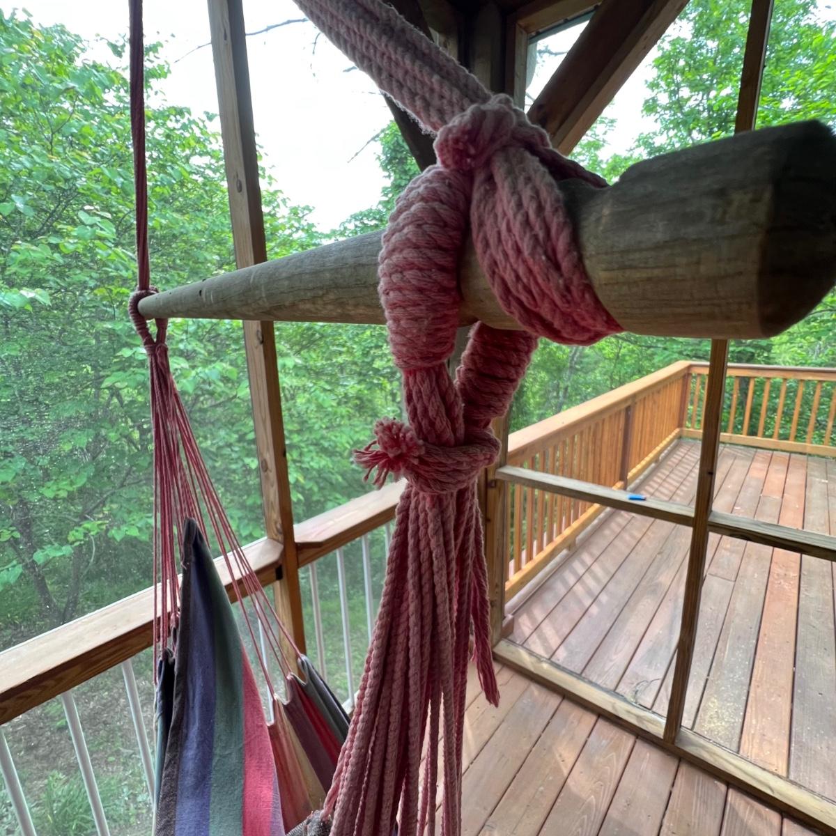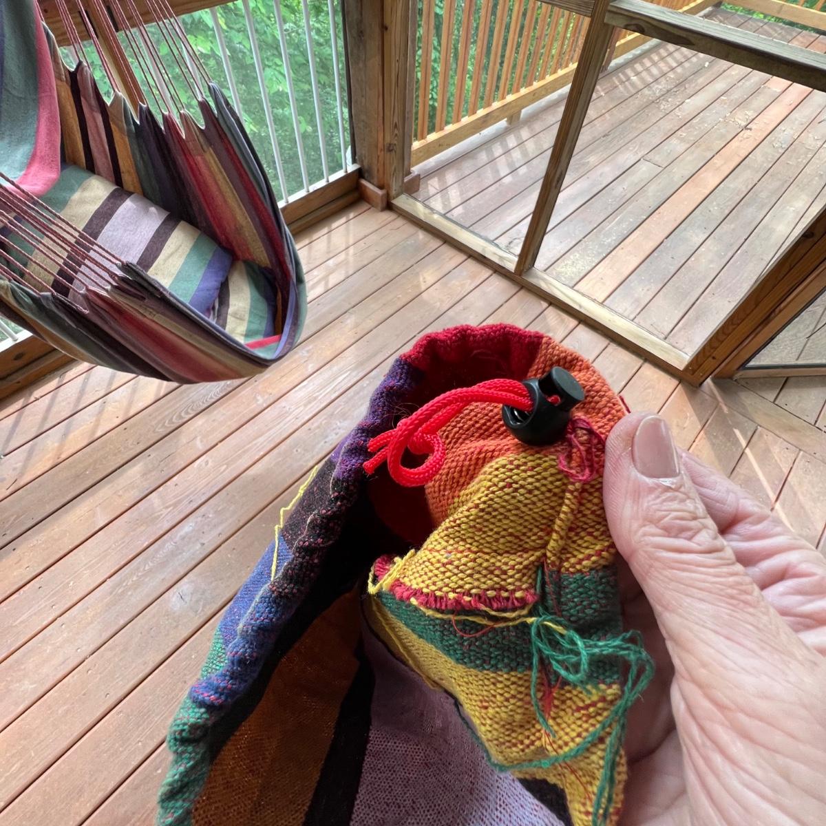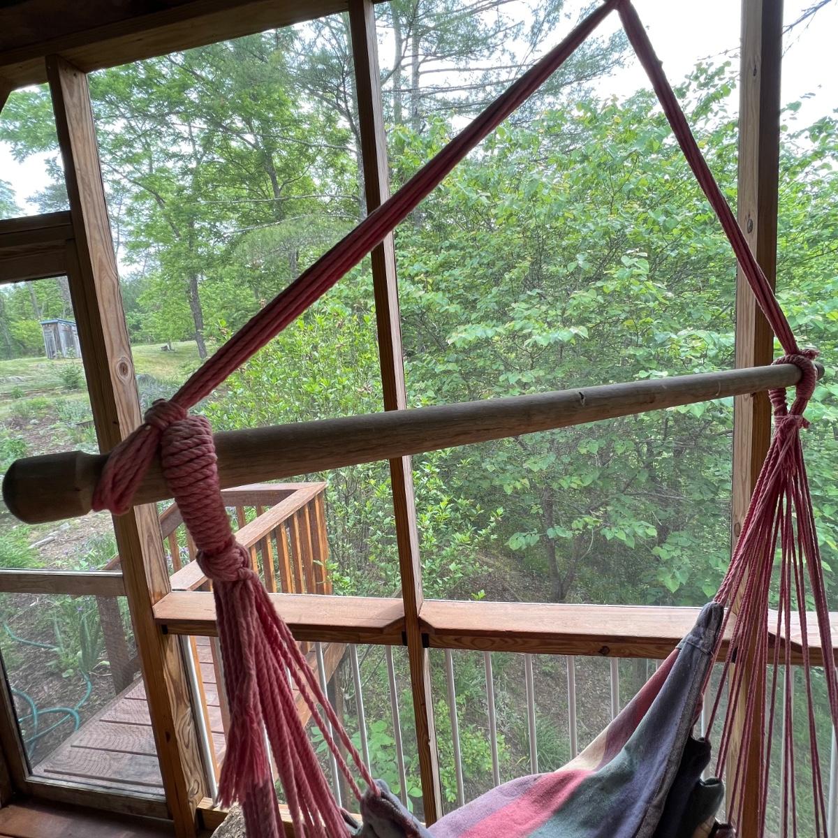 This striped hammock chair has pink rope sides attached to a wood pole that measures 39”. It does have some fading on the back side. See images for measurements. Chain is included but not the ring attached to the ceiling. Winning bidder will be responsible for taking this down. Lot also includes a drawstring bag.