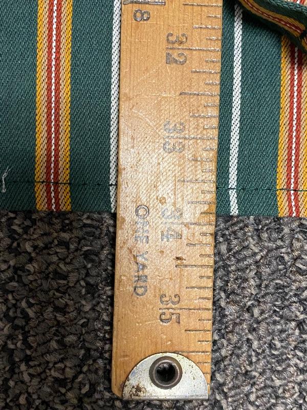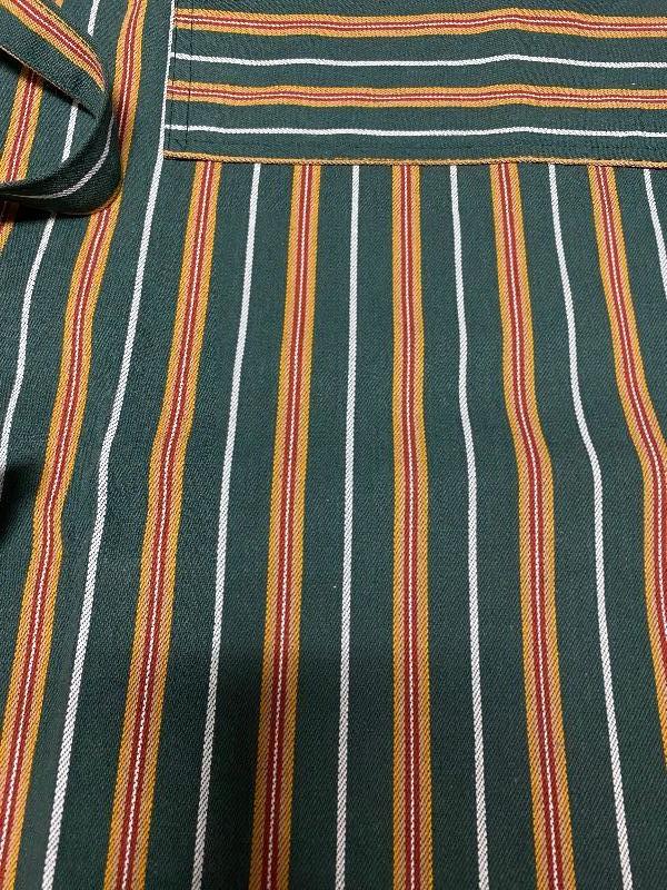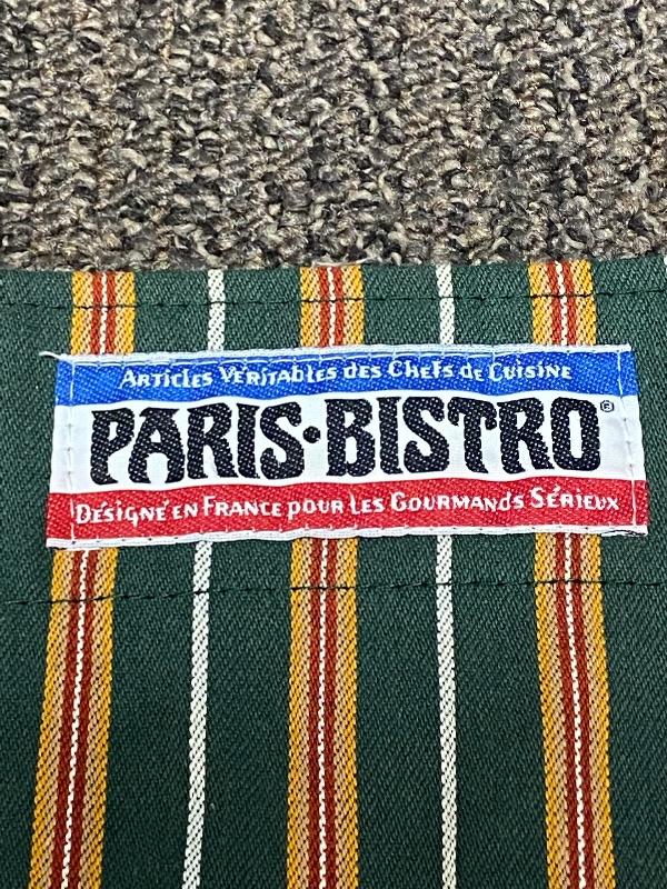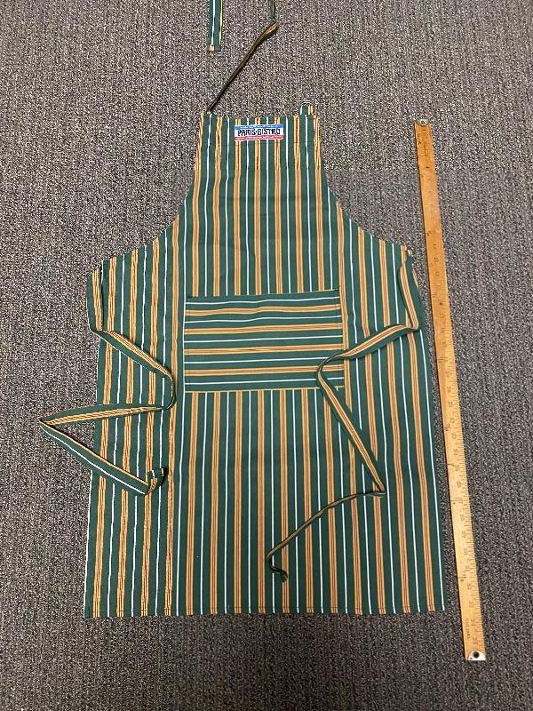 Green, gold, white, and red striped apron by Paris Bistro. Heavy fabric. 34" length. Adjustable neck strap and waist tie.