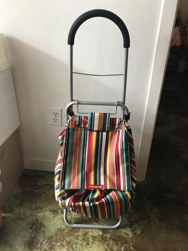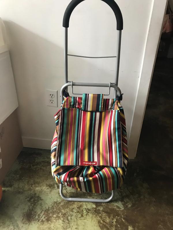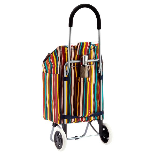 Get things rolling with our cheerful Striped Shopping Cart. It features a water-resistant lining and an insulated pouch to keep items hot or cold until you get home. There's also an umbrella pocket, two side pockets and an additional exterior pocket. The bag features a draw-string closure and is removable from the frame. Once you're home, the cart folds up for compact storage.