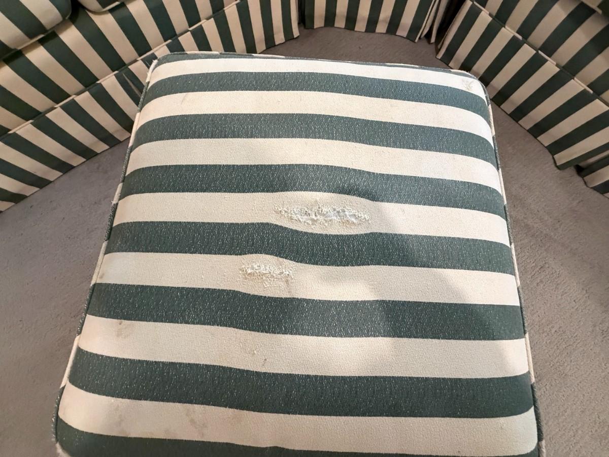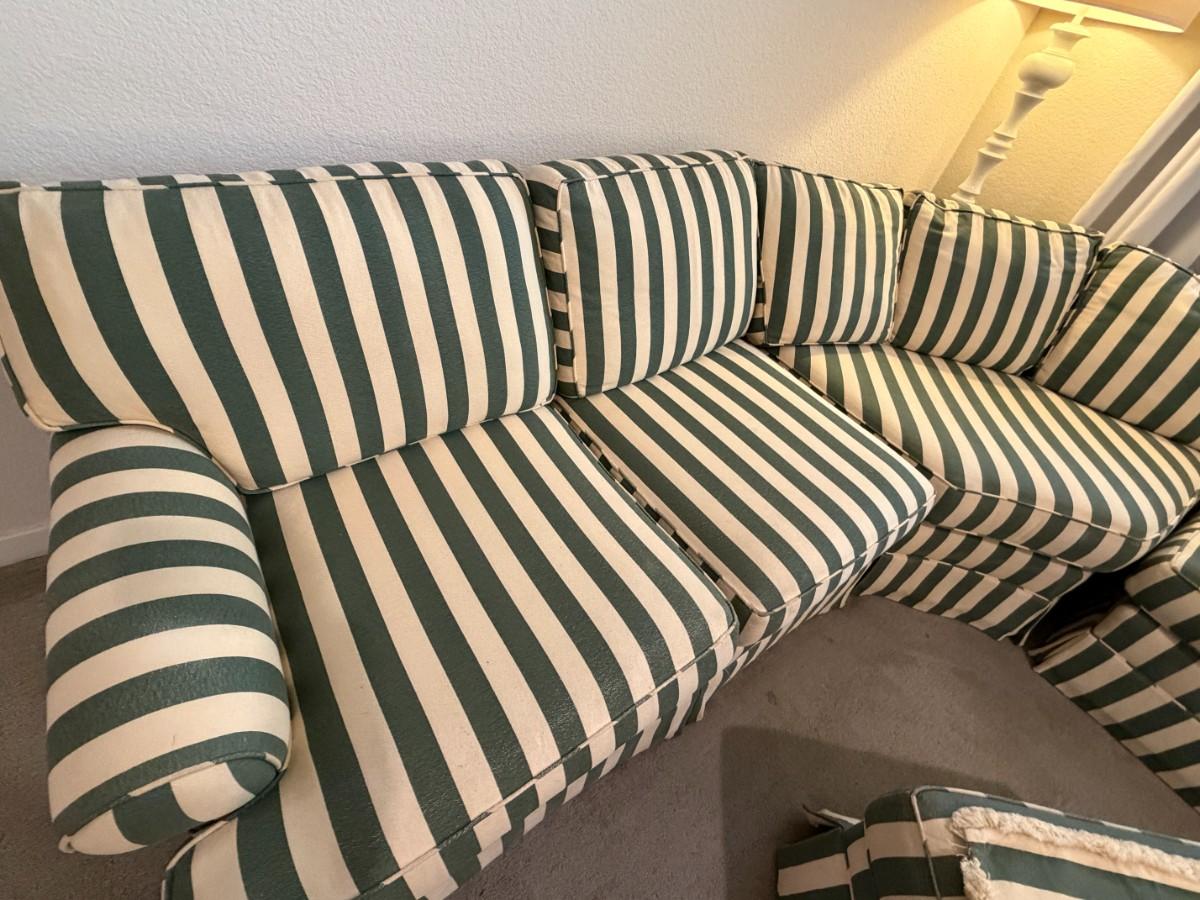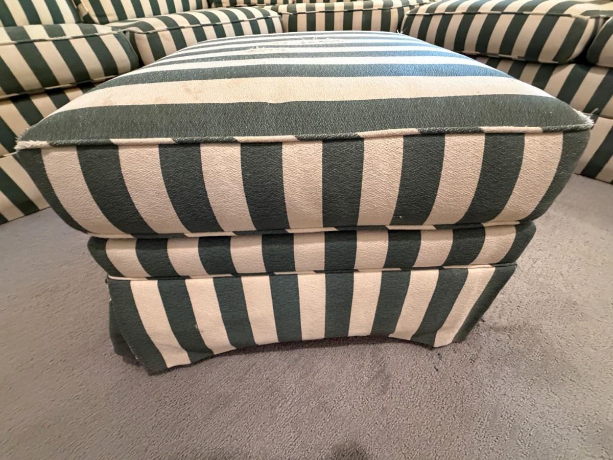 minimal wear- slight discoloration on one cushion and tear on top of ottoman which owner covered with matching fabric