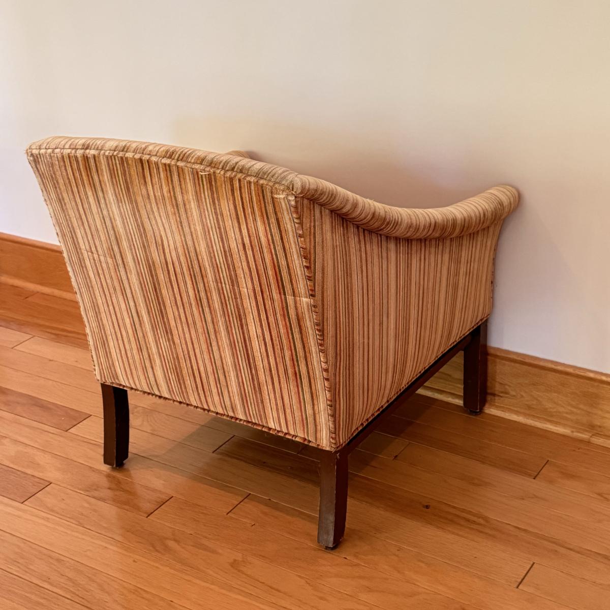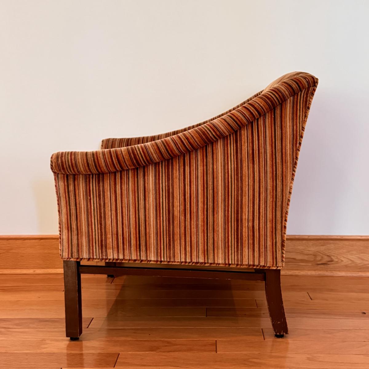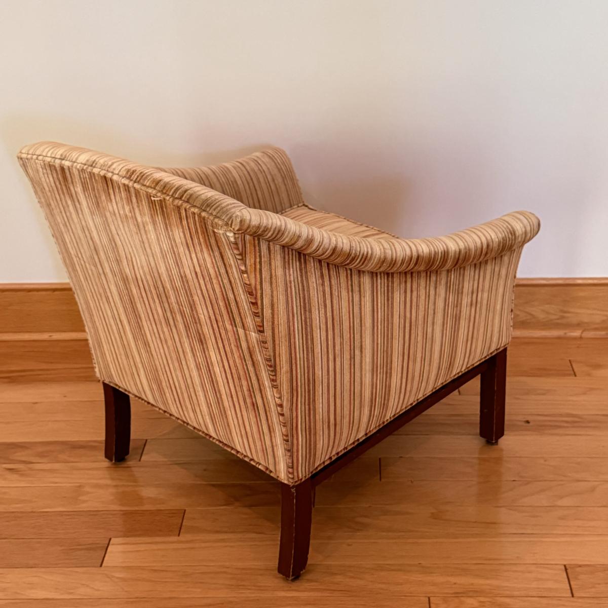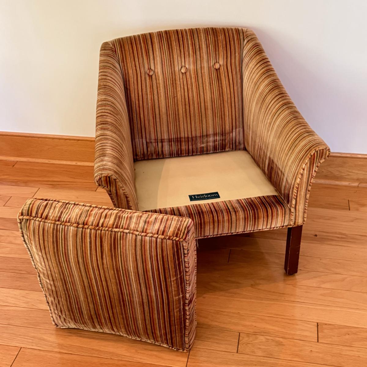 This lot includes one Heirloom Furniture chair with velvet fabric and wooden legs. The chair has a striped pattern throughout. There are a few small signs of wear - see picture included. There is some cat hair that can be removed under the cushion. The chair measures 27” x 23” x 26”H, The seat measures 17” x 18” x 15”H from the ground. Local pickup only.