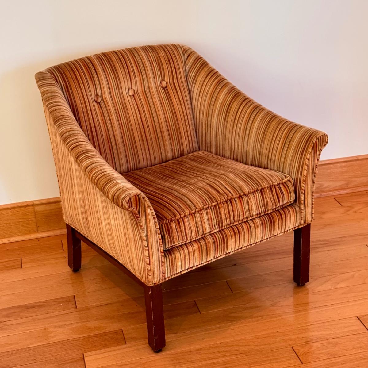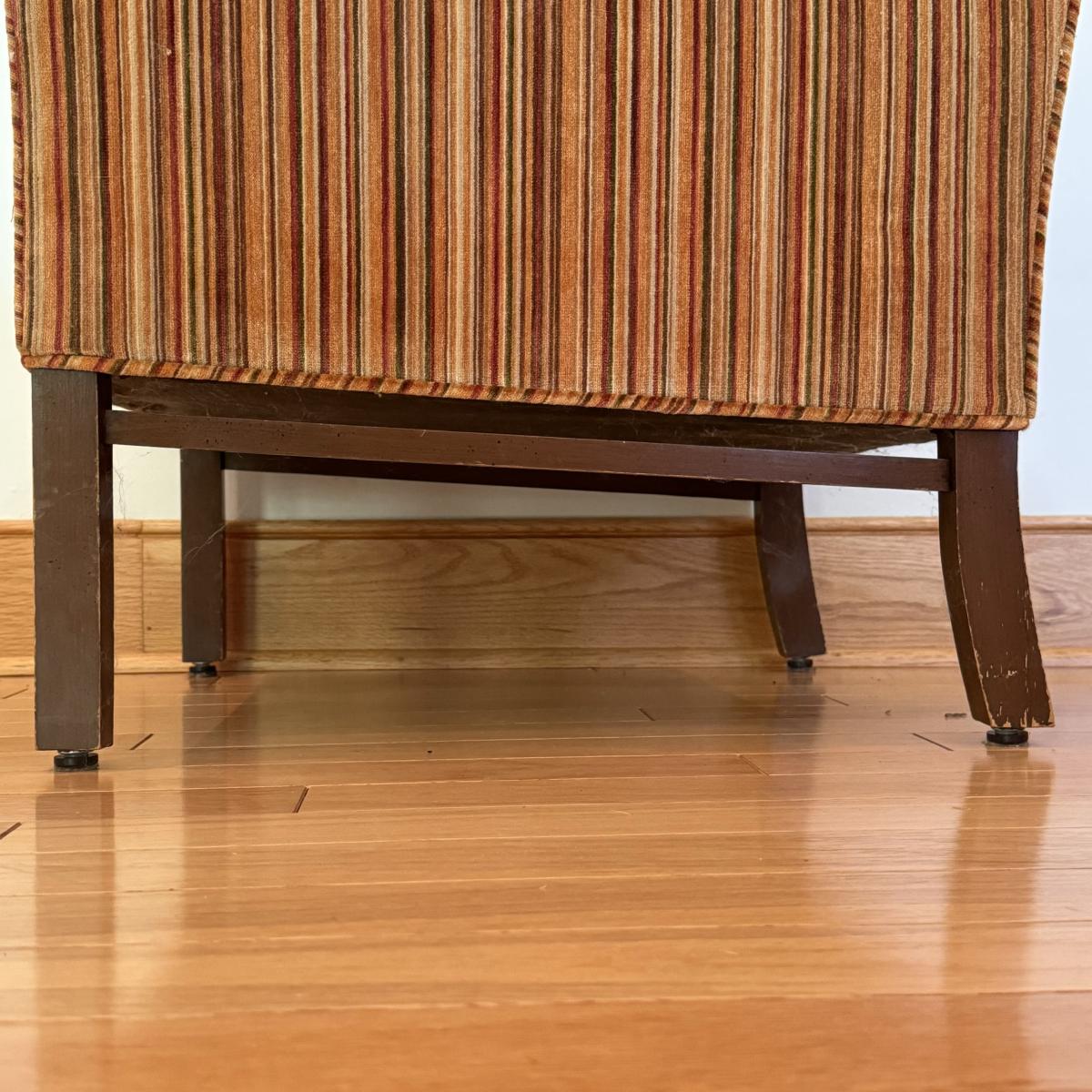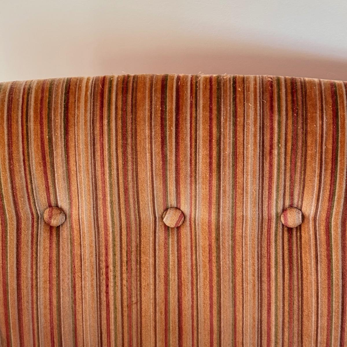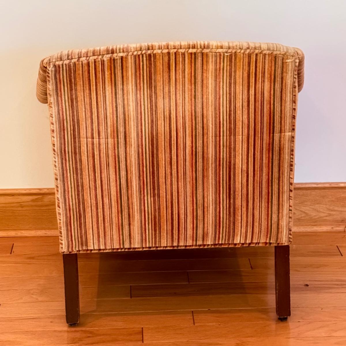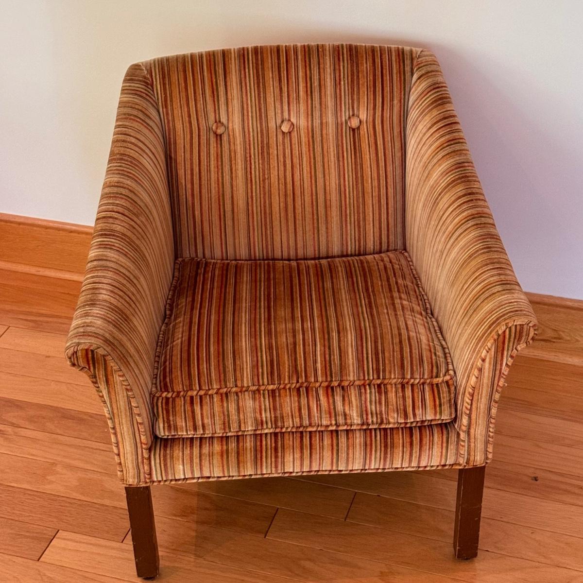 This lot includes one Heirloom Furniture chair with velvet fabric and wooden legs. The chair has a striped pattern throughout. There are a few small signs of wear - see picture included. There is some cat hair that can be removed under the cushion. The chair measures 27” x 23” x 26”H, The seat measures 17” x 18” x 15”H from the ground. Local pickup only.