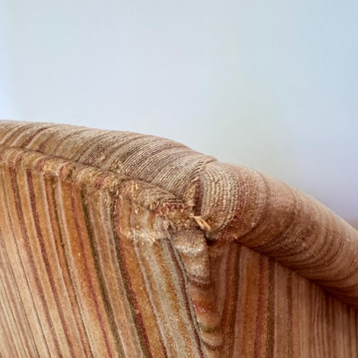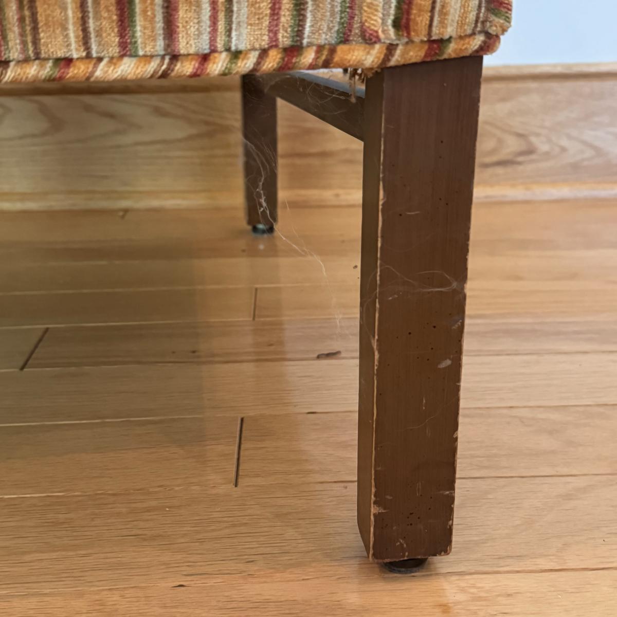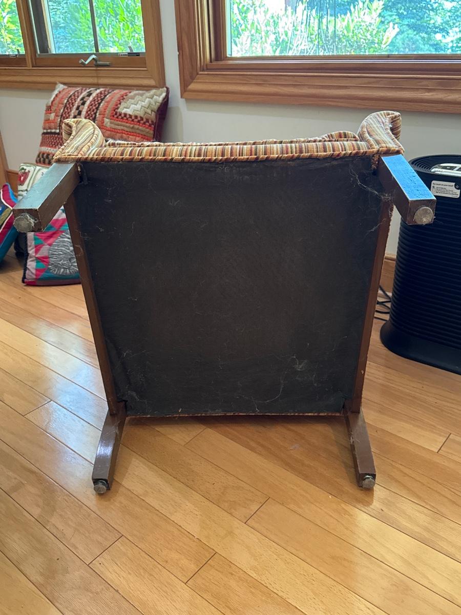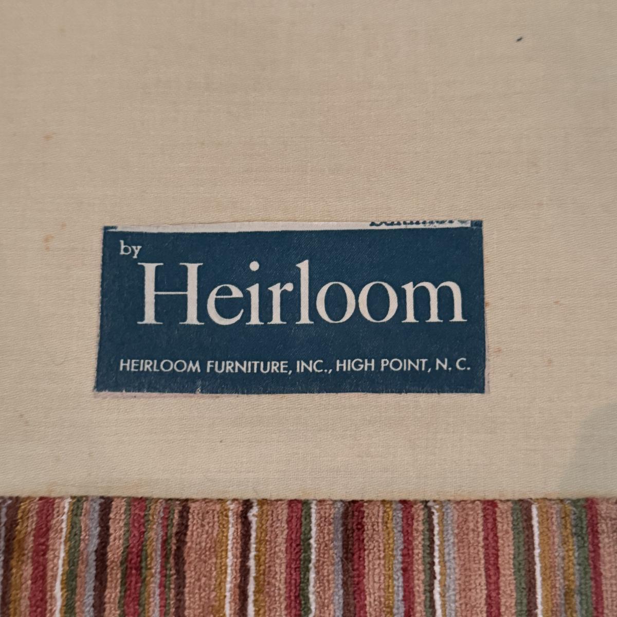 This lot includes one Heirloom Furniture chair with velvet fabric and wooden legs. The chair has a striped pattern throughout. There are a few small signs of wear - see picture included. There is some cat hair that can be removed under the cushion. The chair measures 27” x 23” x 26”H, The seat measures 17” x 18” x 15”H from the ground. Local pickup only.