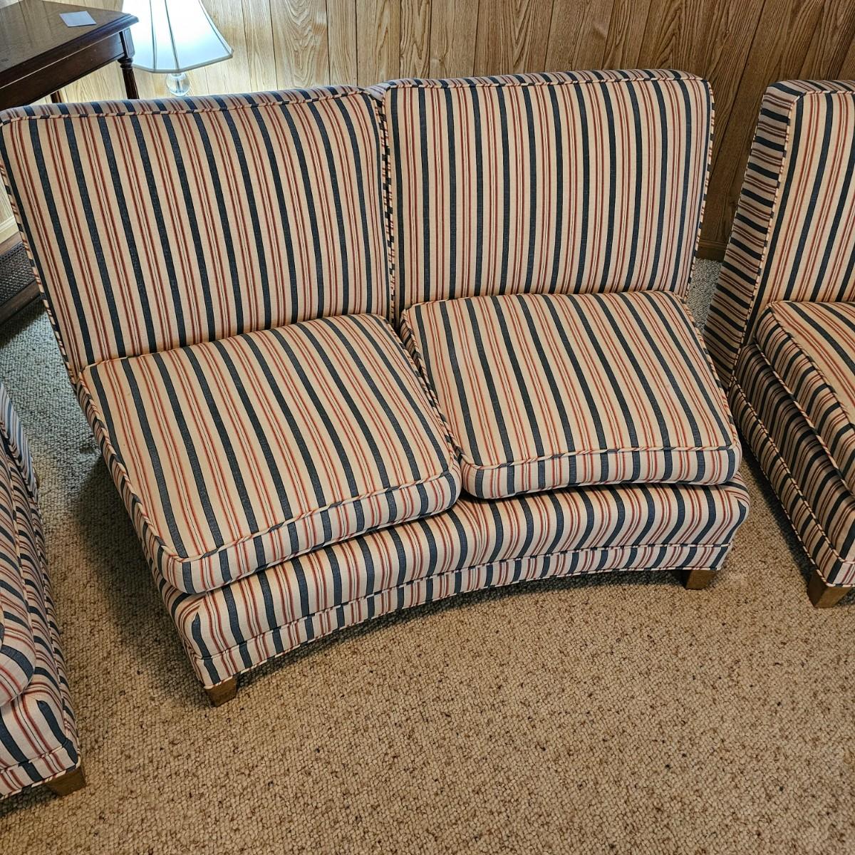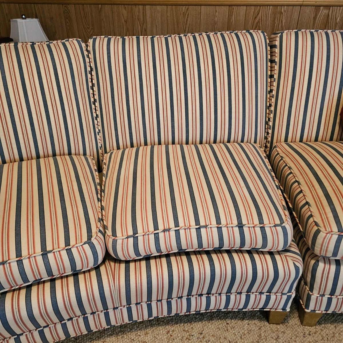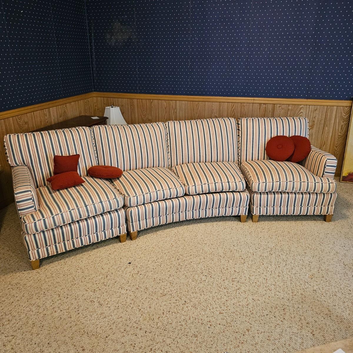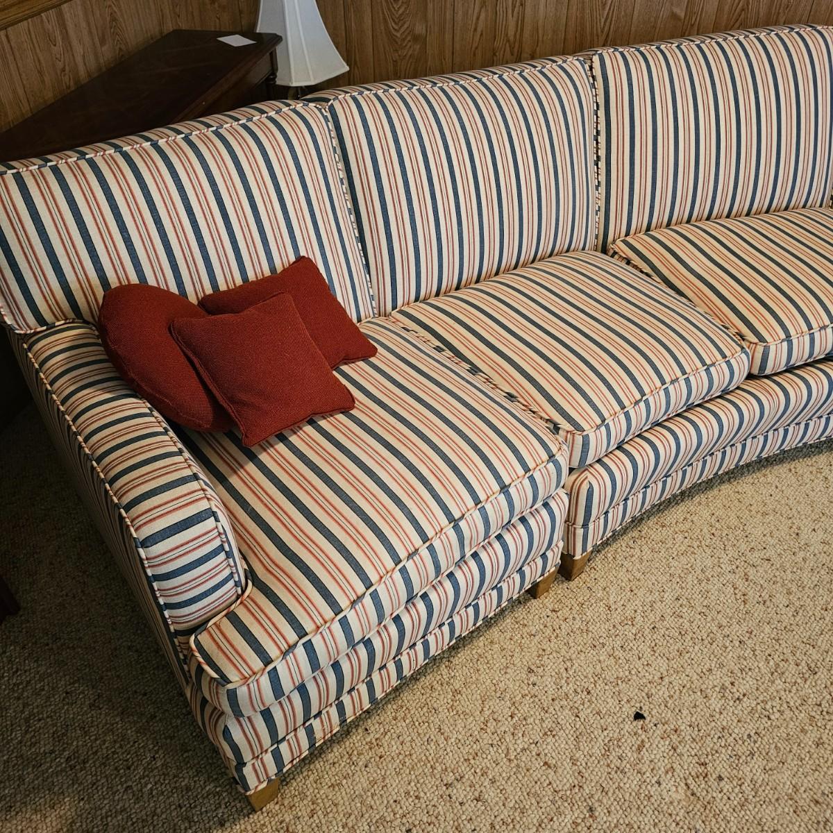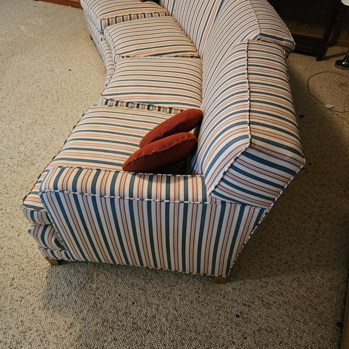Blue and red striped fabric highlight this three piece curved sectional unit. One center section and two ends along with five small accent pillows. Entire unit measures 114" x 37" x 30"H, has 16" seat height. Wooden pedestal feet. See photos for details. Local pickup only. Winning bidder must bring assistance to help move and load this item due to its weight and/or size.