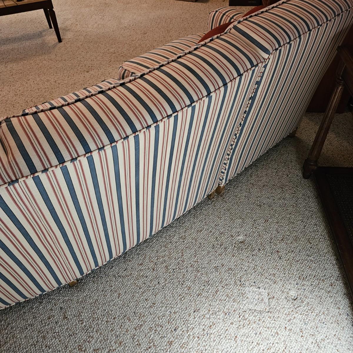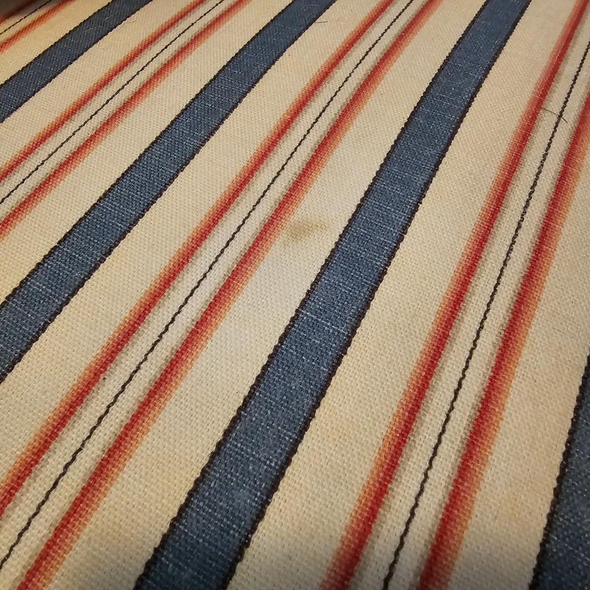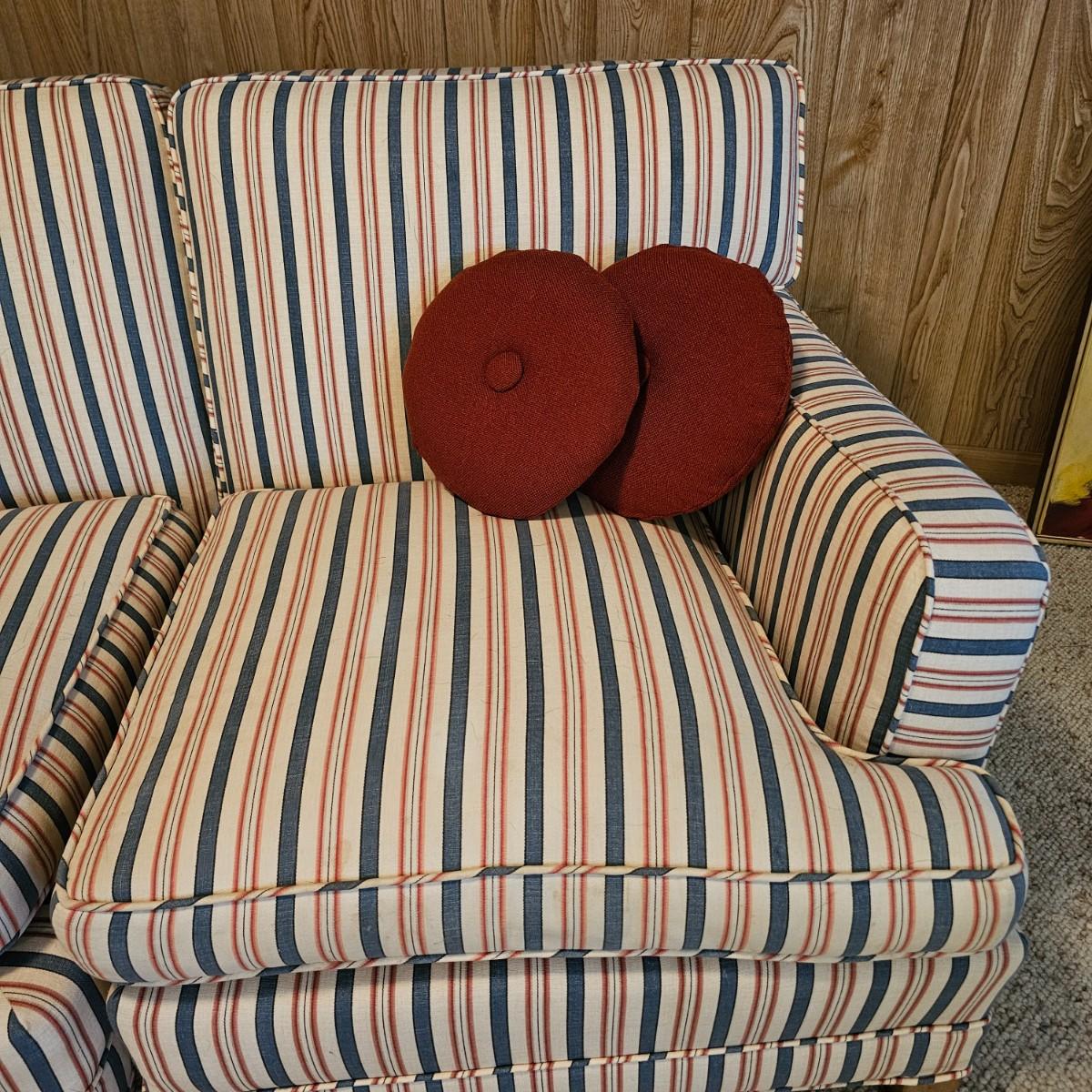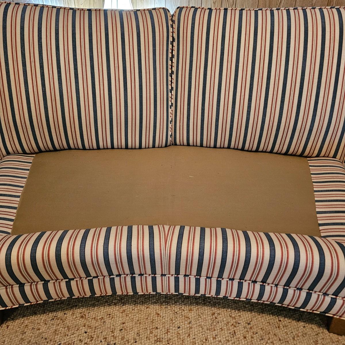 Blue and red striped fabric highlight this three piece curved sectional unit. One center section and two ends along with five small accent pillows. Entire unit measures 114" x 37" x 30"H, has 16" seat height. Wooden pedestal feet. See photos for details. Local pickup only. Winning bidder must bring assistance to help move and load this item due to its weight and/or size.