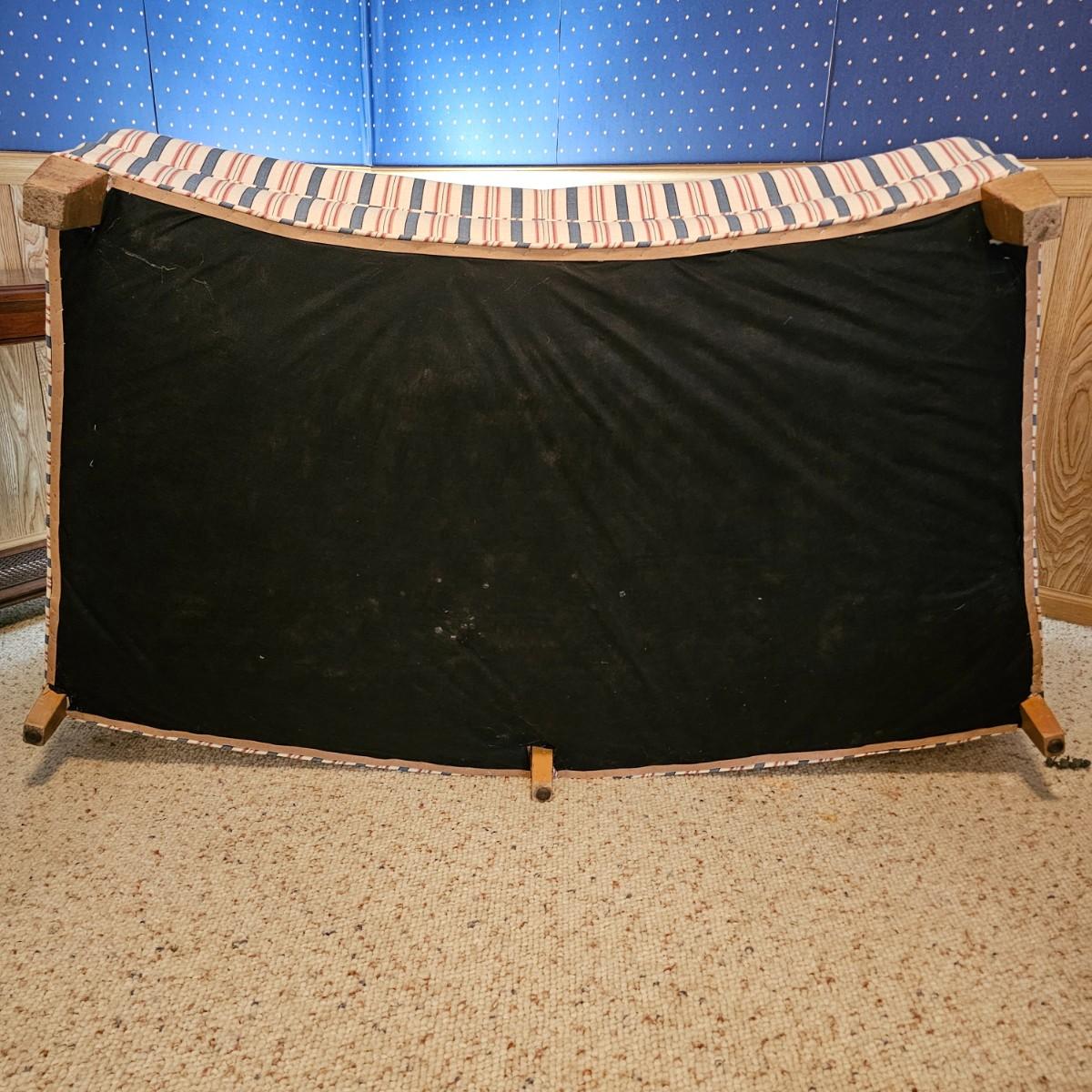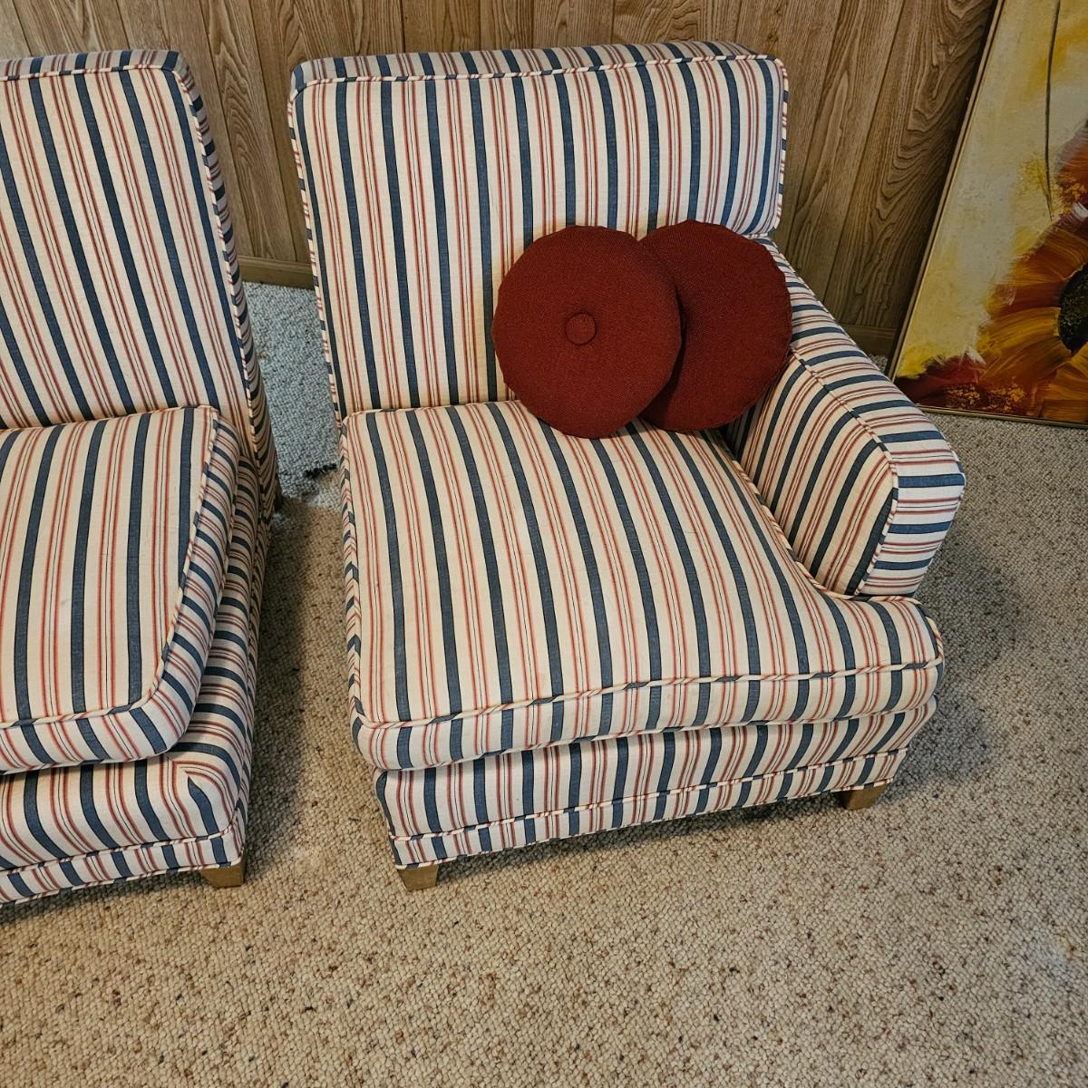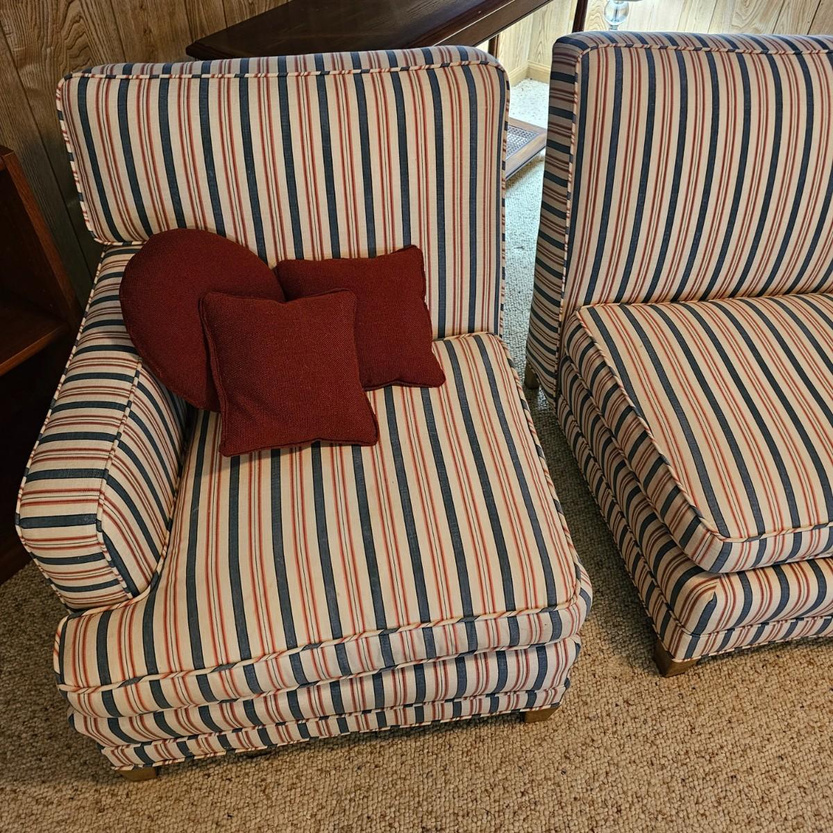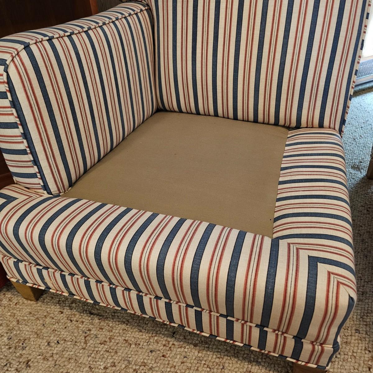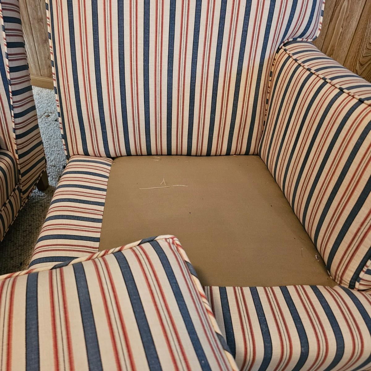 Blue and red striped fabric highlight this three piece curved sectional unit. One center section and two ends along with five small accent pillows. Entire unit measures 114" x 37" x 30"H, has 16" seat height. Wooden pedestal feet. See photos for details. Local pickup only. Winning bidder must bring assistance to help move and load this item due to its weight and/or size.