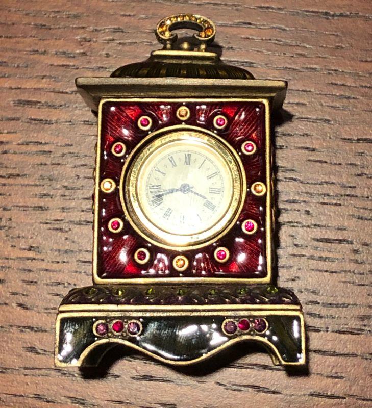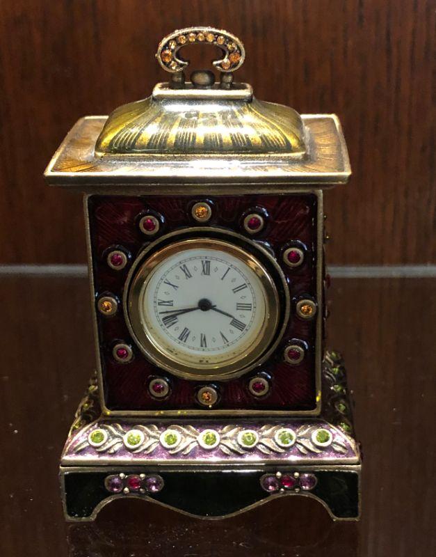 Nice condition miniature Jay Strongwater clock. No missing crystals. Needs battery. 3” tall x 2” wide.