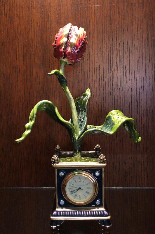 Excellent condition Jay Strongwater Tulip Clock, no missing crystals. Original box, bag and literature. 8.5” tall x 5.5” wide x 3” deep.