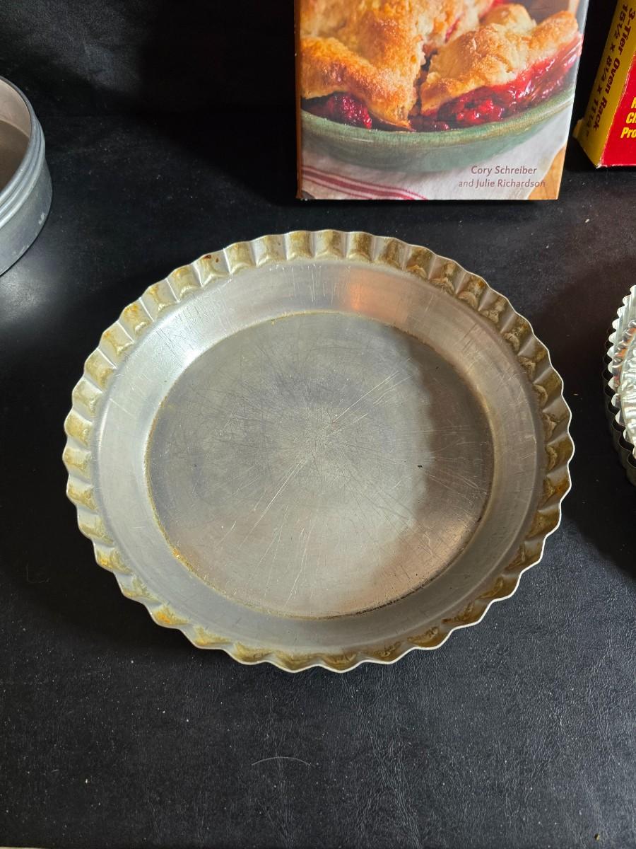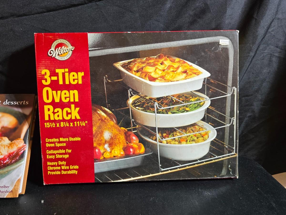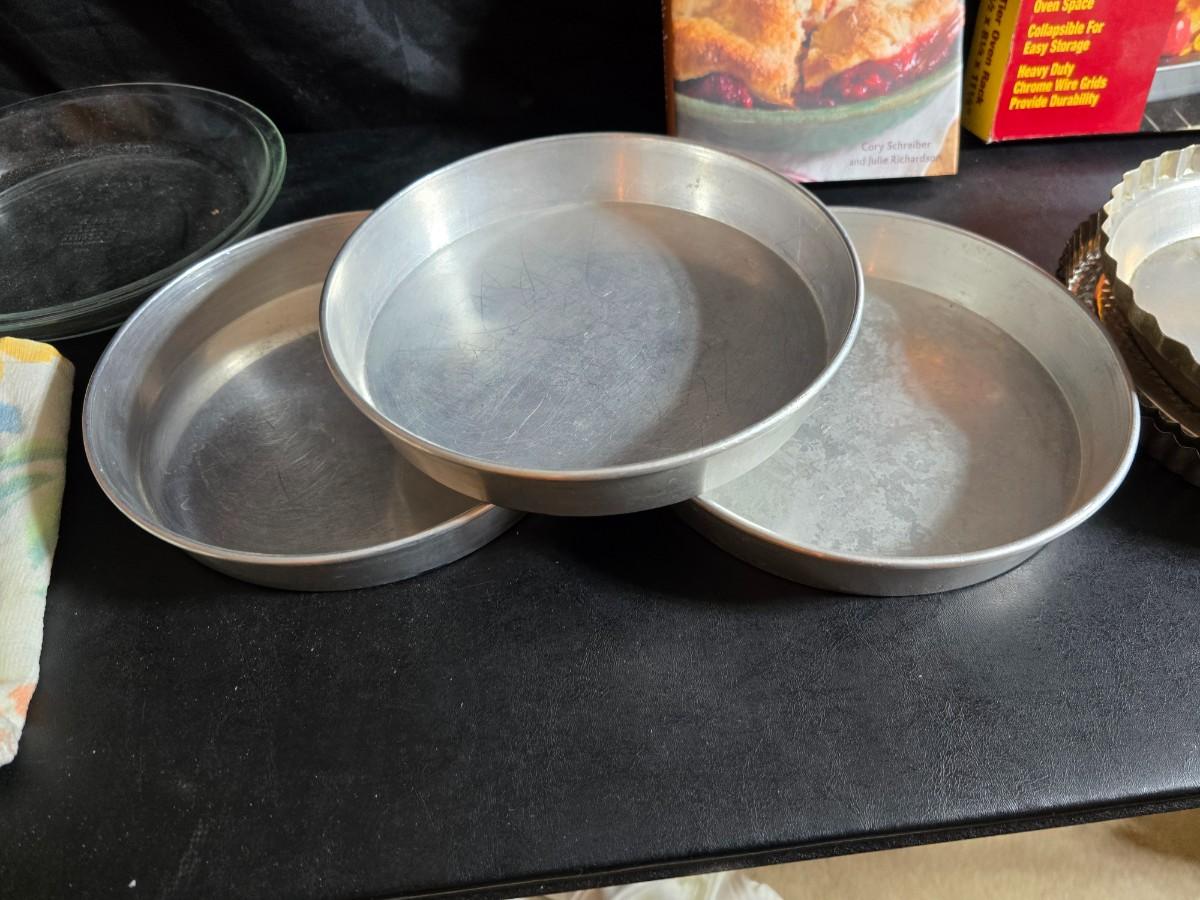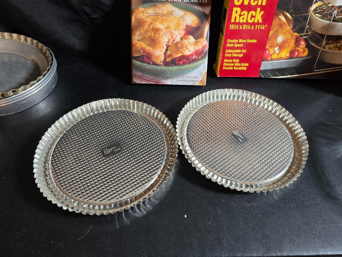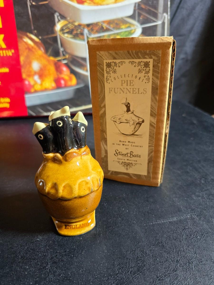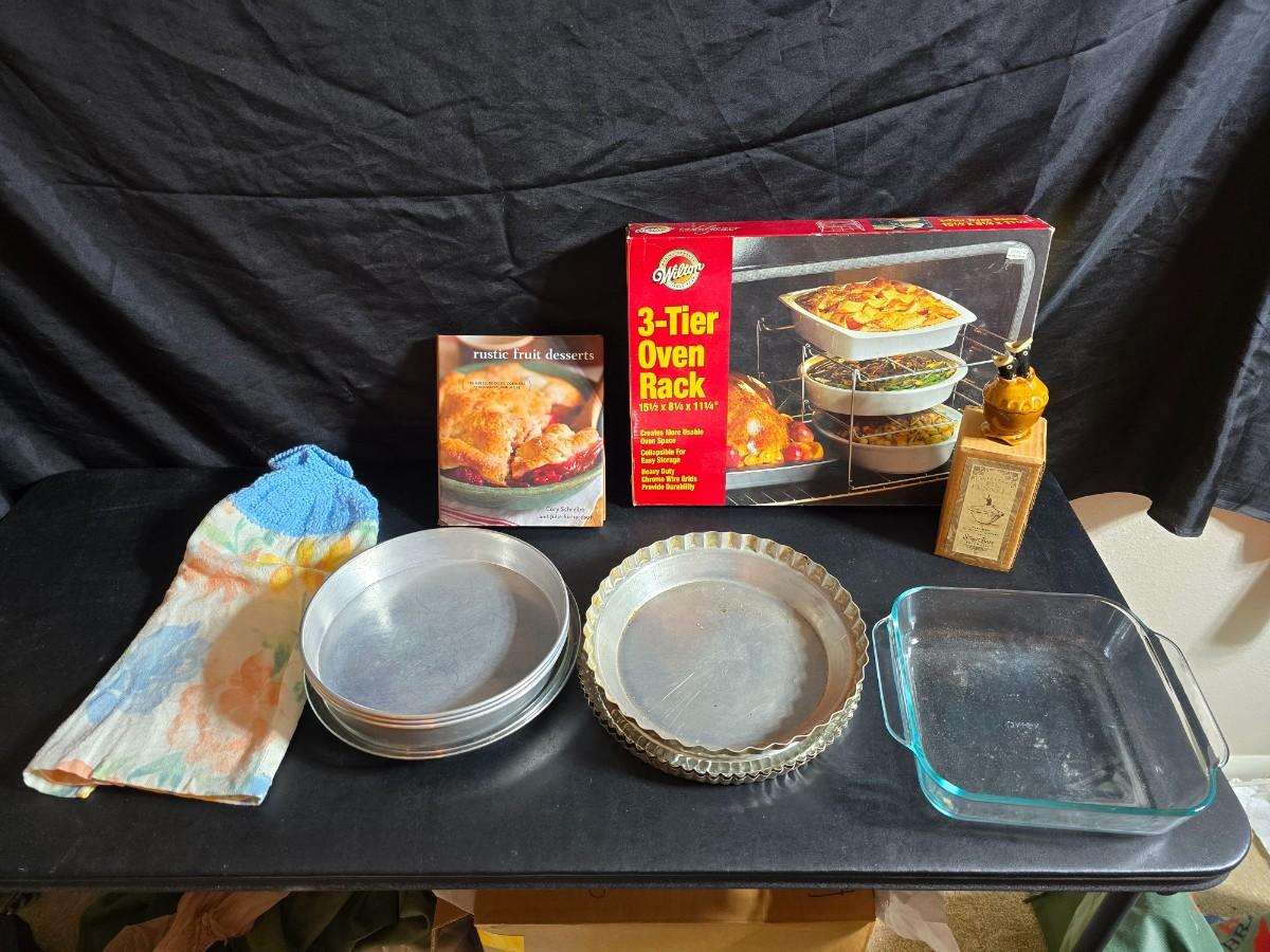 Stuart Bass three-blackbird pie funnel - Wilton 3-tier baking rack - a variety of pie pans and a cookbook