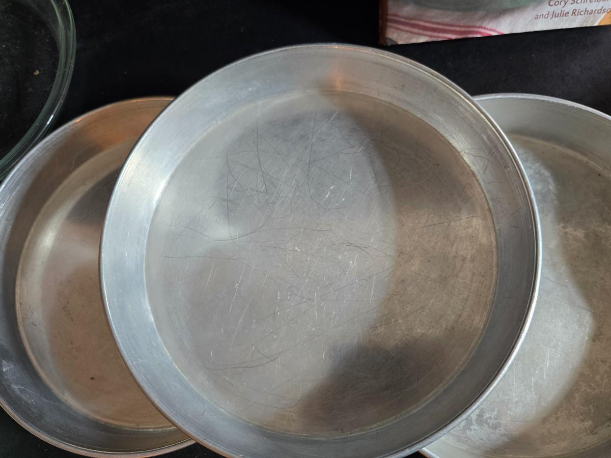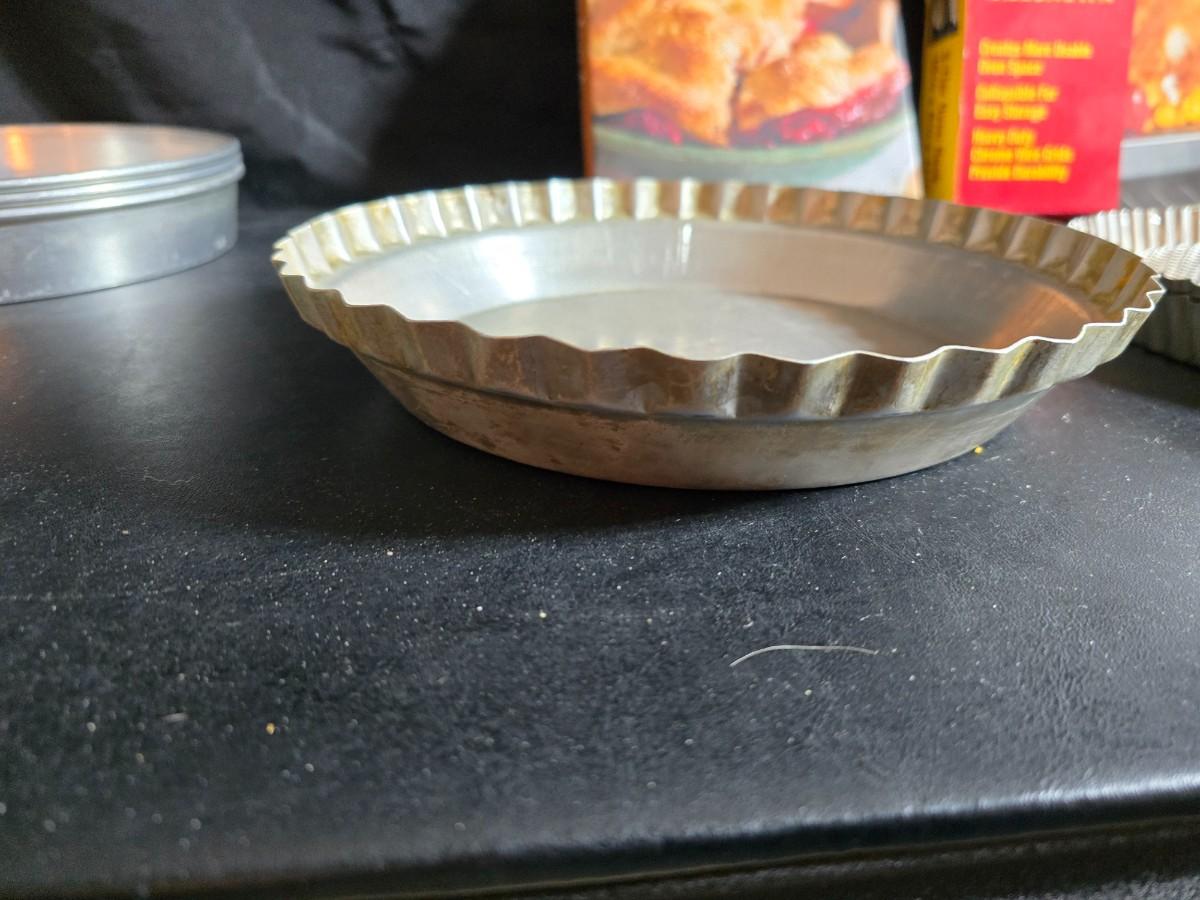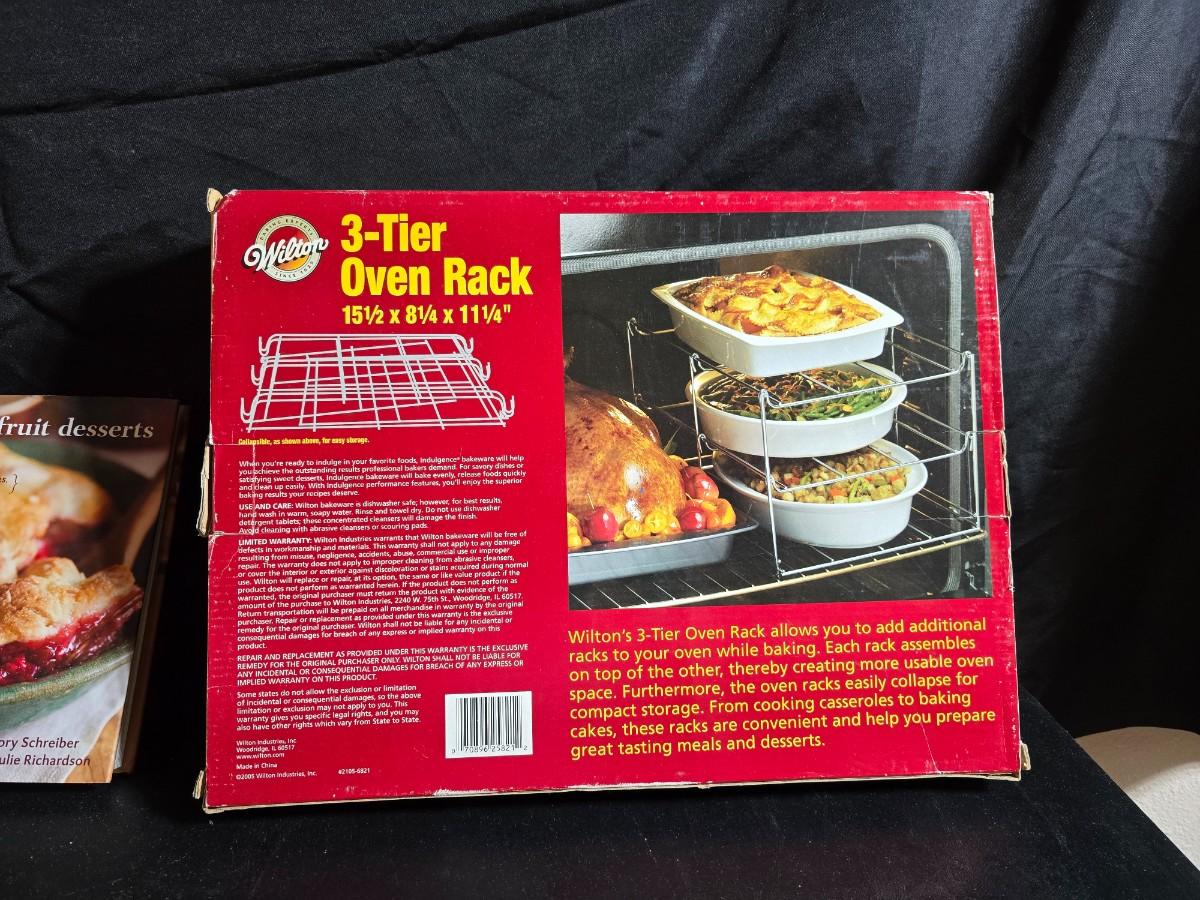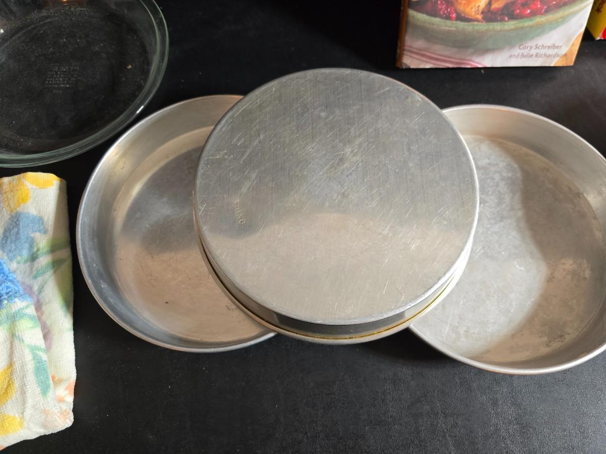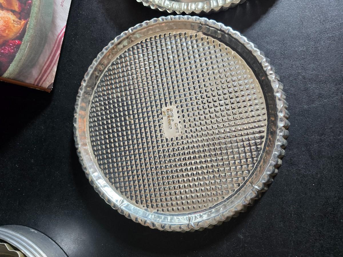 Stuart Bass three-blackbird pie funnel - Wilton 3-tier baking rack - a variety of pie pans and a cookbook