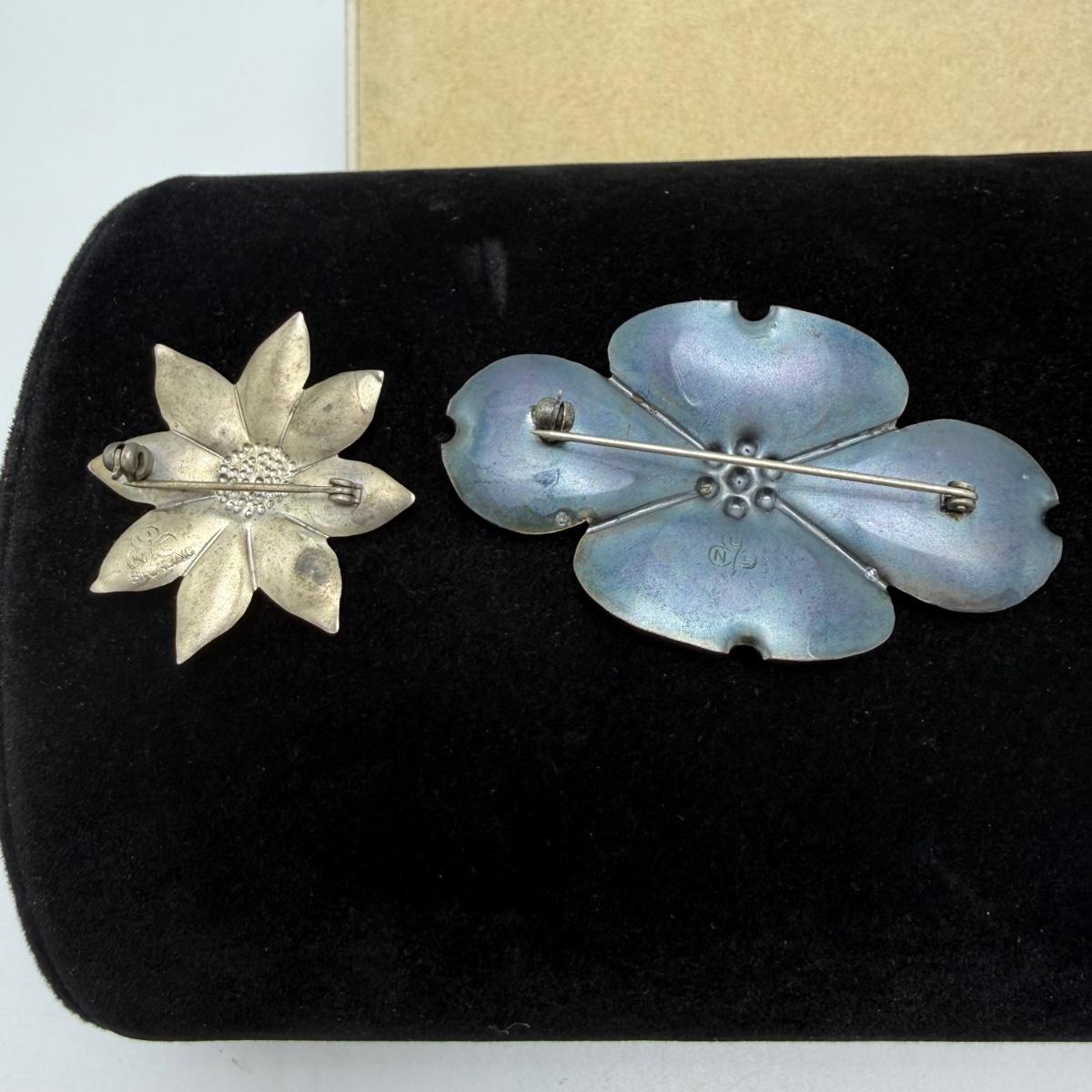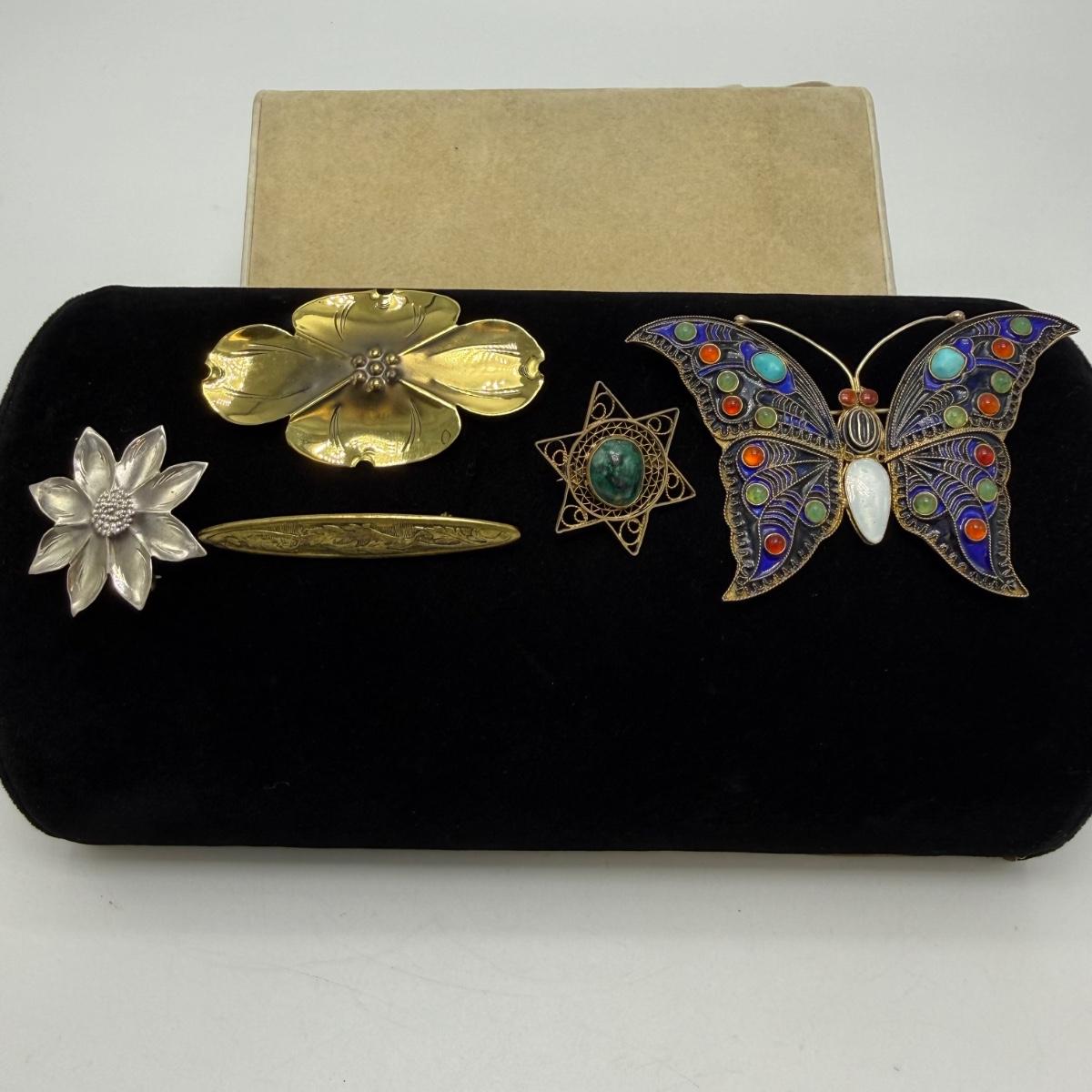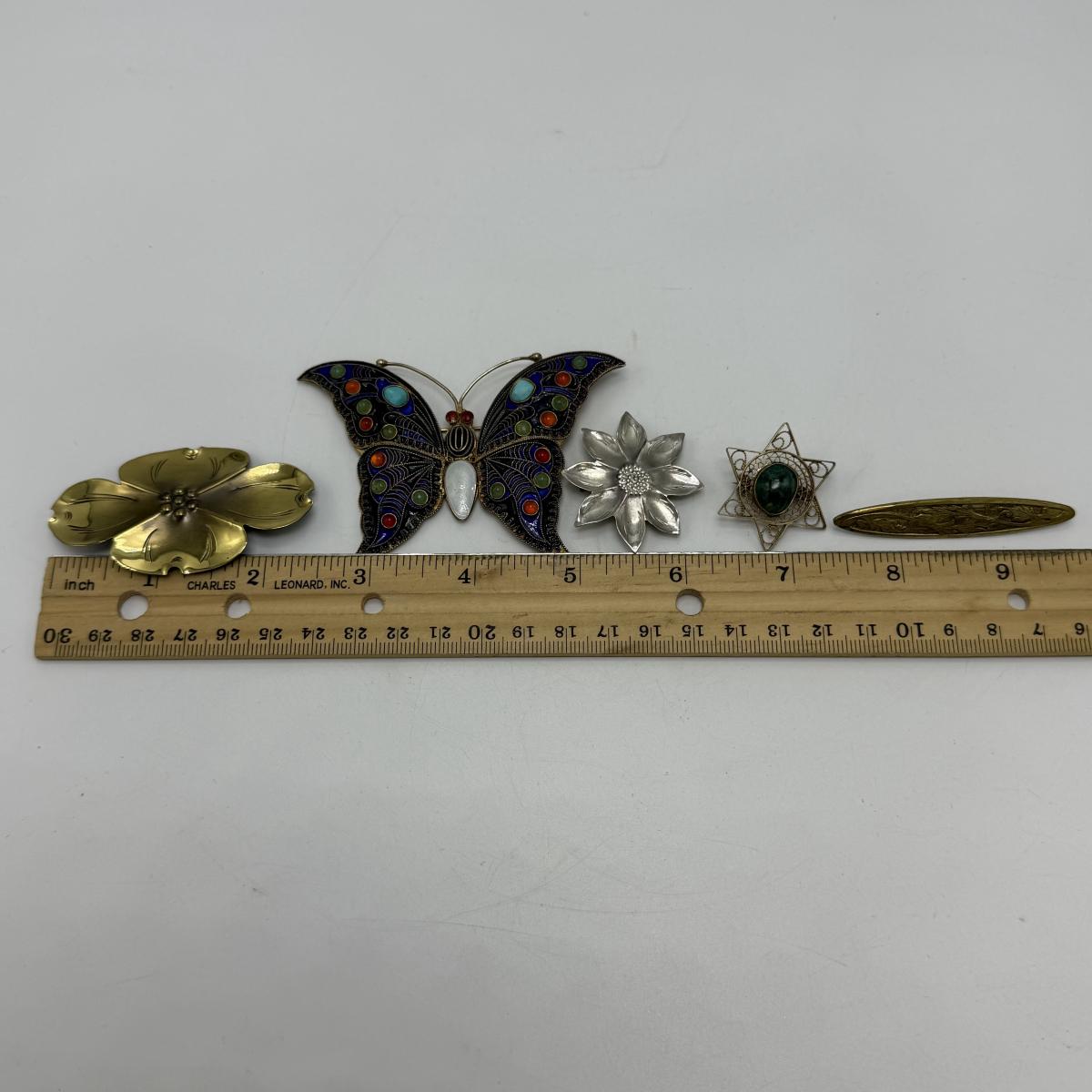 Stunning butterfly brooch stamped MMA (Museum of Modern Art), 925 and more. Two Stuart Nye brooches, the smaller one is marked Sterling. Lot holds two more brooches: a 925 stamped filigree Star of David and an unmarked long oval with leaves. See images. All sales are final. No returns or refunds. Please bid accordingly. Shipping available.