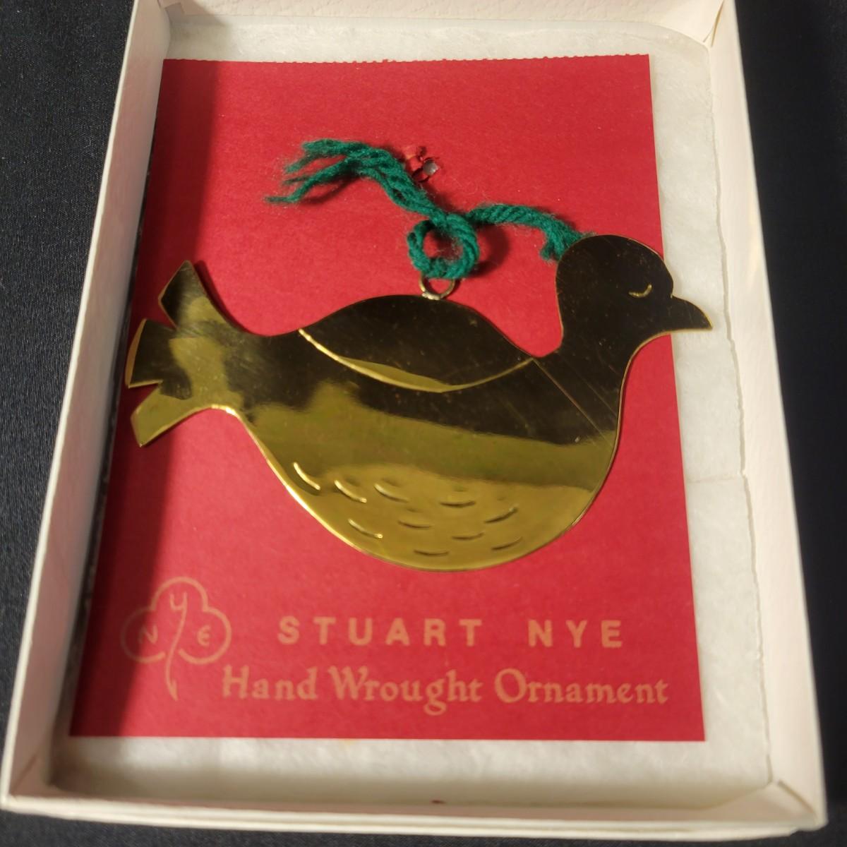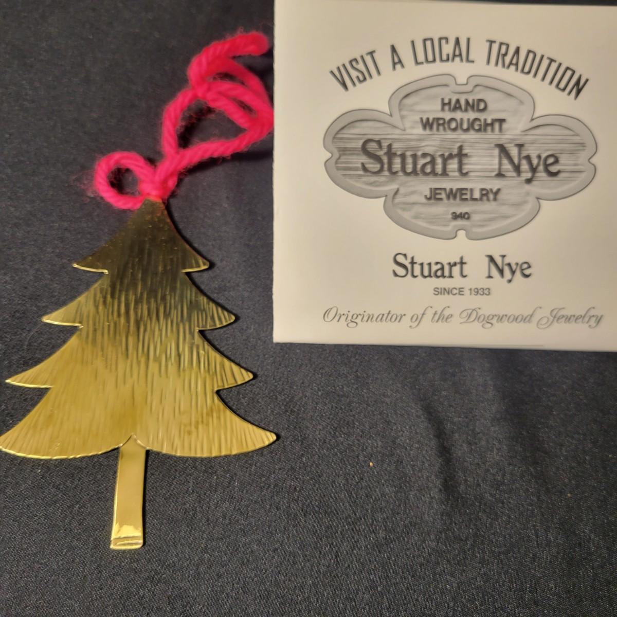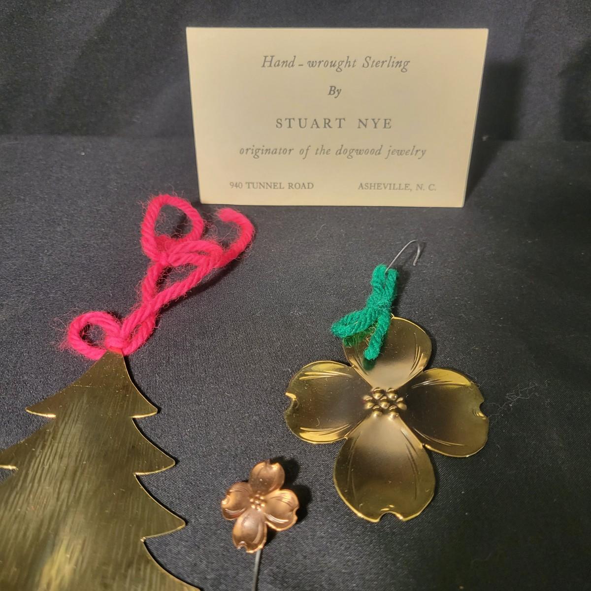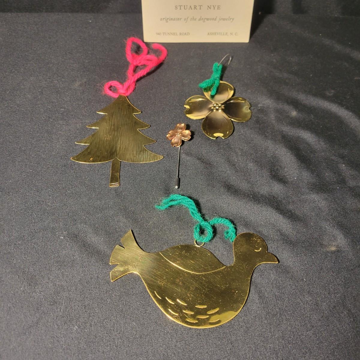 A collection ornaments and stick pin by local Asheville artist Stuart Nye. All four pieces are in excellent condition. Included is a dogwood stick pin made of copper and the stem and tip are nickle silver. Also included are three ornaments. A dove, a dogwood bloom and a Christmas tree made of what appears to be a brass like metal. Dove ornament measures approximately 4.5" x 3.5" Shipping available