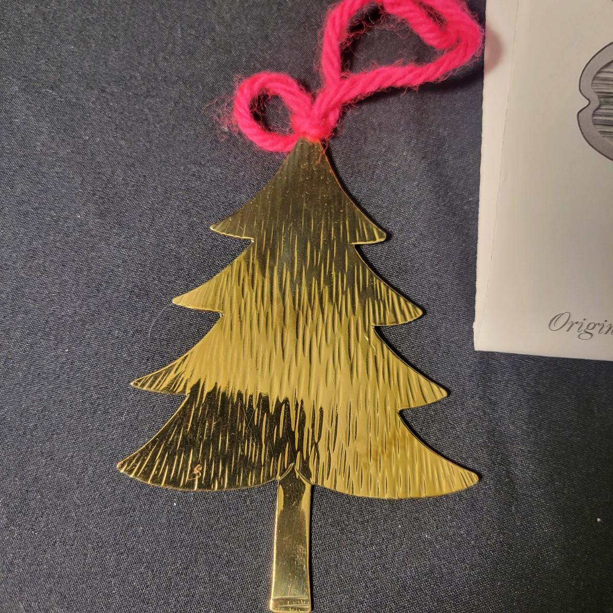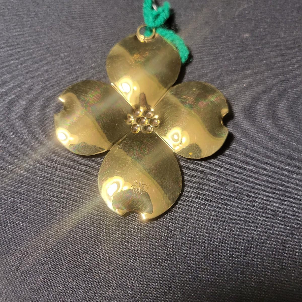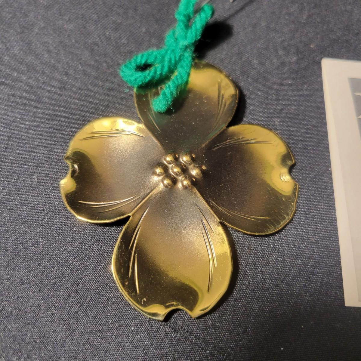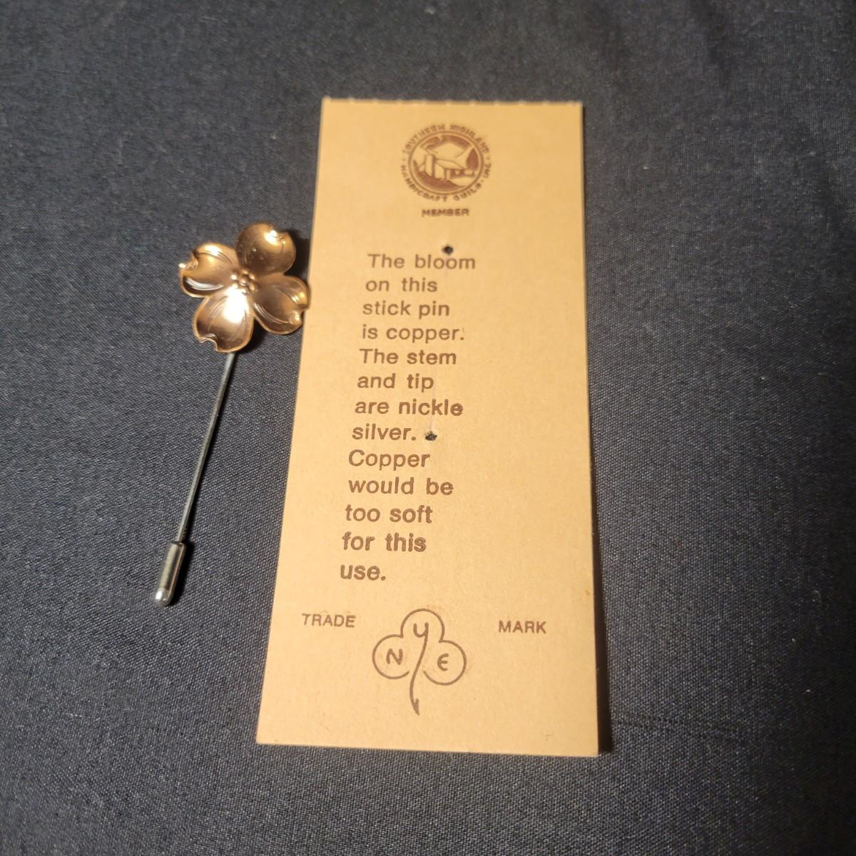 A collection ornaments and stick pin by local Asheville artist Stuart Nye. All four pieces are in excellent condition. Included is a dogwood stick pin made of copper and the stem and tip are nickle silver. Also included are three ornaments. A dove, a dogwood bloom and a Christmas tree made of what appears to be a brass like metal. Dove ornament measures approximately 4.5" x 3.5" Shipping available