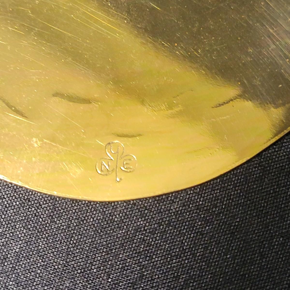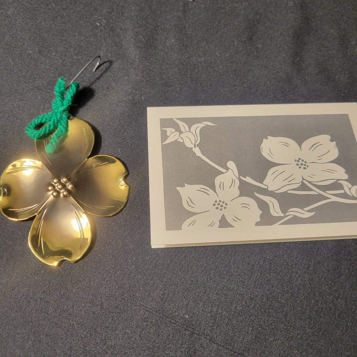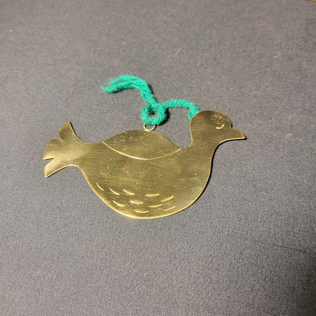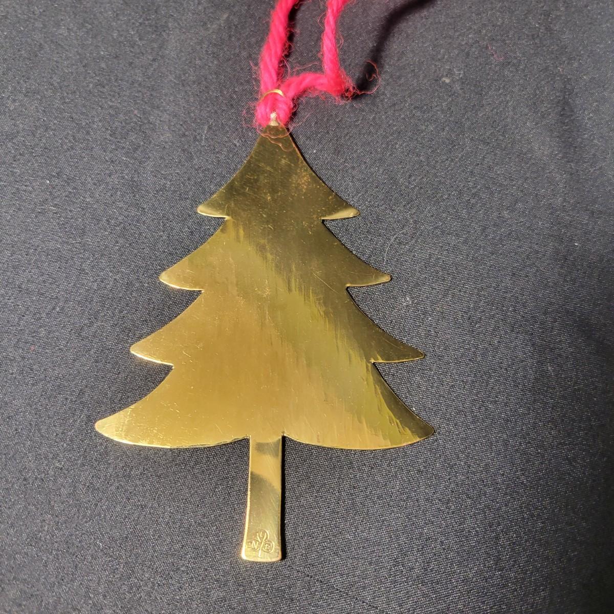 A collection ornaments and stick pin by local Asheville artist Stuart Nye. All four pieces are in excellent condition. Included is a dogwood stick pin made of copper and the stem and tip are nickle silver. Also included are three ornaments. A dove, a dogwood bloom and a Christmas tree made of what appears to be a brass like metal. Dove ornament measures approximately 4.5" x 3.5" Shipping available