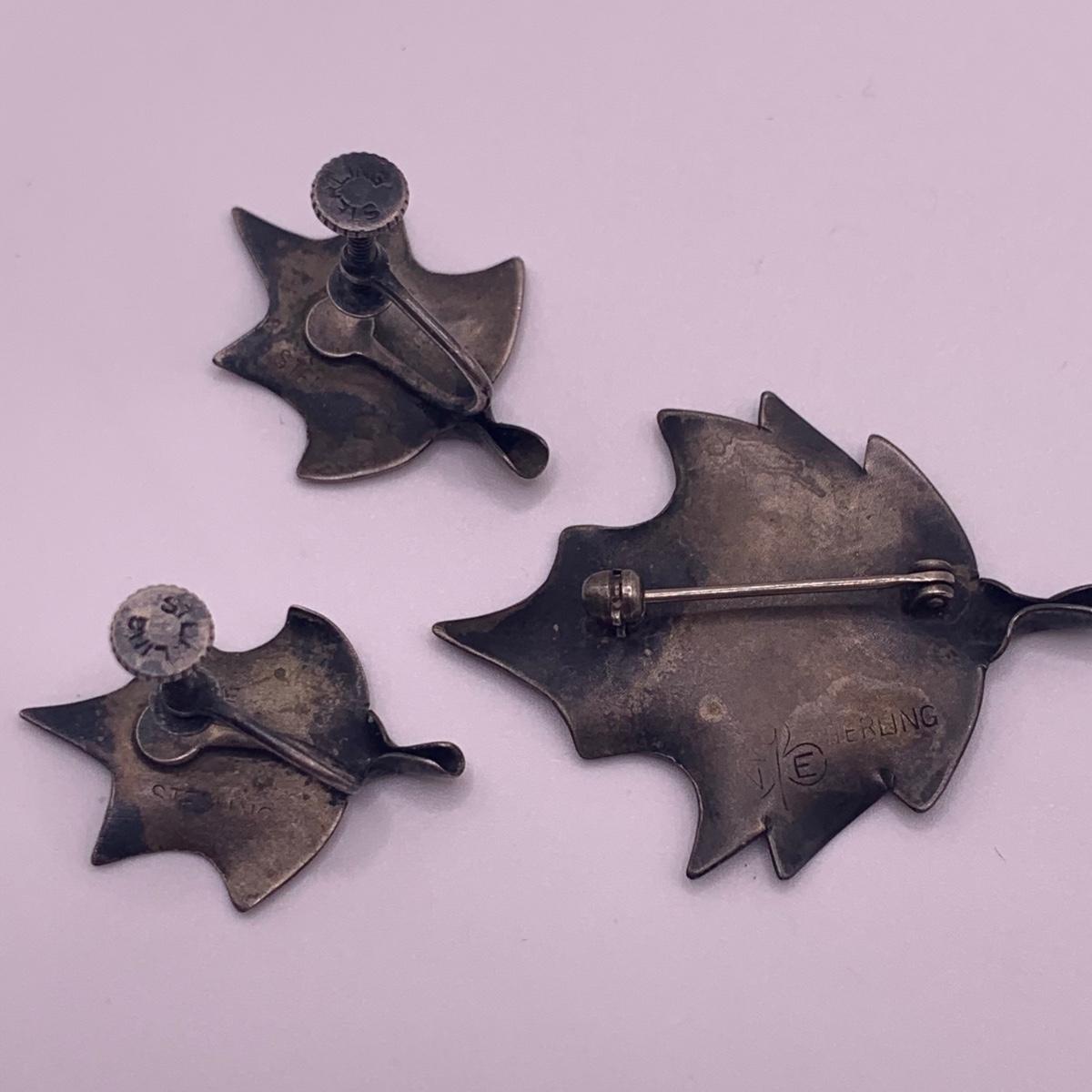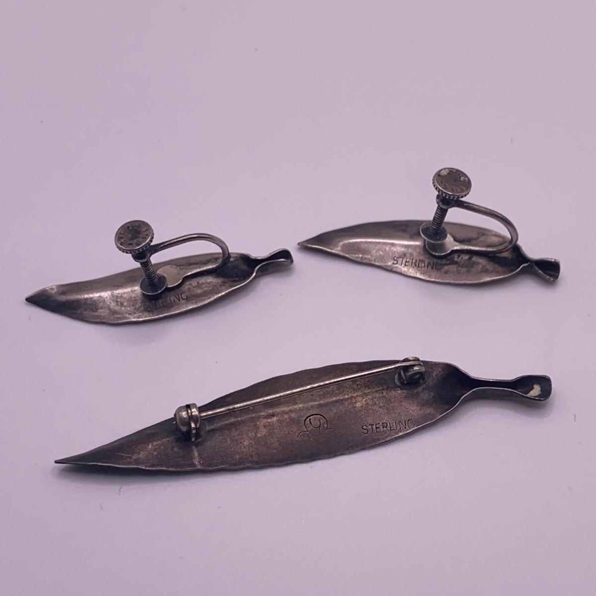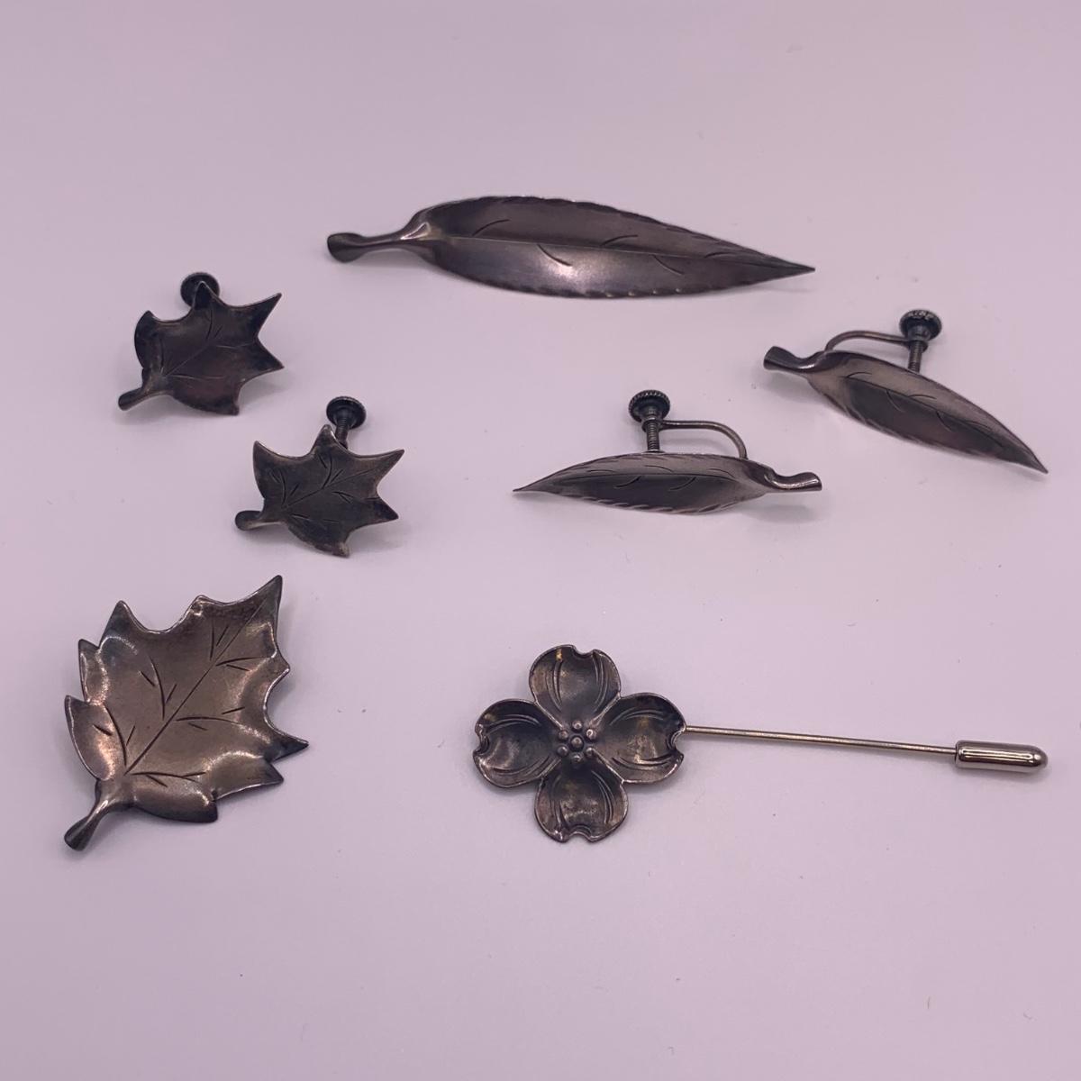 This Stuart Nye sterling silver jewelry collection includes two leaf sets, each with a pin and screw-on earrings, as well as one dogwood pin. For reference, the dogwood pin is 2.5” long.