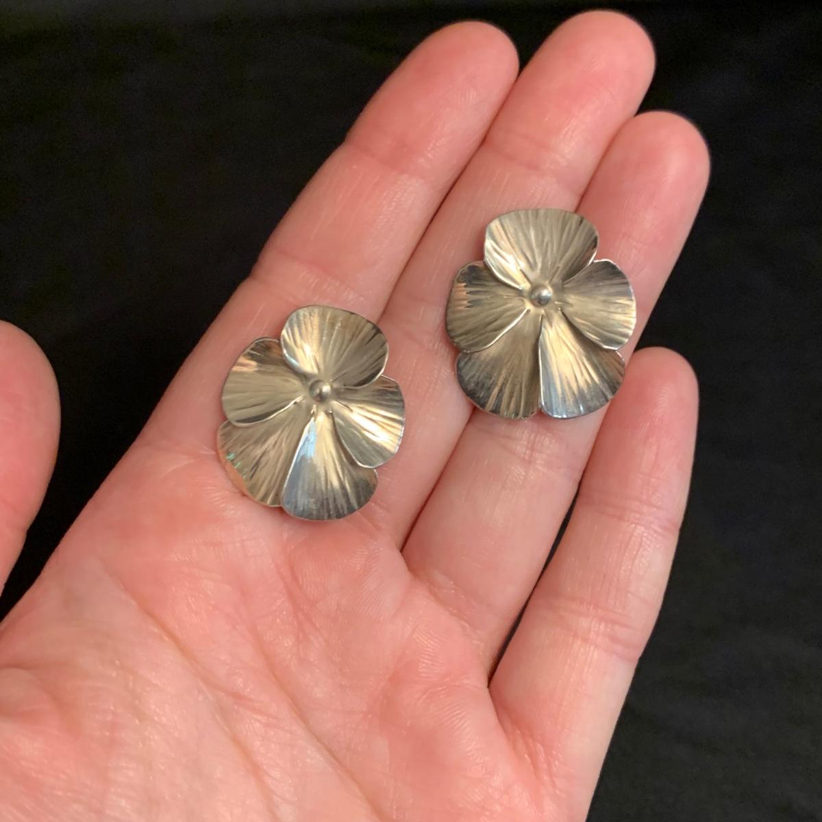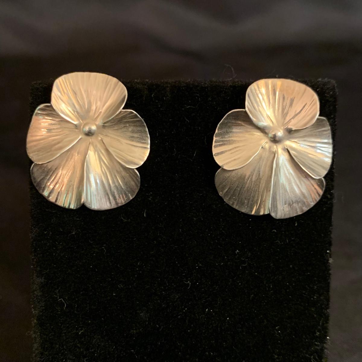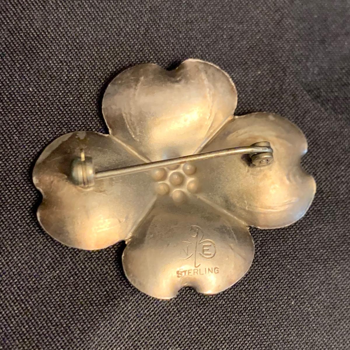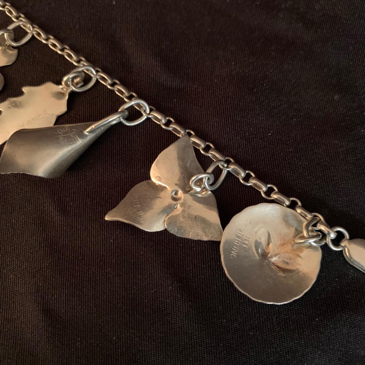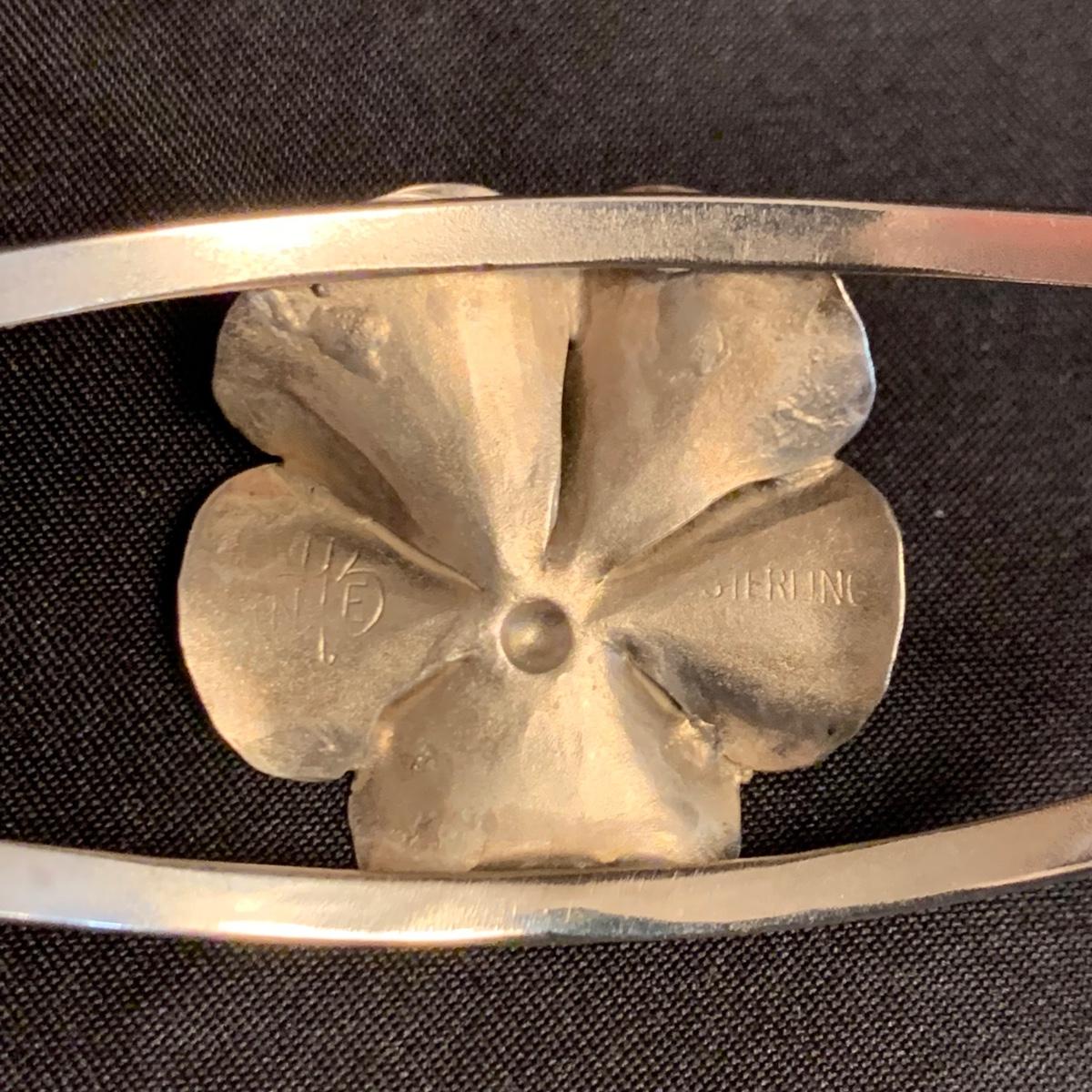 In this collection of Stuart Nye Sterling silver jewelry there is one pair of stud earrings for pierced ears, two pins, one cuff bracelet, and one charm bracelet with nine botanical charms. All items are marked “˜Nye’ and “˜Sterling’, except for the smaller straight pin which has no markings visible. The charm bracelet is 7.5” long. The earrings don’t have backs included.
