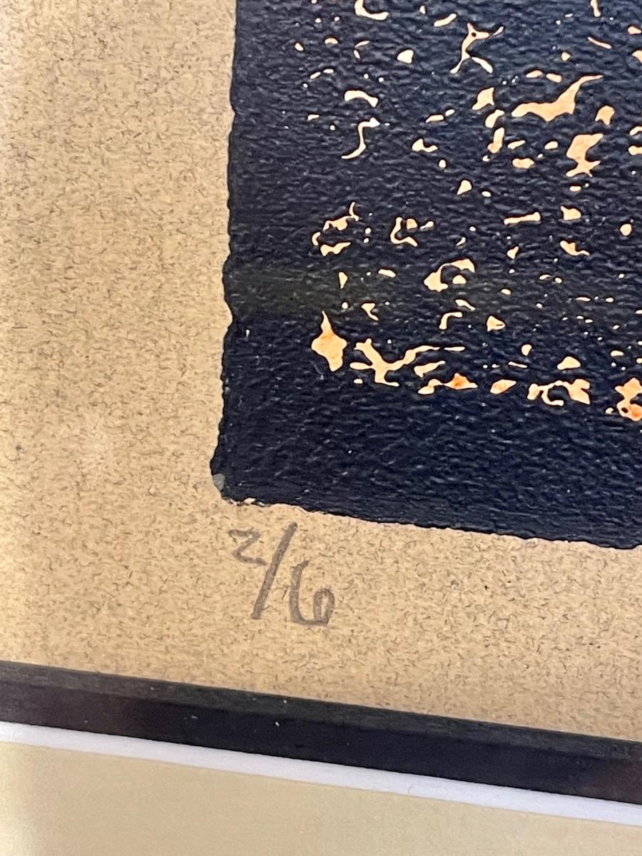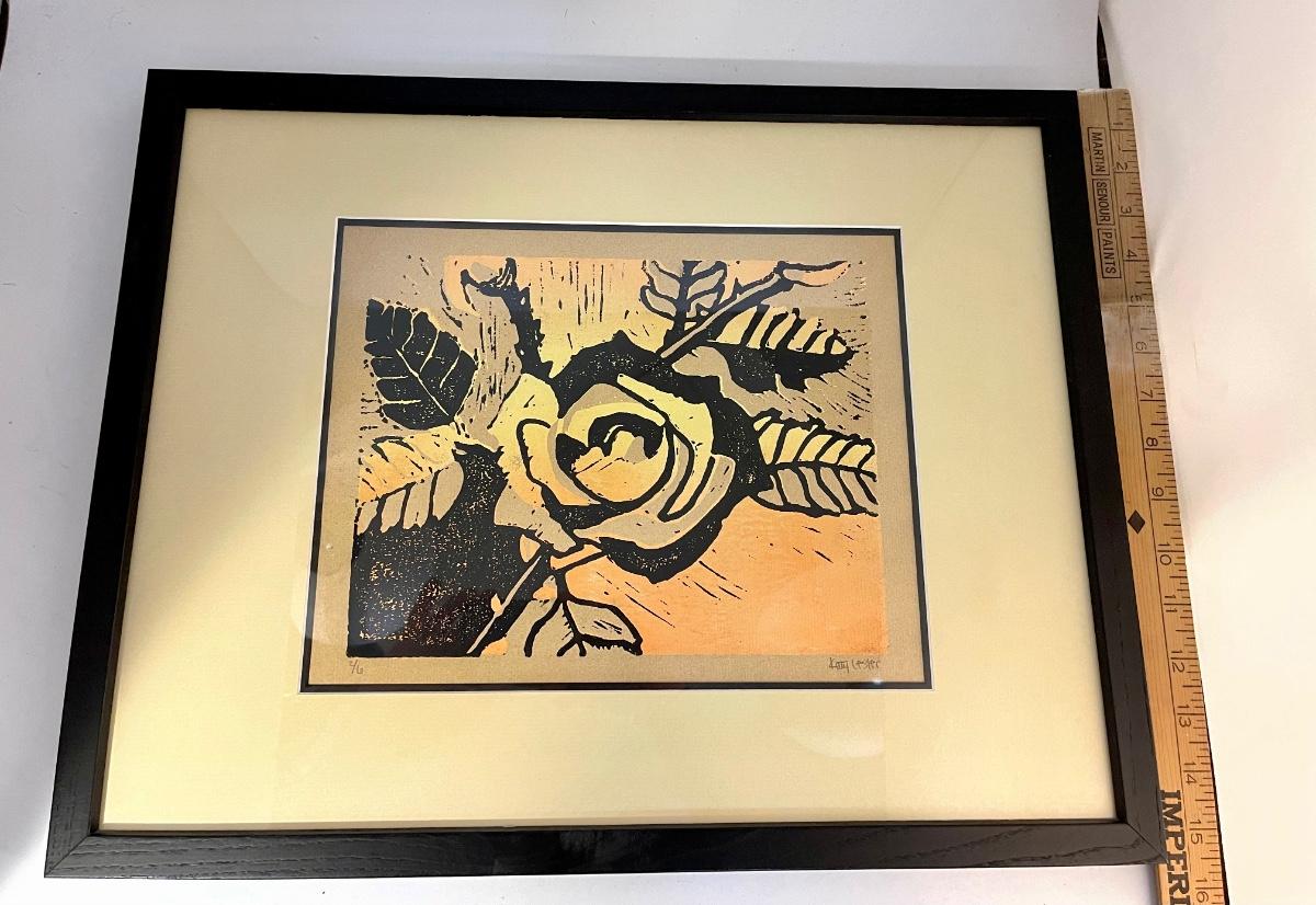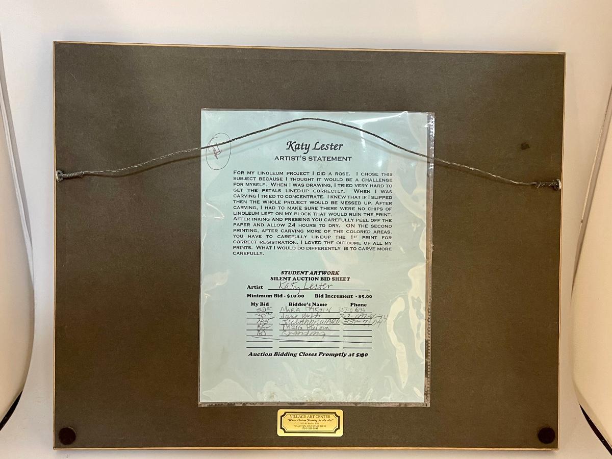 Vintage Student Artist Linoleum Stamped Rose Framed Art Silent Auction #2/6