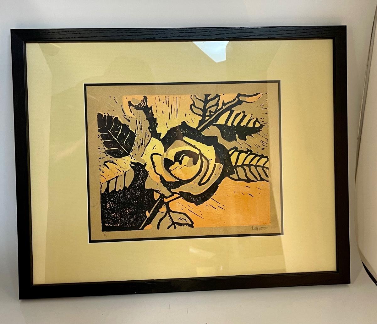 Vintage Student Artist Linoleum Stamped Rose Framed Art Silent Auction #2/6. In good condition.
