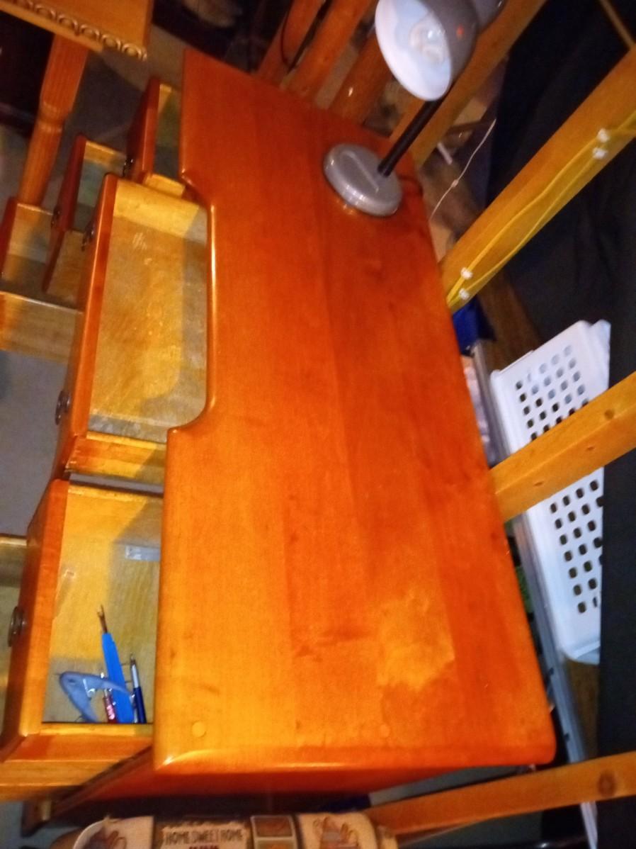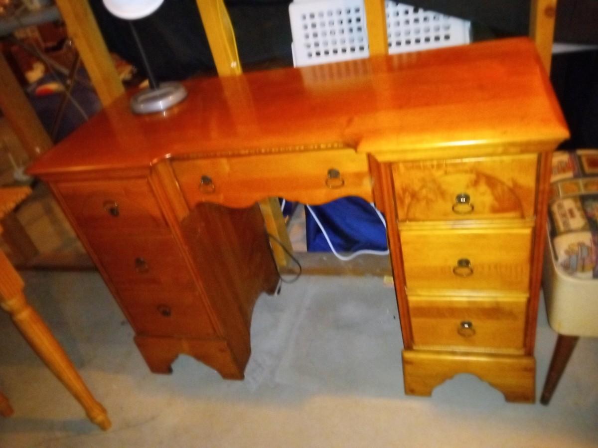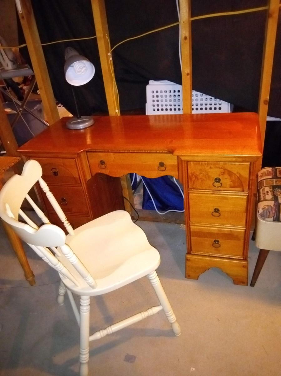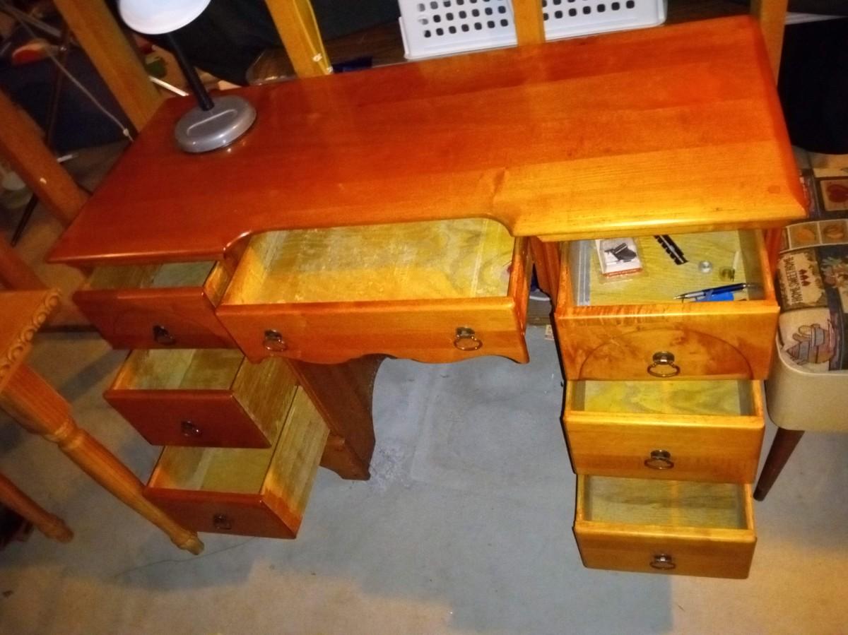 7 DRAWER DESK 48" X 18" X 30" IN GOOD SHAPE, THE CHAIR COULD USE A COAT OF PAINT
